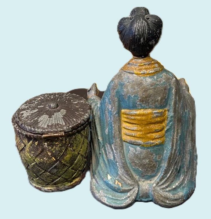This geisha girl figural inkwell is an example of cold-painted spelter from the late 19th or early 20th century, a period when Japonisme (the influence of Japanese art on Western culture) was highly fashionable.
