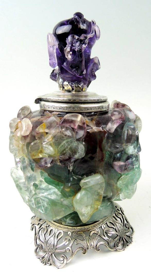 This gemstone inkwell with sterling silver base, mounts, and insert features a carved fluorite gemstone body with a carved amethyst lid. It is marked “Edward I. Farmer / New York”.