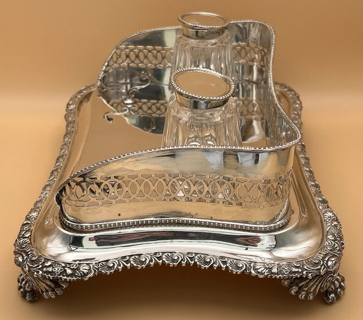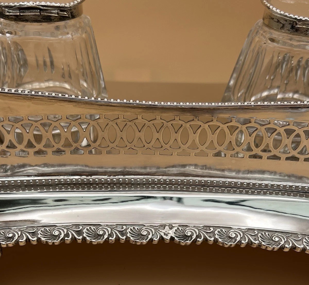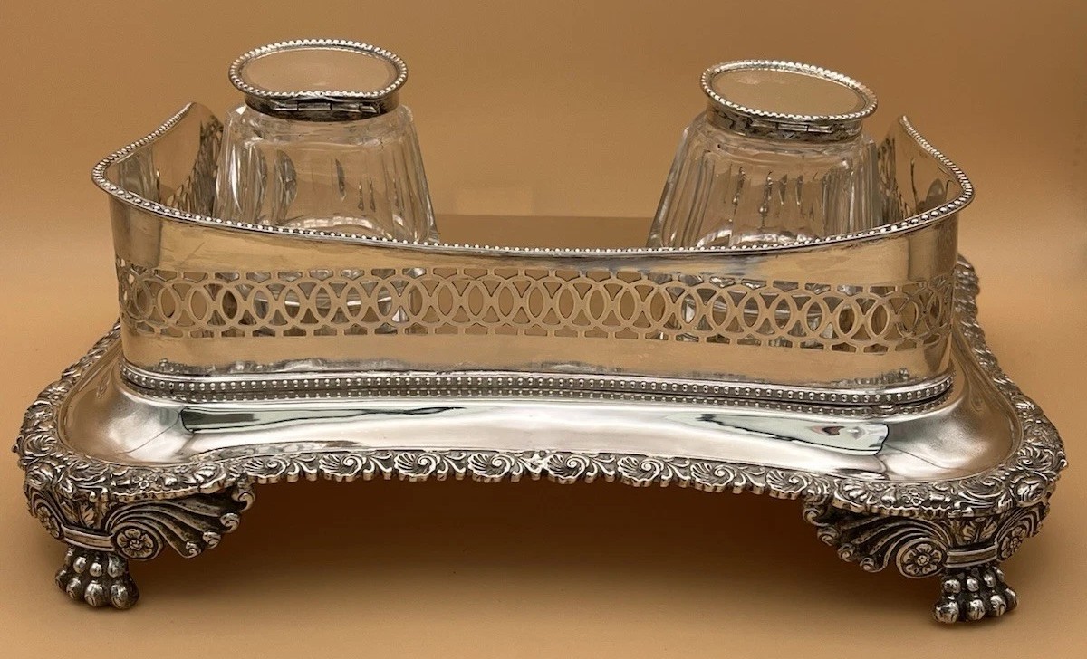 This is a solid silver double inkstand (or standish) made during the British Regency period, officially marked for the final years of the reign of King George III.