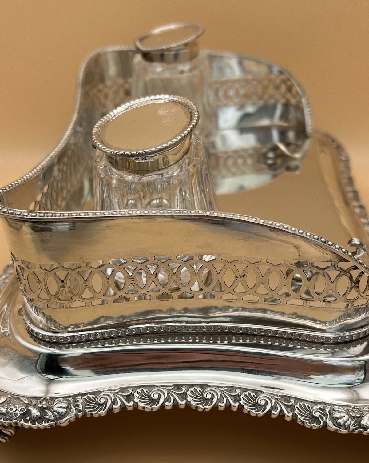 | Galleried Rail | Pierced and Beaded Gallery. A three-sided vertical barrier or “gallery” runs along the back and sides of the inkstand, terminating at the front in the pen rest. It is decorated with intricate piercing and defined by parallel rows of beaded decoration along the top and bottom edges. | The pierced gallery is typical of silver desk stands, preventing pens or wafers from rolling off and adding high-end detailing. |