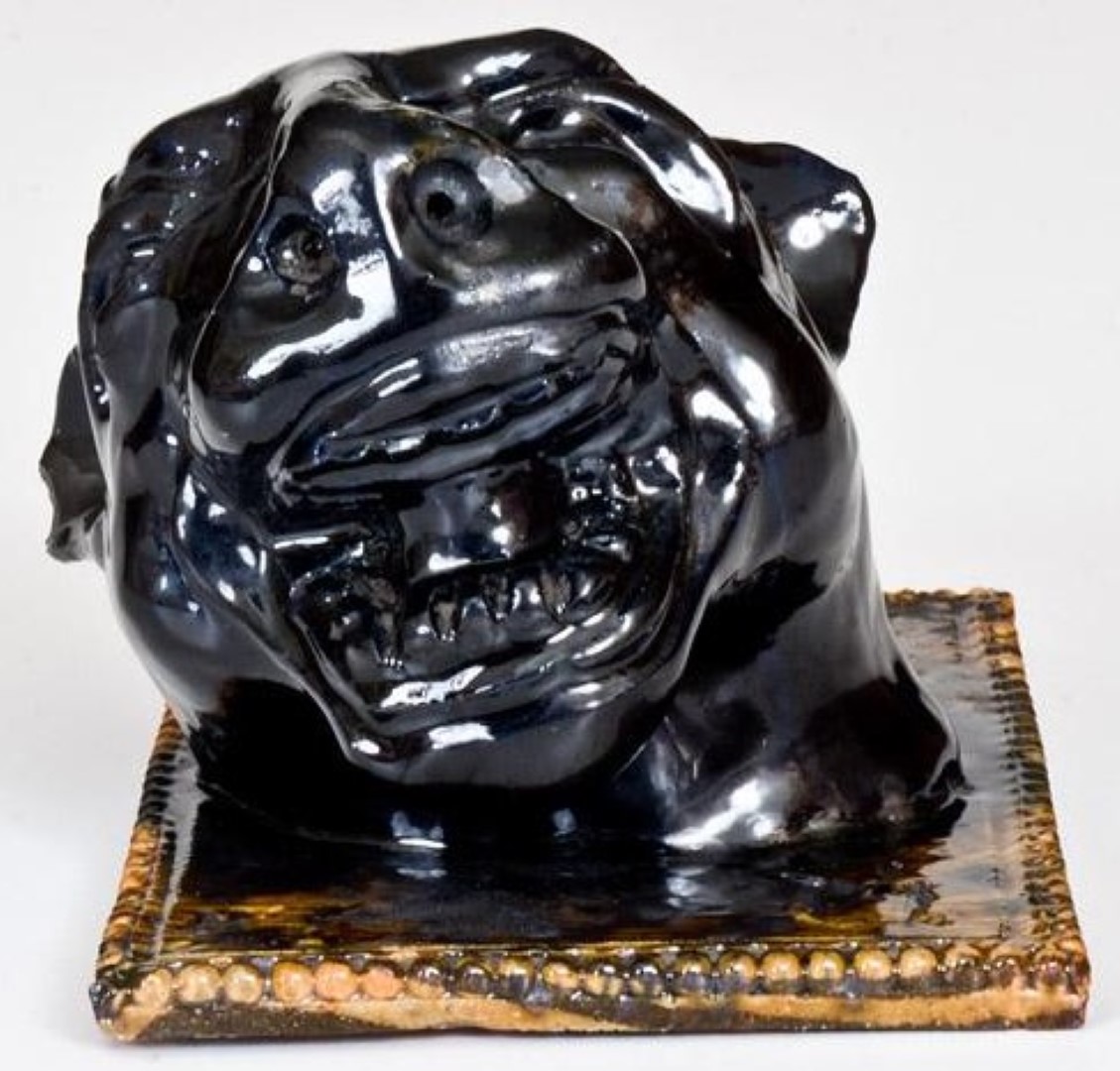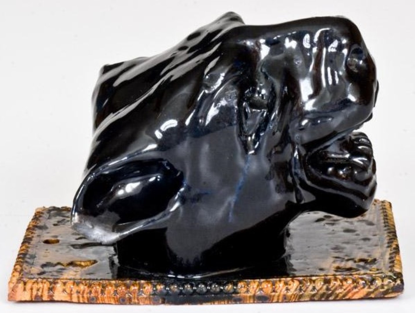 George Ohr pottery cougar inkwell – molded, blackish-blue-glazed sculpture of a cougar’s head with slightly turned head and open mouth bearing teeth; the head is affixed to a pierced, scroddled-clay slab with coggled edge and impressed leaf motifs at the corners. Original hole to ink reservoir is carved on the side of the cougar’s head.