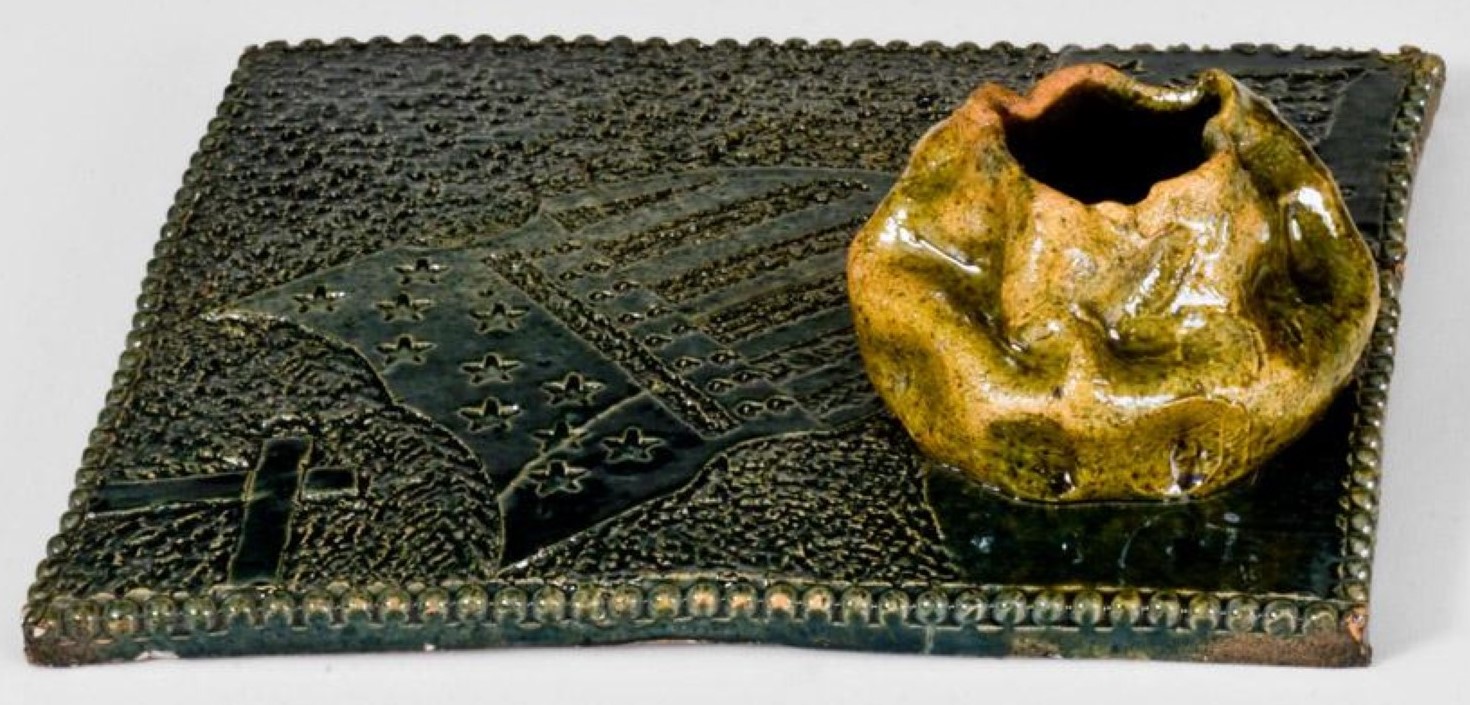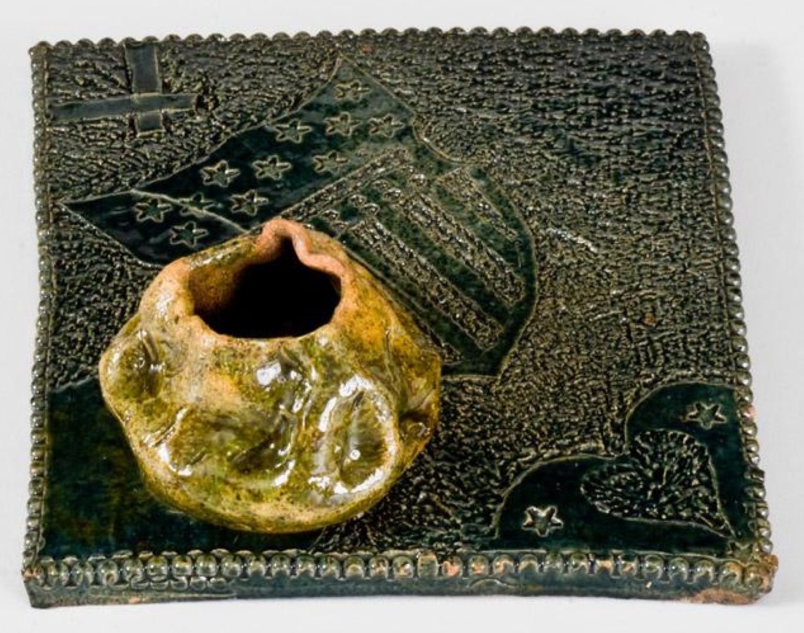 George Ohr pottery inkwell with Federal shield and heart motifs, Stamped “GEO E OHR / BILOXI MISS”, circa 1895-1900, green-glazed inkwell with crumpled and dimpled form, seated atop a blue-glazed, slab base with coggled edge, featuring rare incised designs of a Federal shield with impressed stars, a heart flanked by impressed stars, and a ribbon. An outstanding example of Ohr’s creative genius, combining his distinctive, contorted vessel style with outstanding incised decoration.