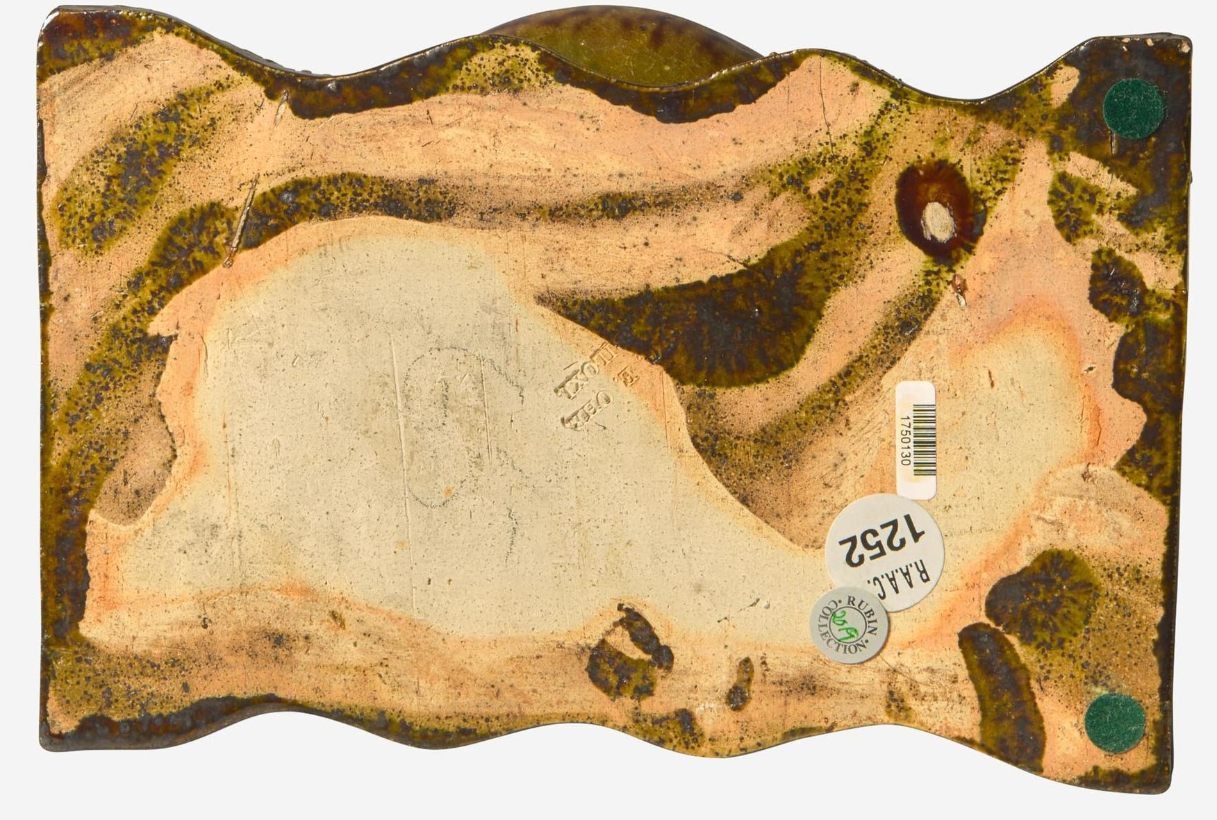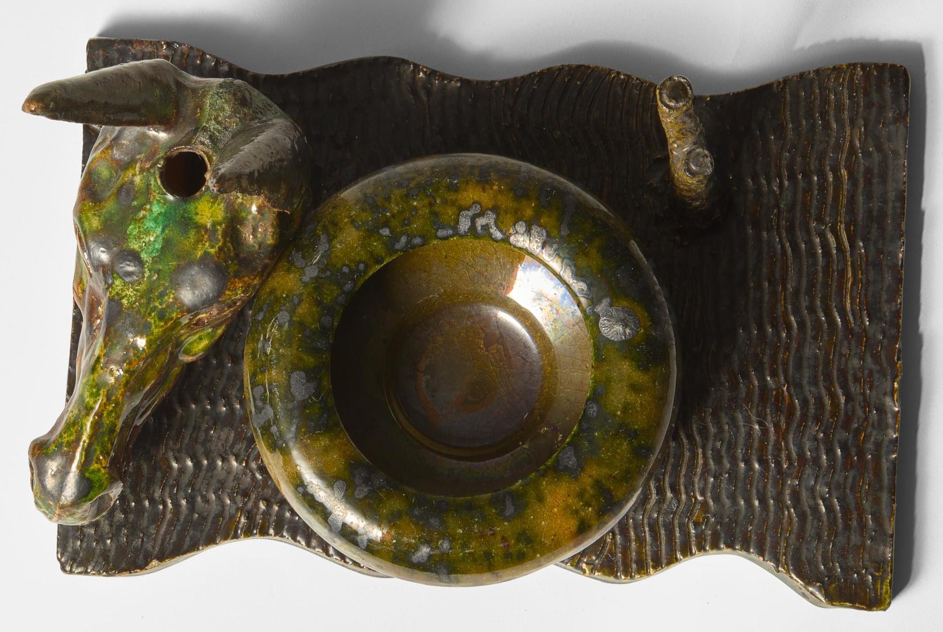 Novelty inkwell and pen tray with mule in speckled and mottled olive green and brown glaze.
