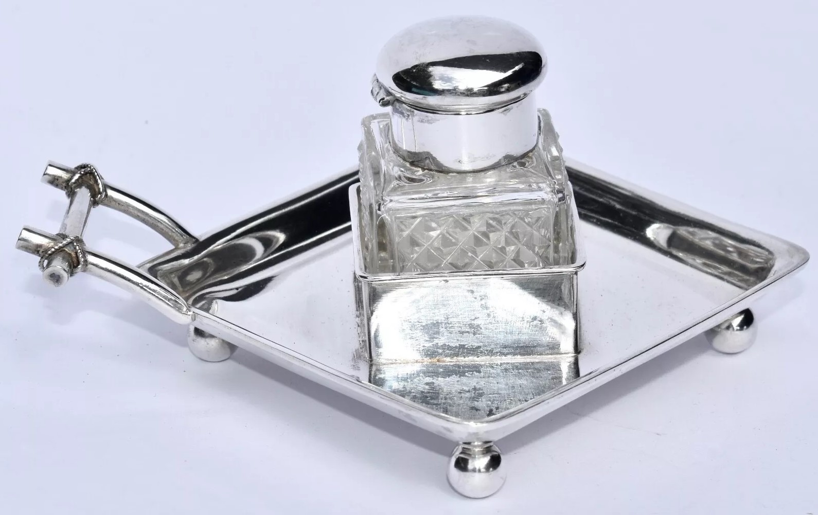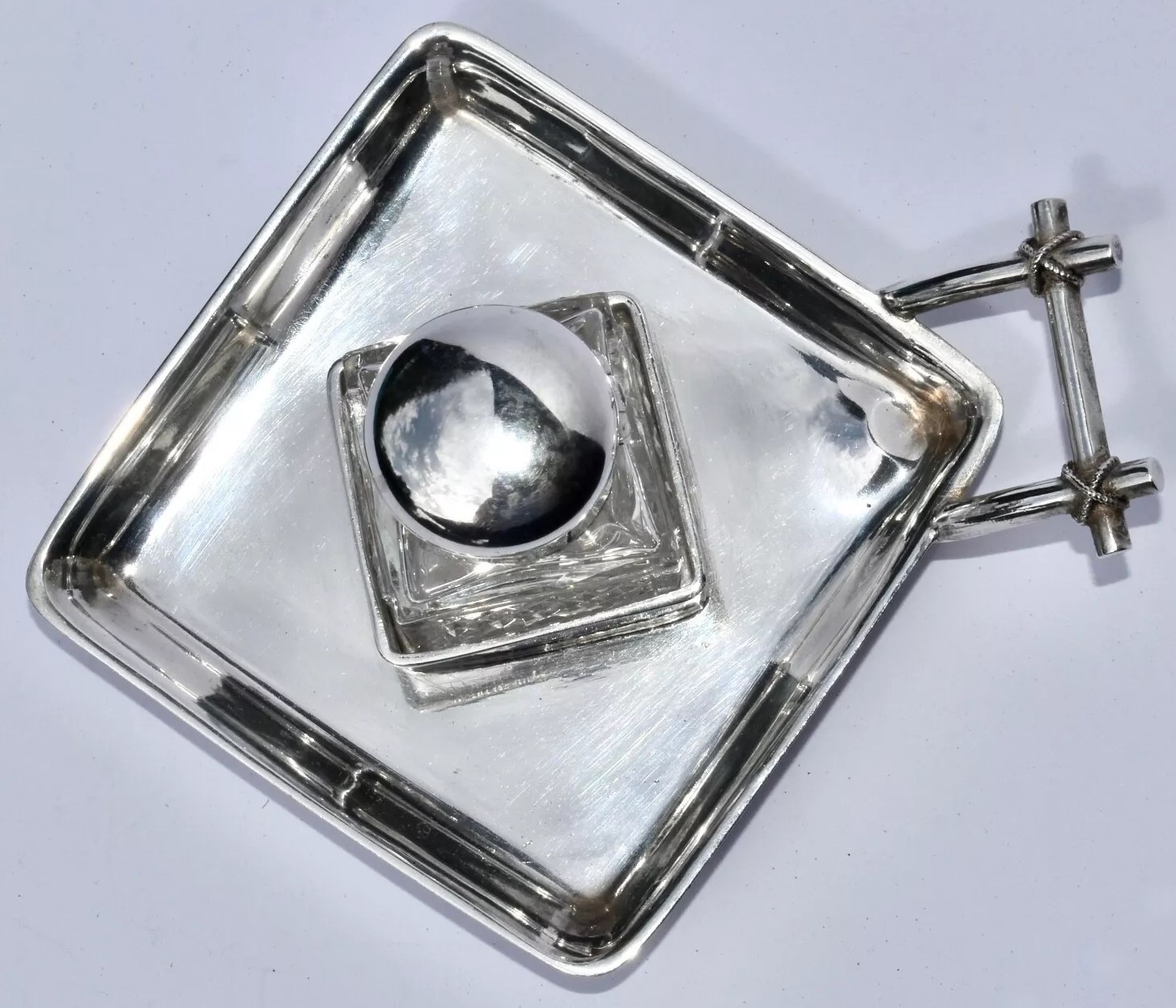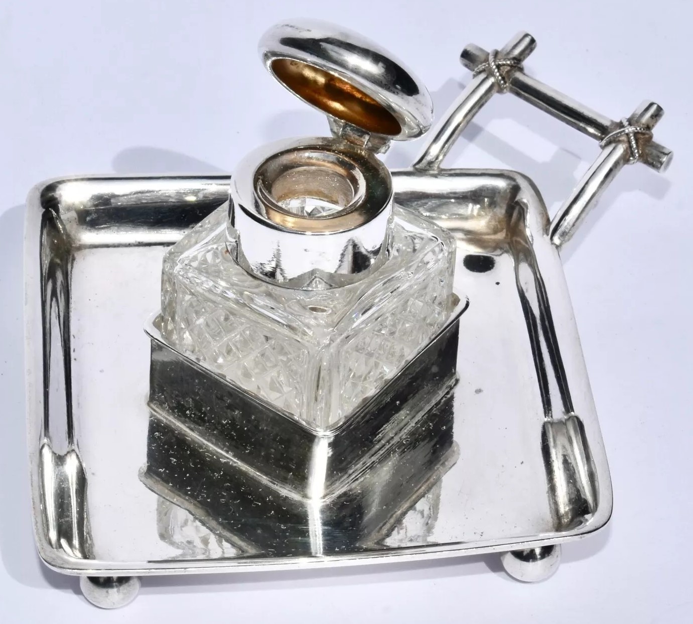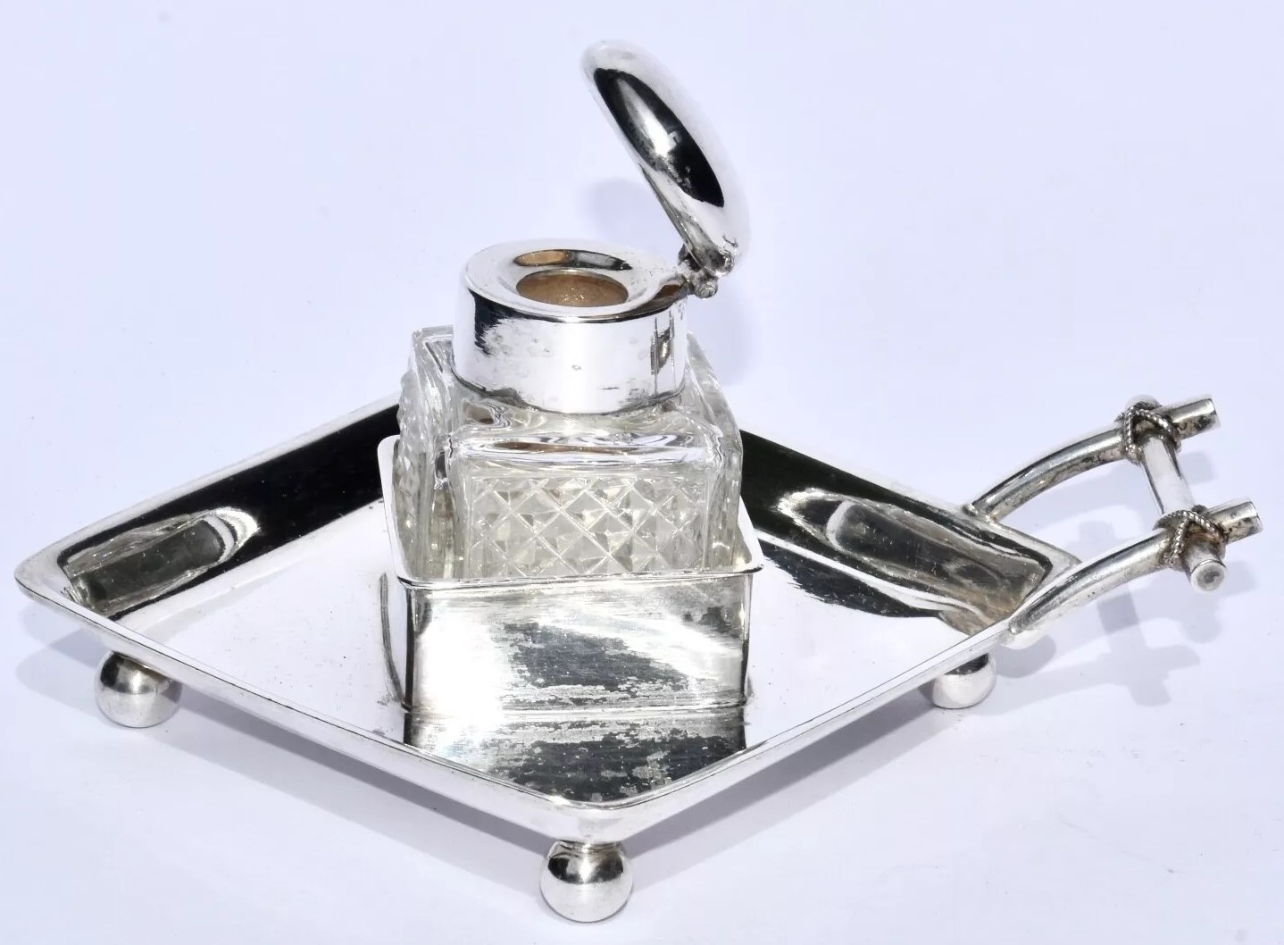 This silver inkstand features a square base with bun feet, raised edges, and an elongated handle with rope ties. In the center is a faceted glass inkwell with hinged silver lid. It is hallmarked on the base with the German crescent & crown silver mark, and the maker’s mark for Wilhelm Binder.