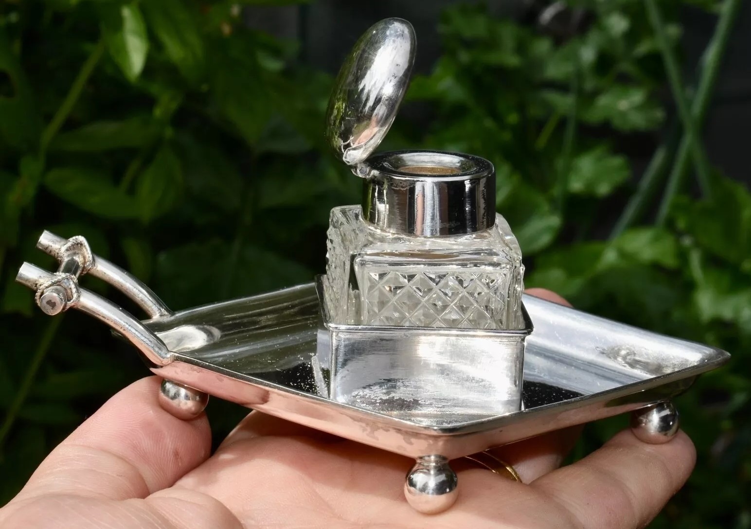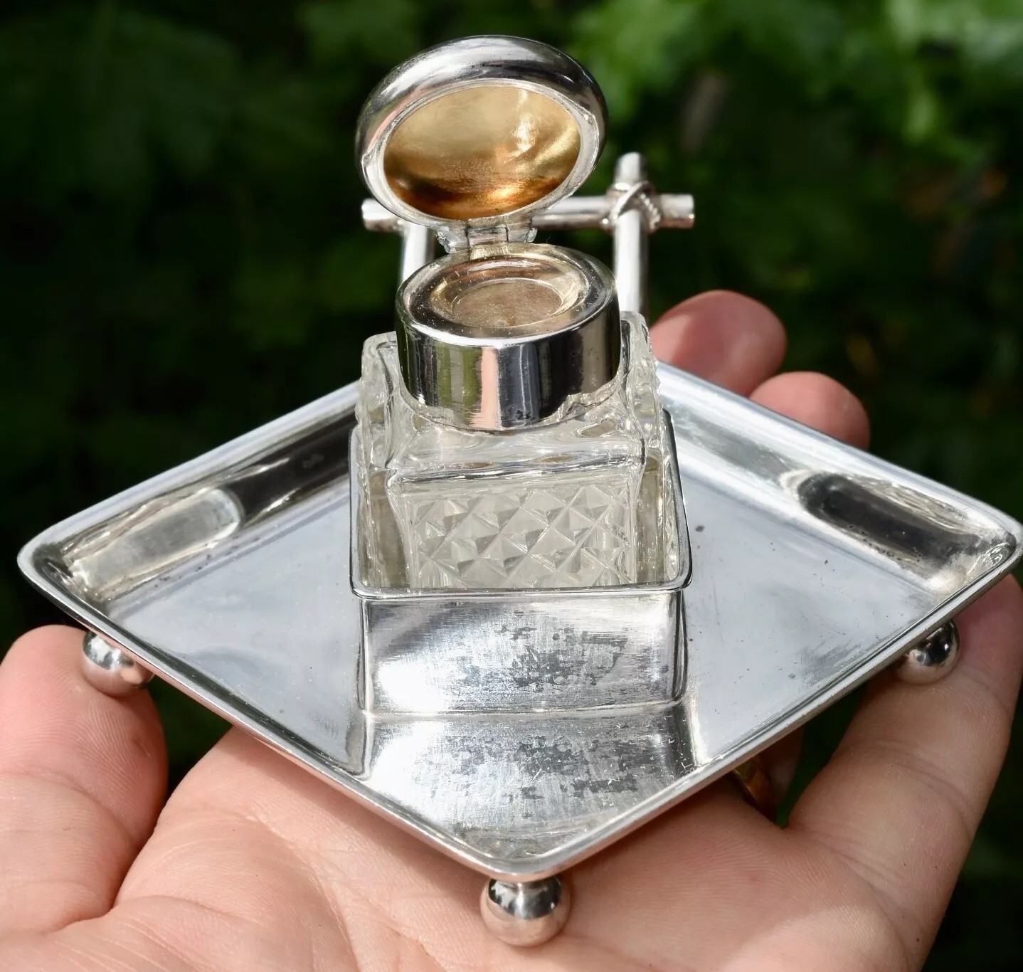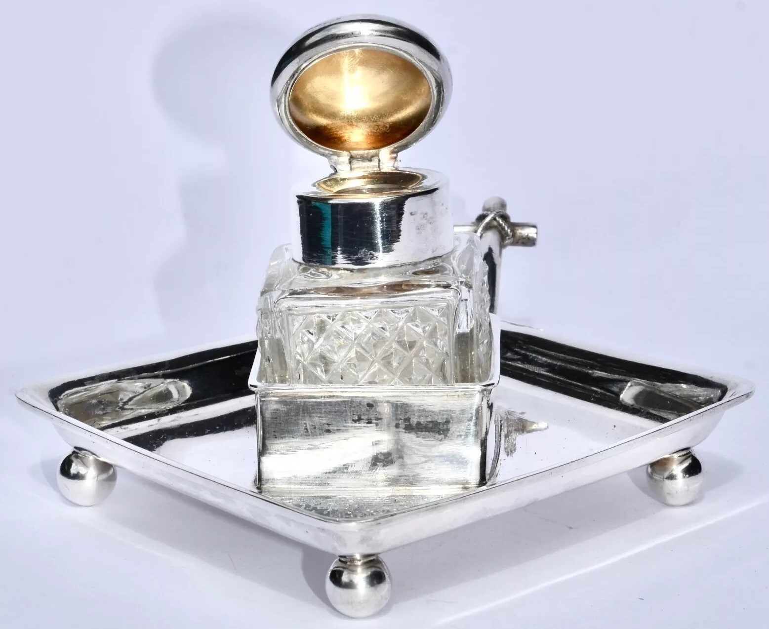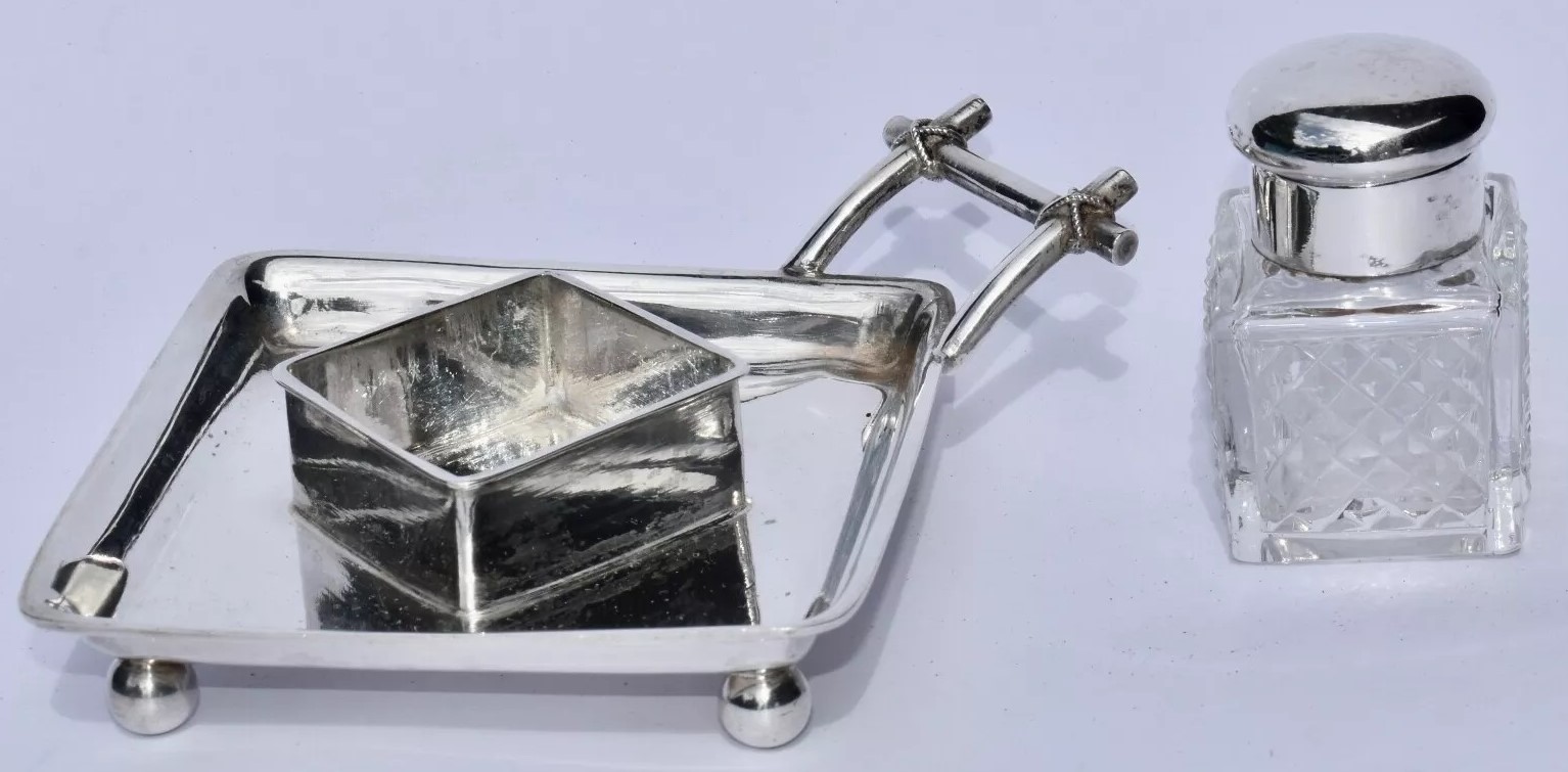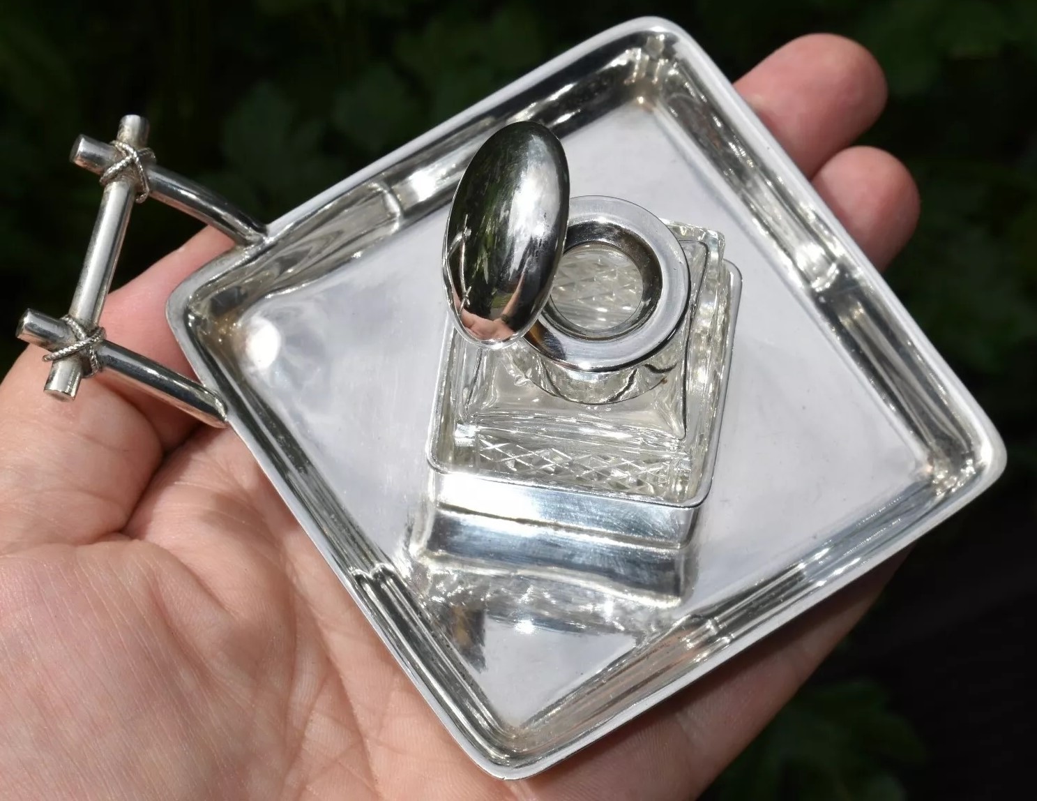 This silver inkstand features a square base with bun feet, raised edges, and an elongated handle with rope ties. In the center is a faceted glass inkwell with hinged silver lid. It is hallmarked on the base with the German crescent & crown silver mark, and the maker’s mark for Wilhelm Binder.