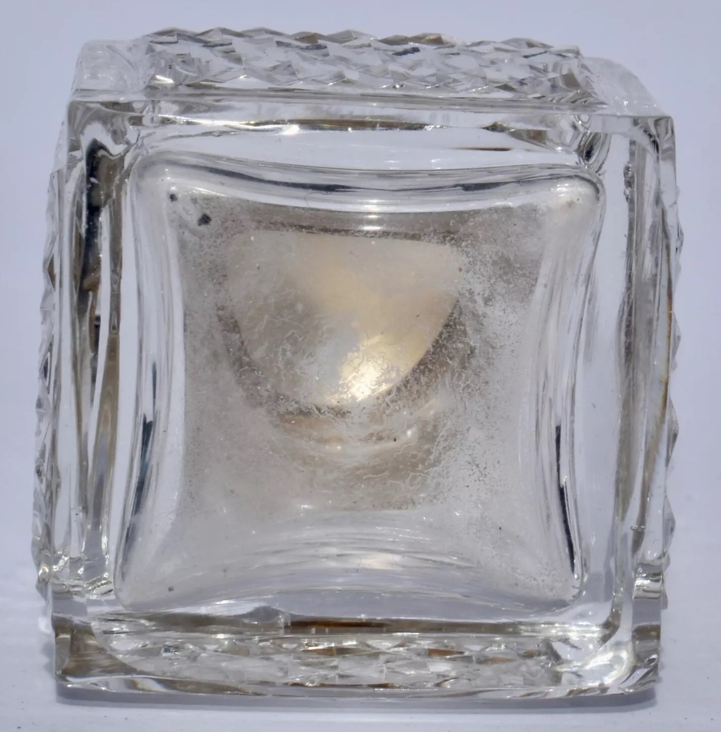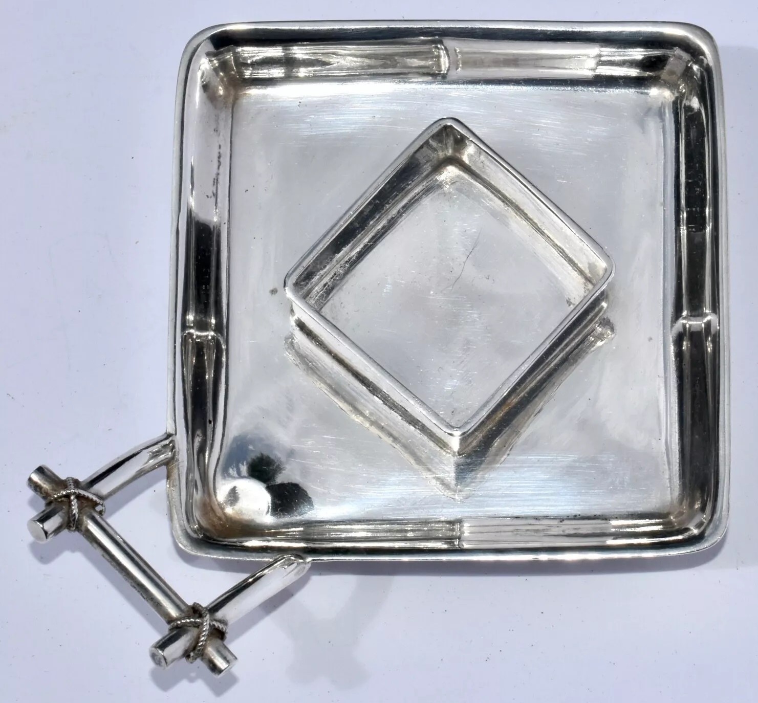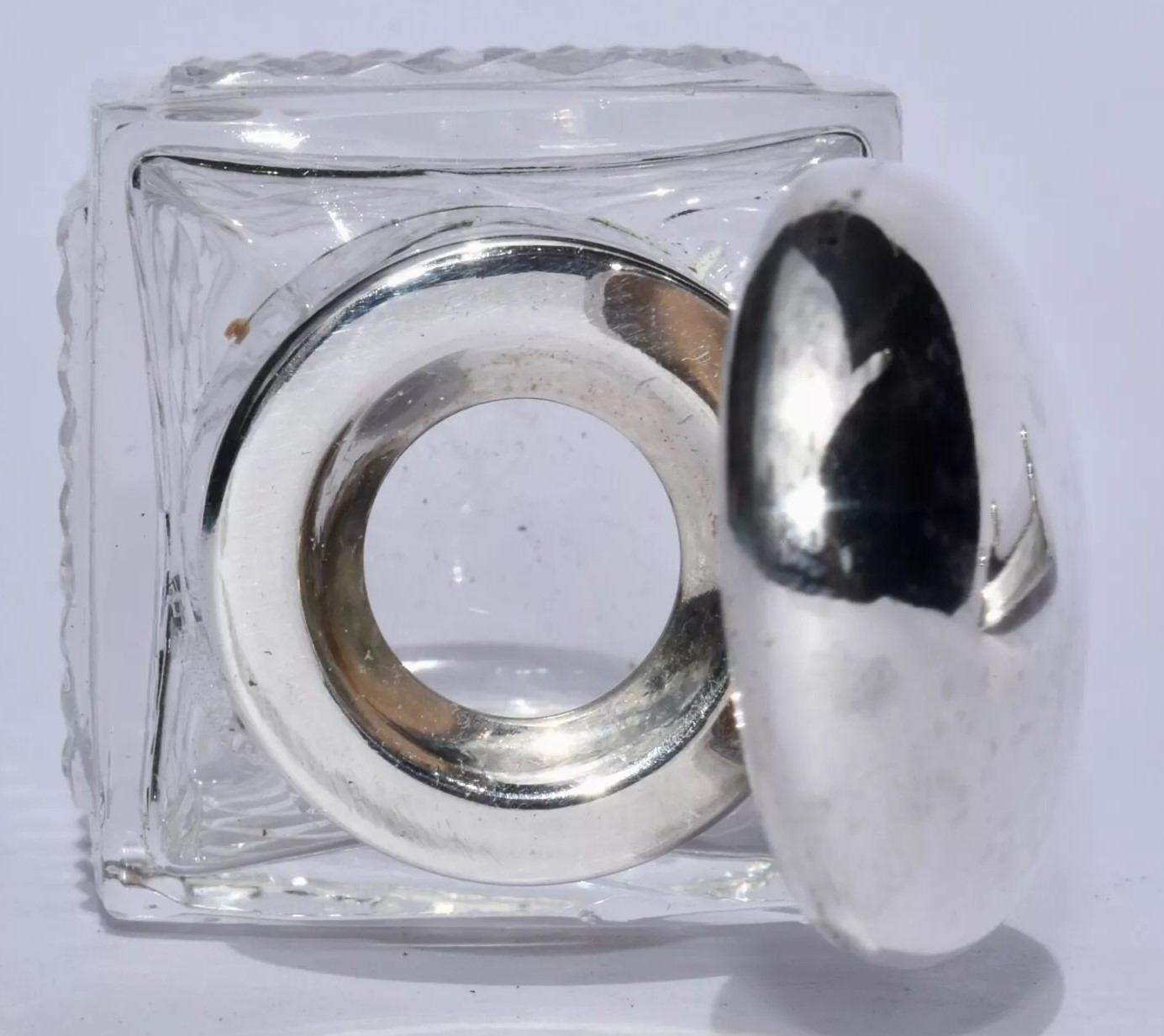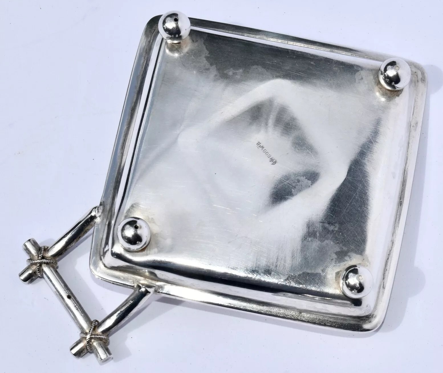 This silver inkstand features a square base with bun feet, raised edges, and an elongated handle with rope ties. In the center is a faceted glass inkwell with hinged silver lid. It is hallmarked on the base with the German crescent & crown silver mark, and the maker’s mark for Wilhelm Binder.