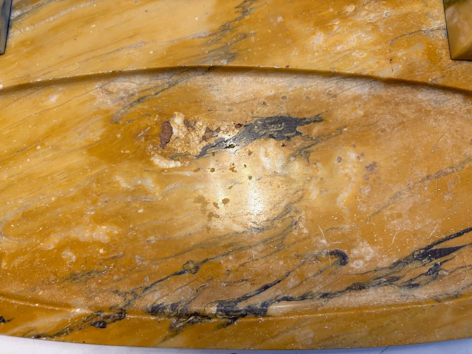 - Base Material (Marble): The base is made of a slab of polished yellow marble, most likely Giallo Siena. The warm, rich color of the stone creates an elegant and sophisticated contrast with the metal hardware.