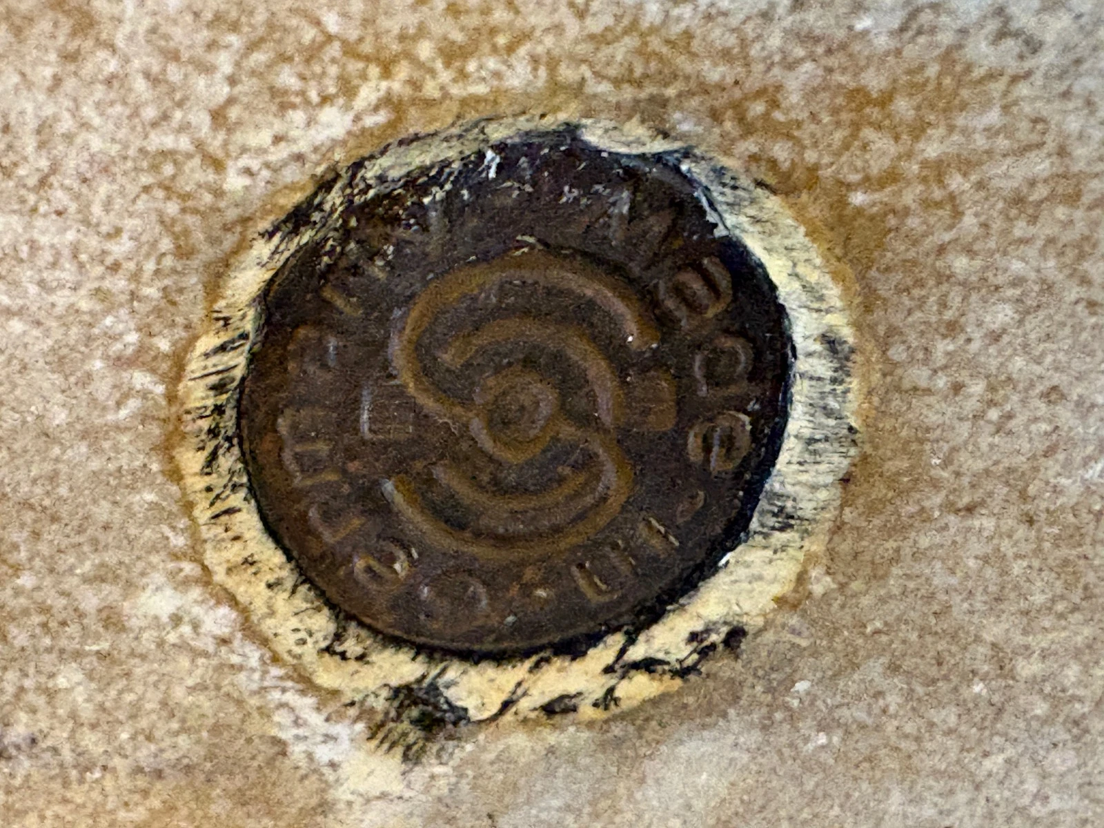 The complex mark – a large “S” with a backwards “C” through it—is the trademark of a German metalware or stone and metal workshop.