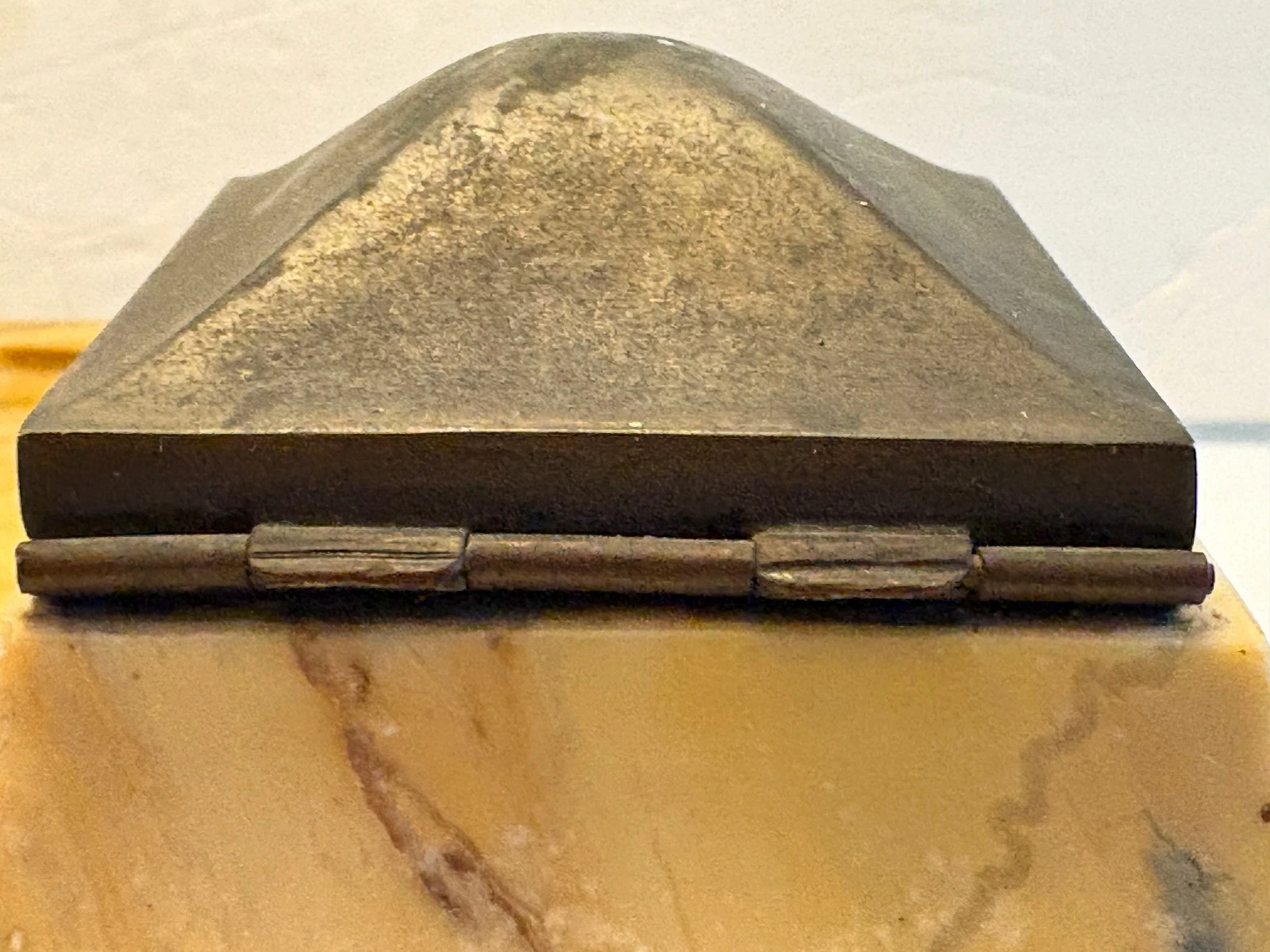 - Lids: The two inkwells are covered with hinged metal lids, likely brass that have developed a patina over time.