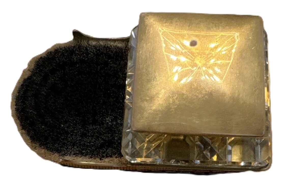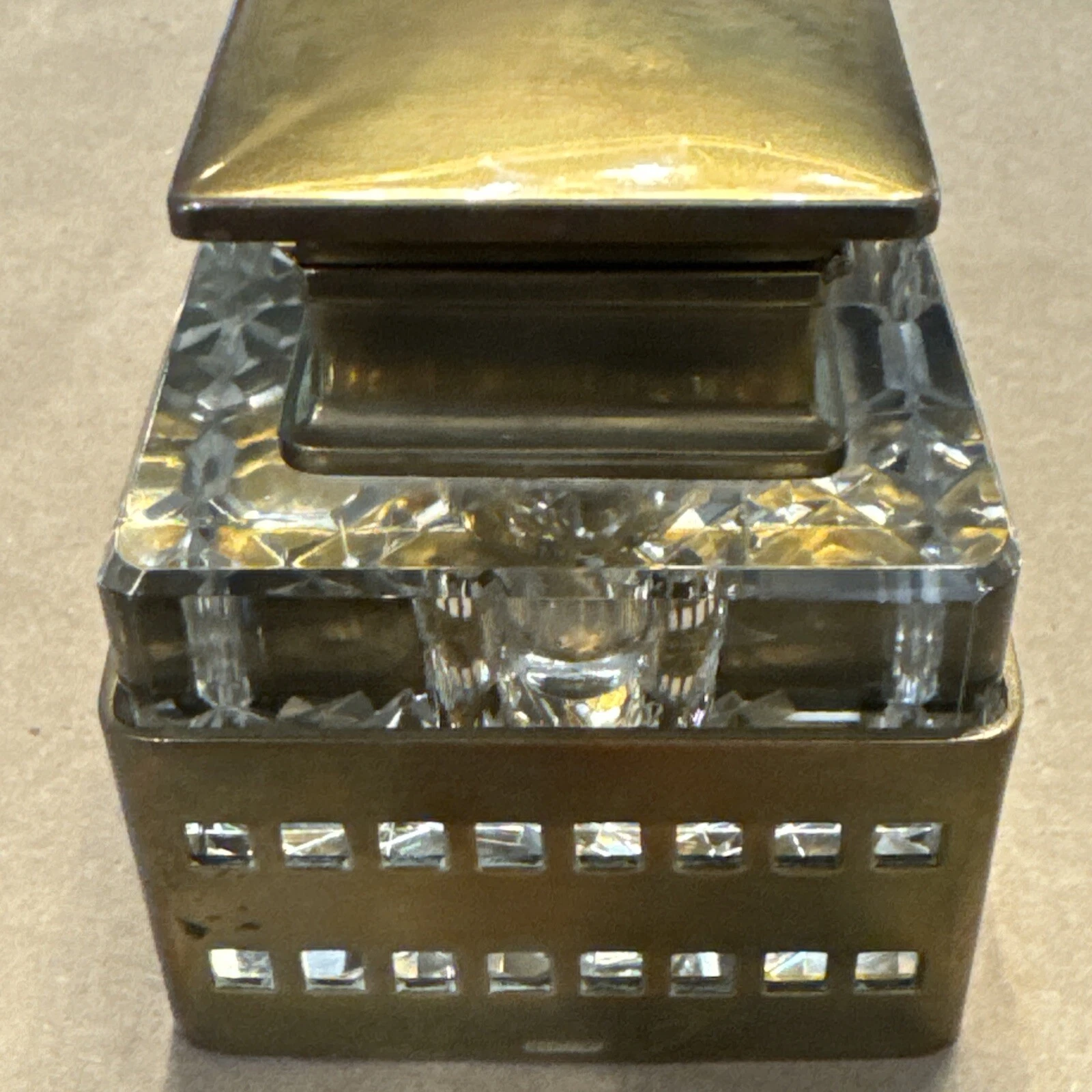 • Inkwell: A square, clear glass inkwell is recessed into the brass base. It is topped with a brass hinged lid. The glass is molded, suggesting industrial production methods.
