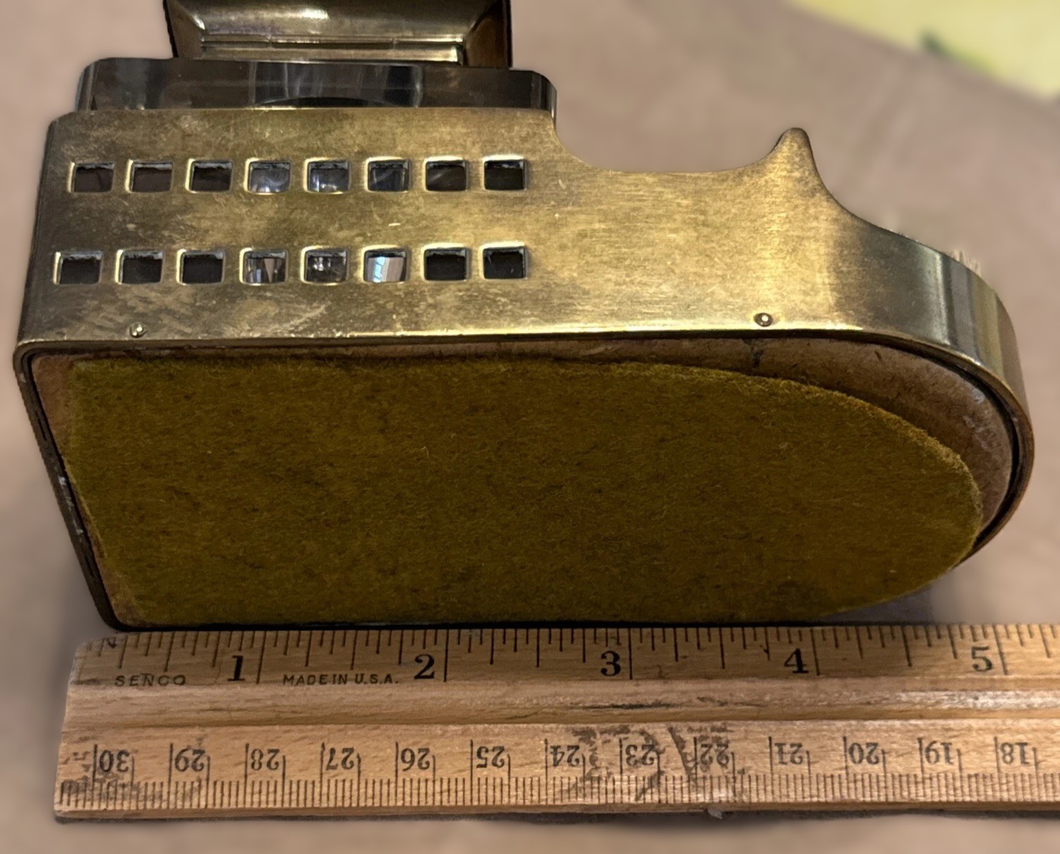 • Pen Wipe: A significant feature is the large, semi-circular pen wipe (also called a nib wiper) next to the inkwell. This consists of tightly packed bristles (horsehair) held within the brass rim. Its purpose was to quickly clean the excess ink off the nib of a dip pen.