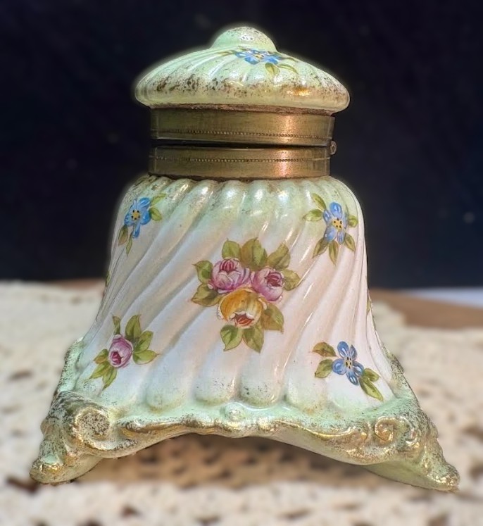 - Materials and Finish: The inkwell’s body and lid are made of fine porcelain with a glossy glaze. The lid is connected to the body with a brass hinge, and the entire piece is finished with delicate gold gilt accents along the rims and on the small finial on the lid.