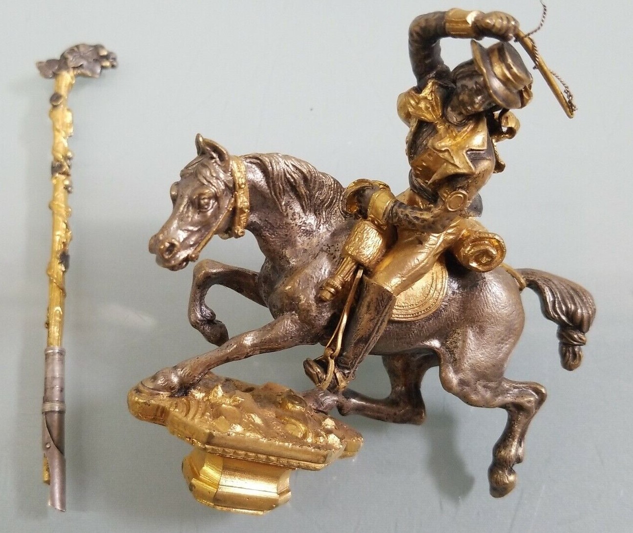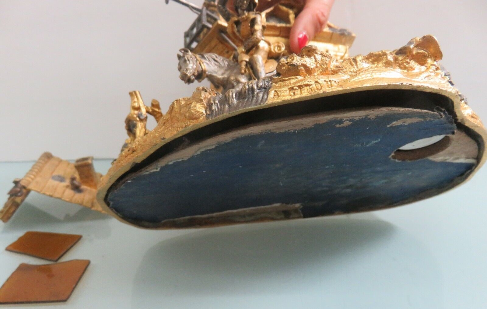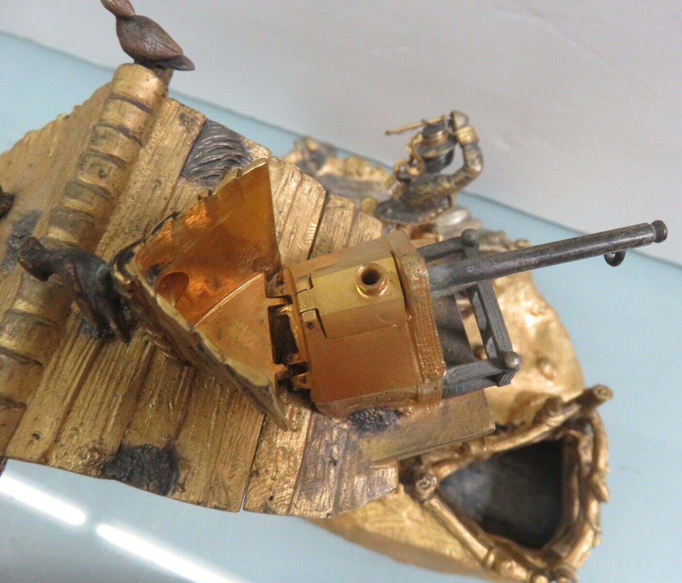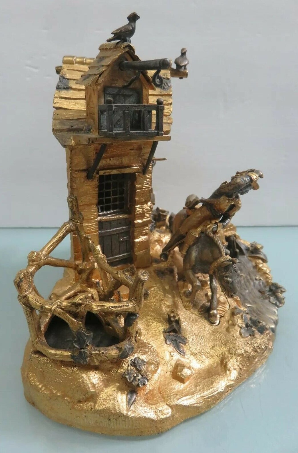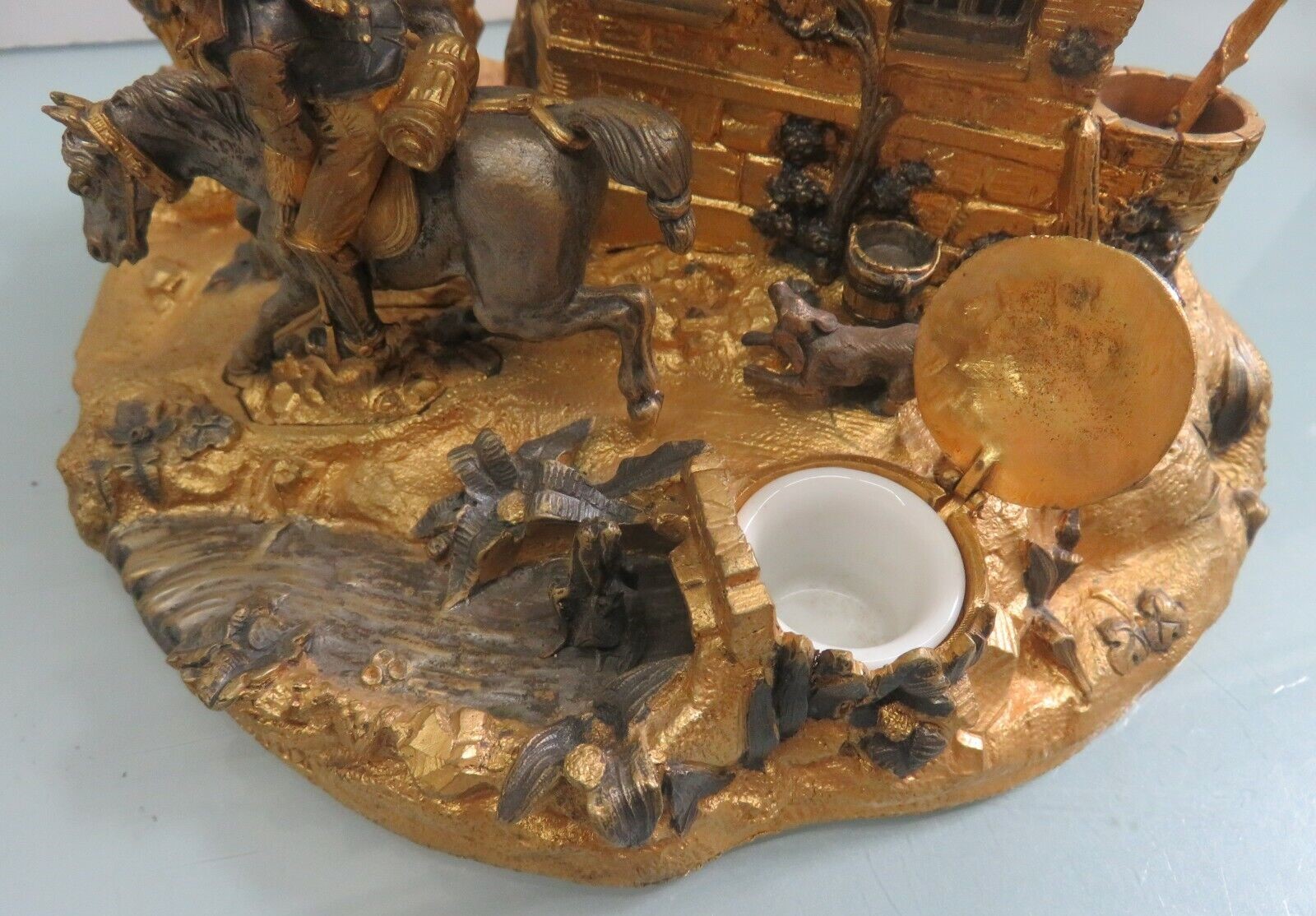 This detailed farm scene features a man on a horse, a playful dog behind him. The inkwell is hidden in the mounded spring from which water flows. In the background is a country house with windows, a dormer, chimney, gables, and an overhanging roof on which birds have lit. A pulley for a well is attached to the house. The horse with rider pulls out and can be used as a seal stamp. A staff is a pen handle. The piece is signed “A. Giroux”. Alphonse Giroux (1775-1848).