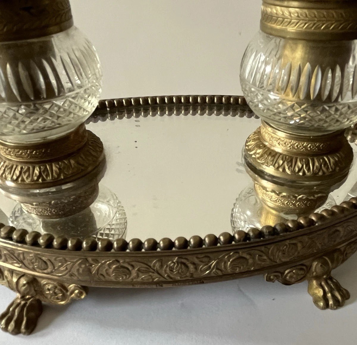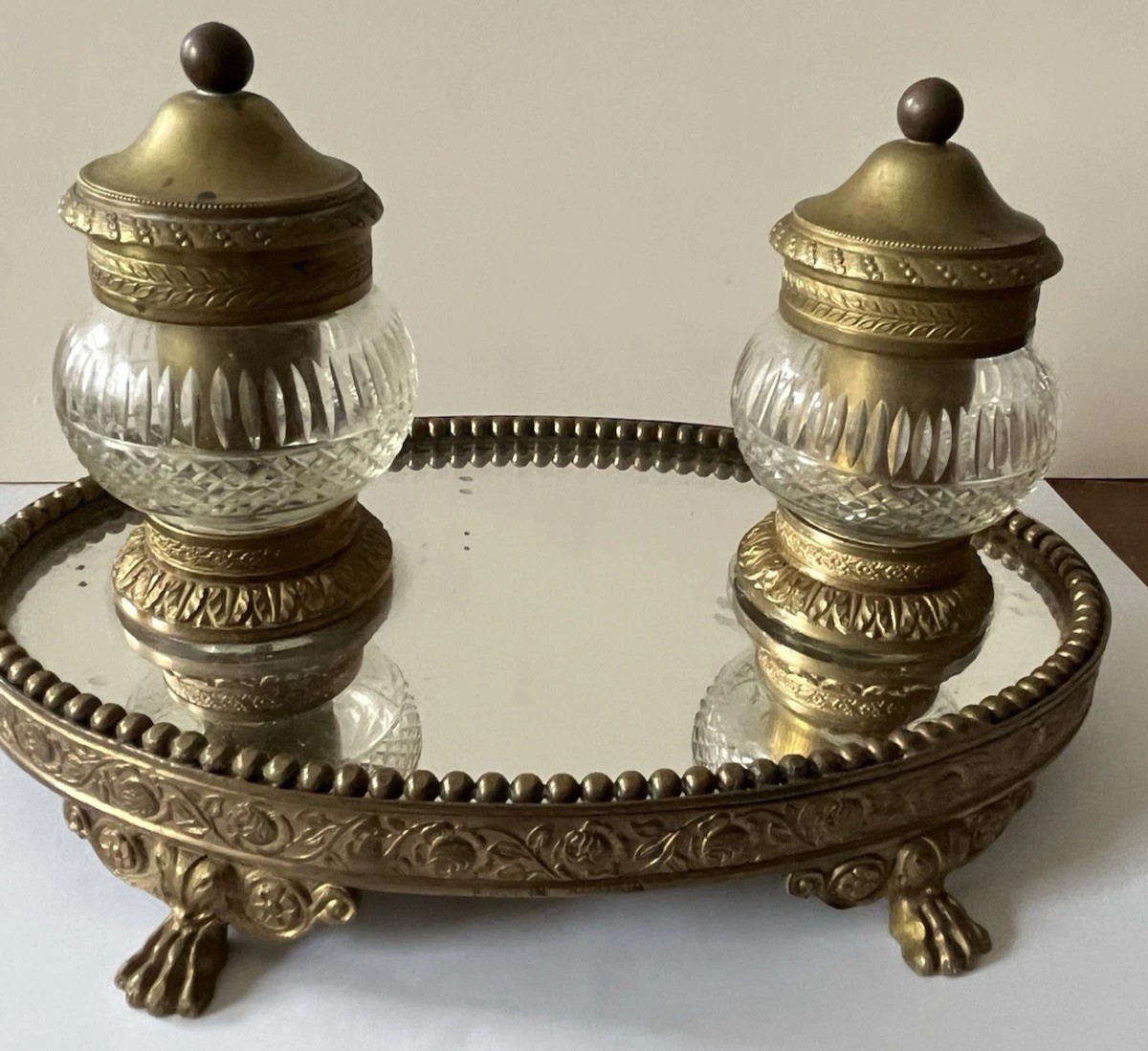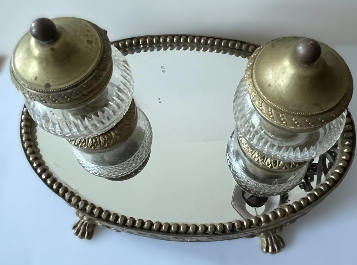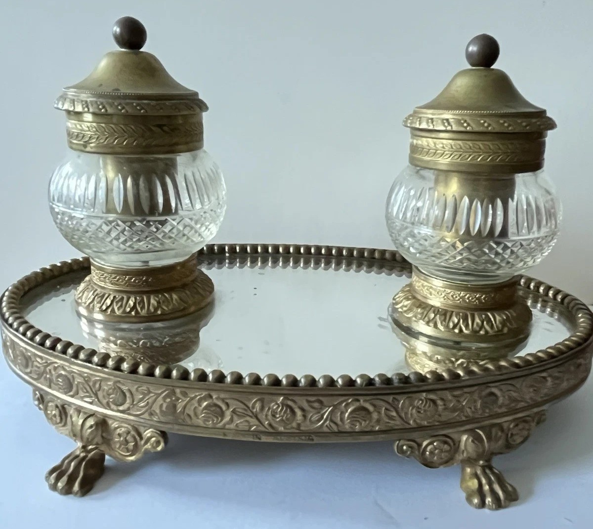 - Double Inkwells: The stand holds two matching etched cut-glass inkwells, one on each side of the central part of the base. The glass is clear and features faceted cuts. Each inkwell has a hinged lid made of gilt bronze, topped with a small, decorative finial.