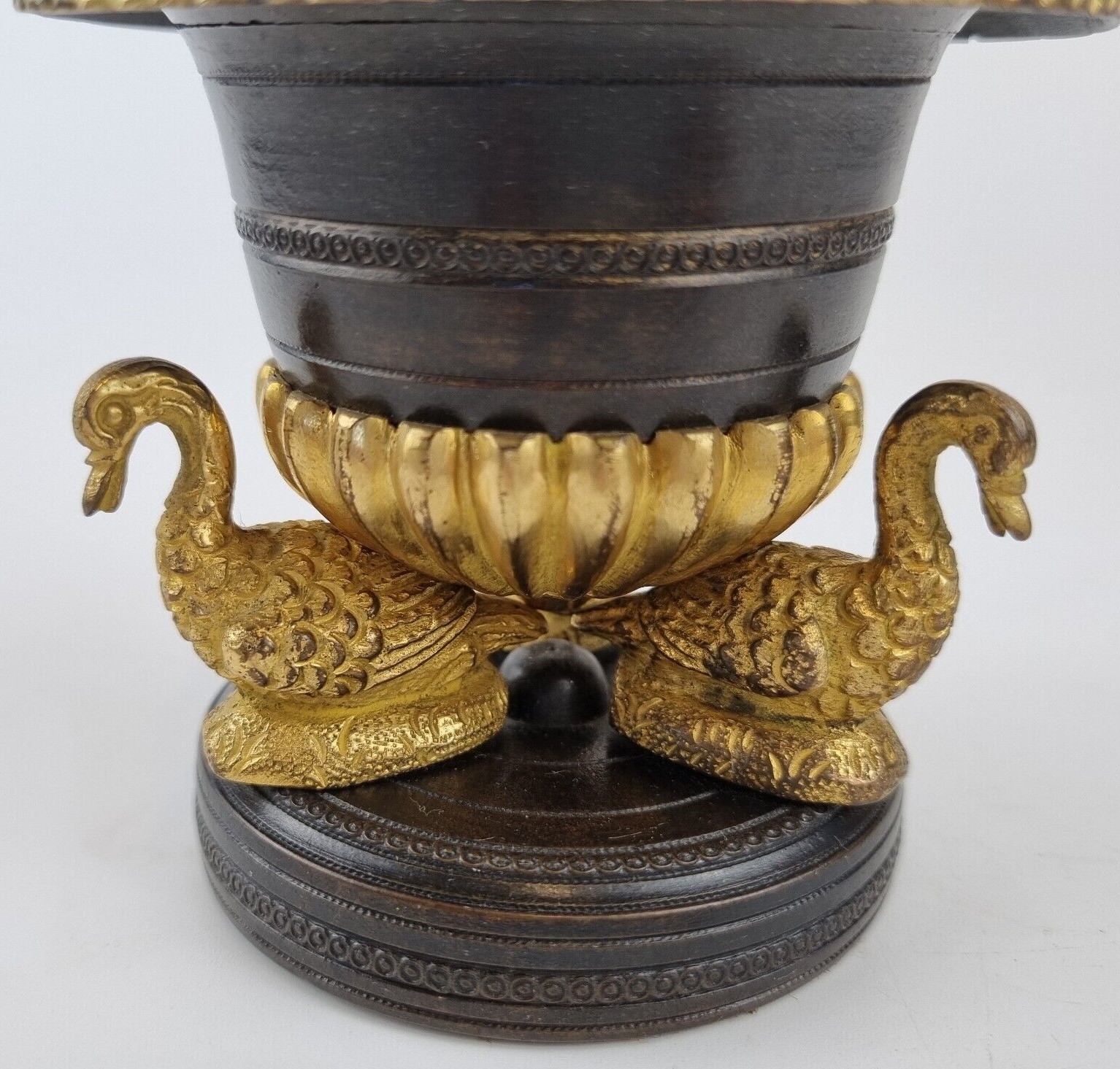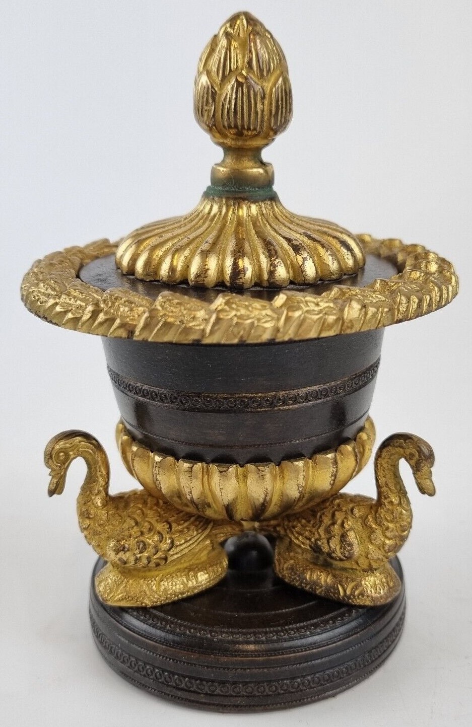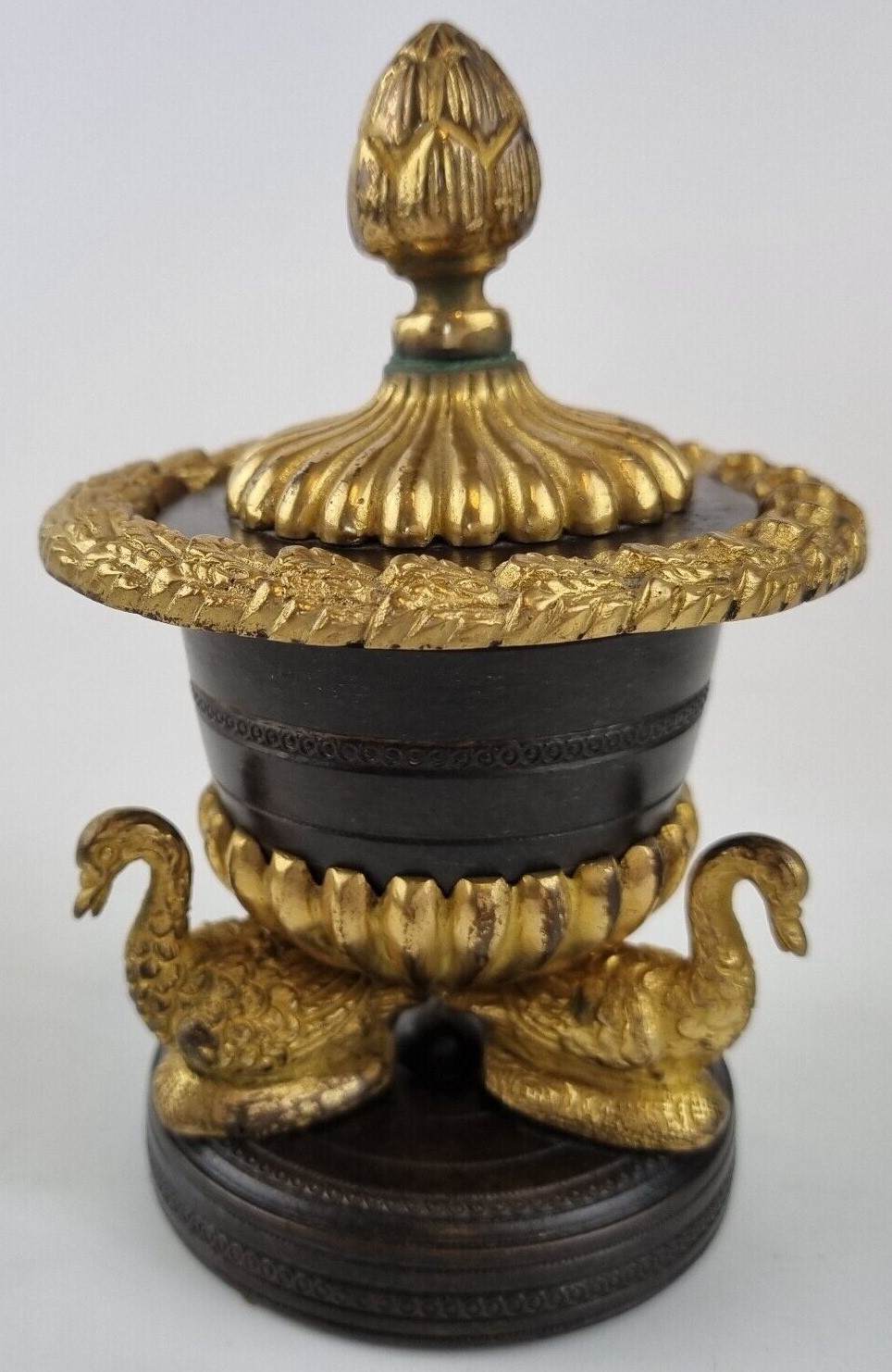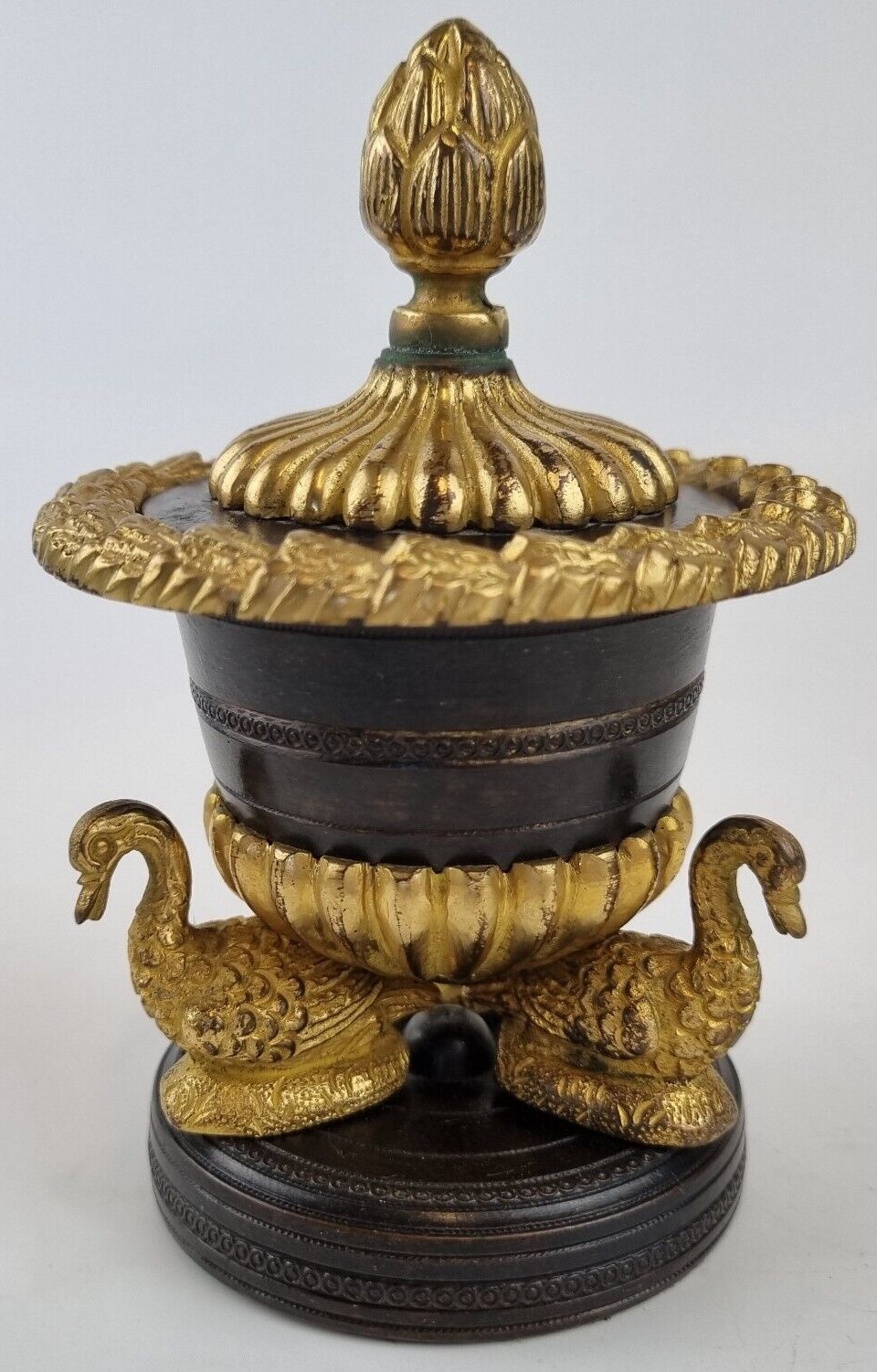 Bronze and gilt bronze inkwell supported by swans on a weighted base.