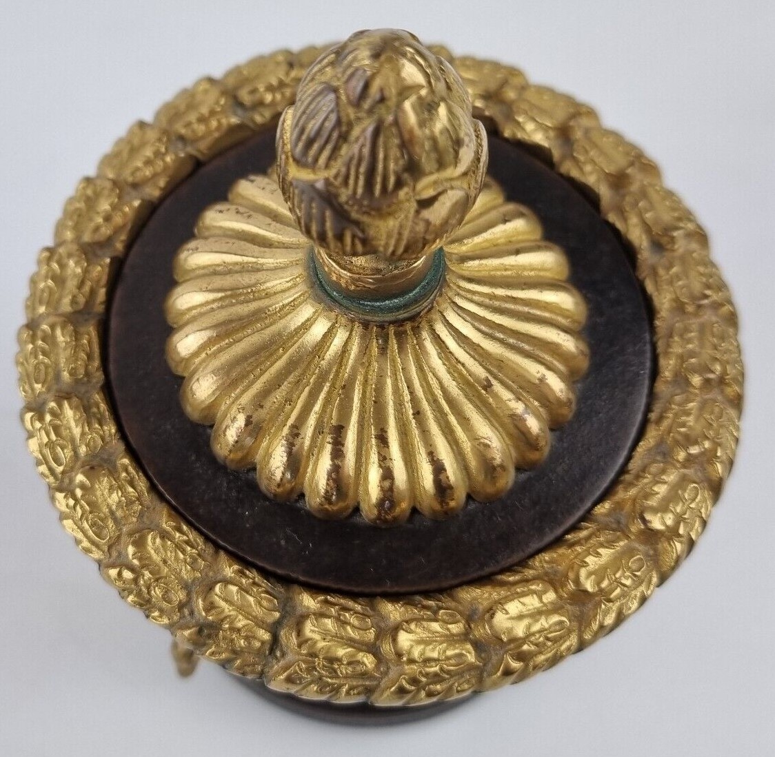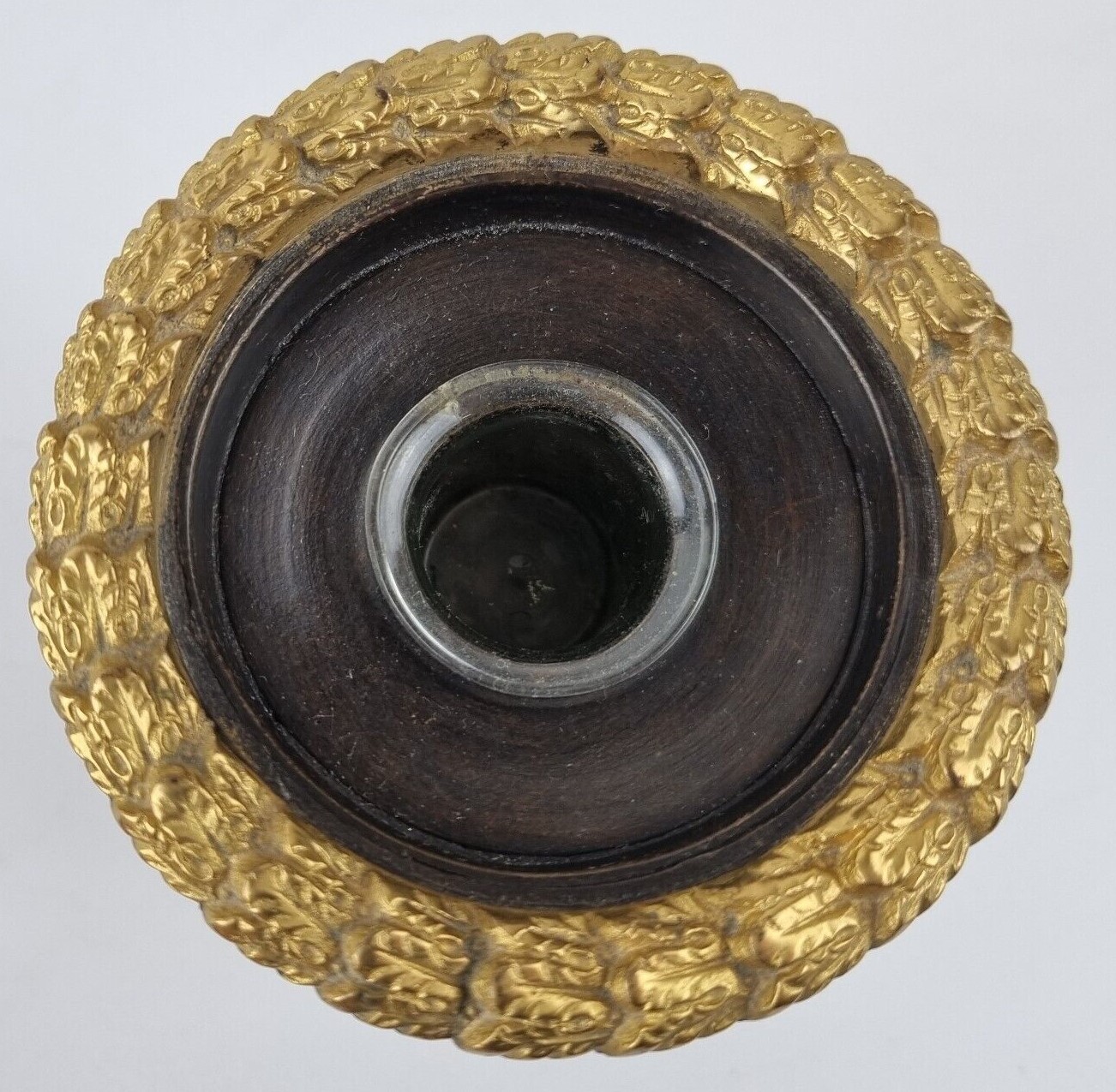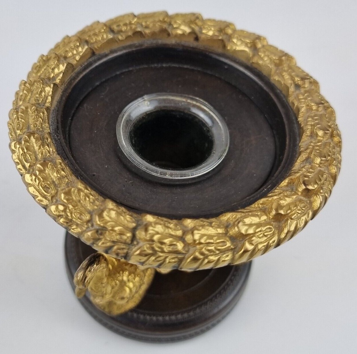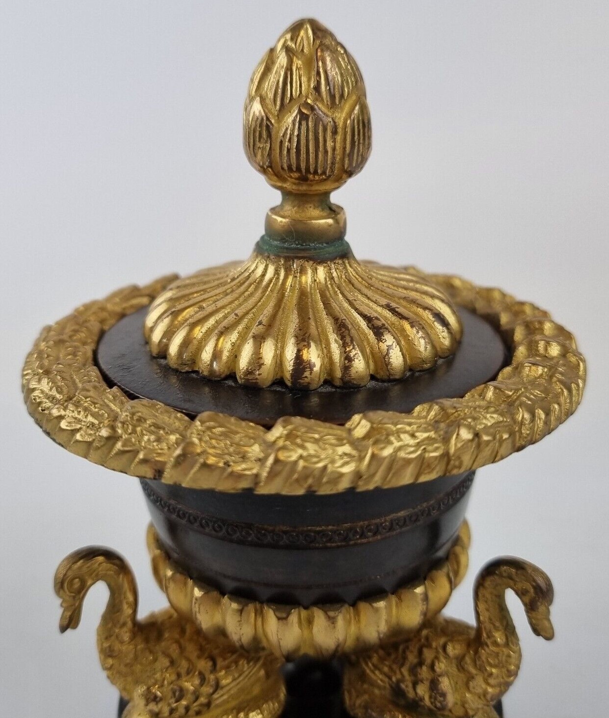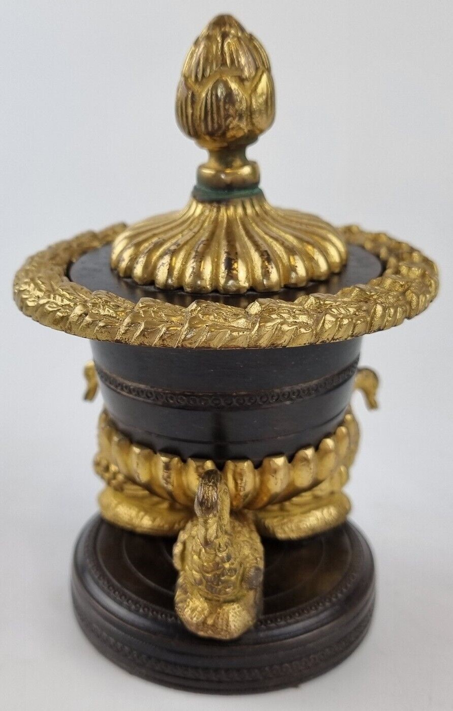 Bronze and gilt bronze inkwell supported by swans on a weighted base.