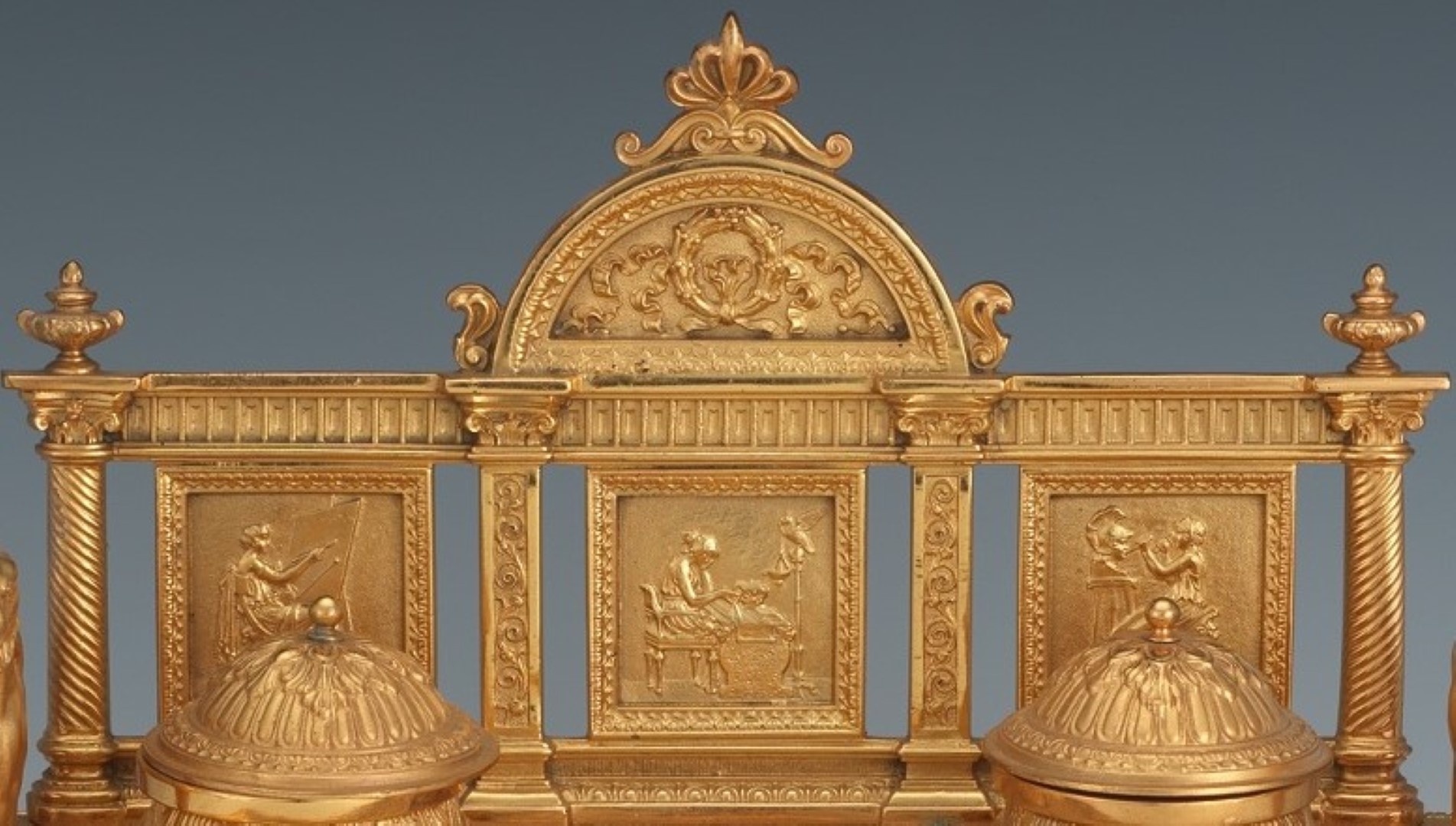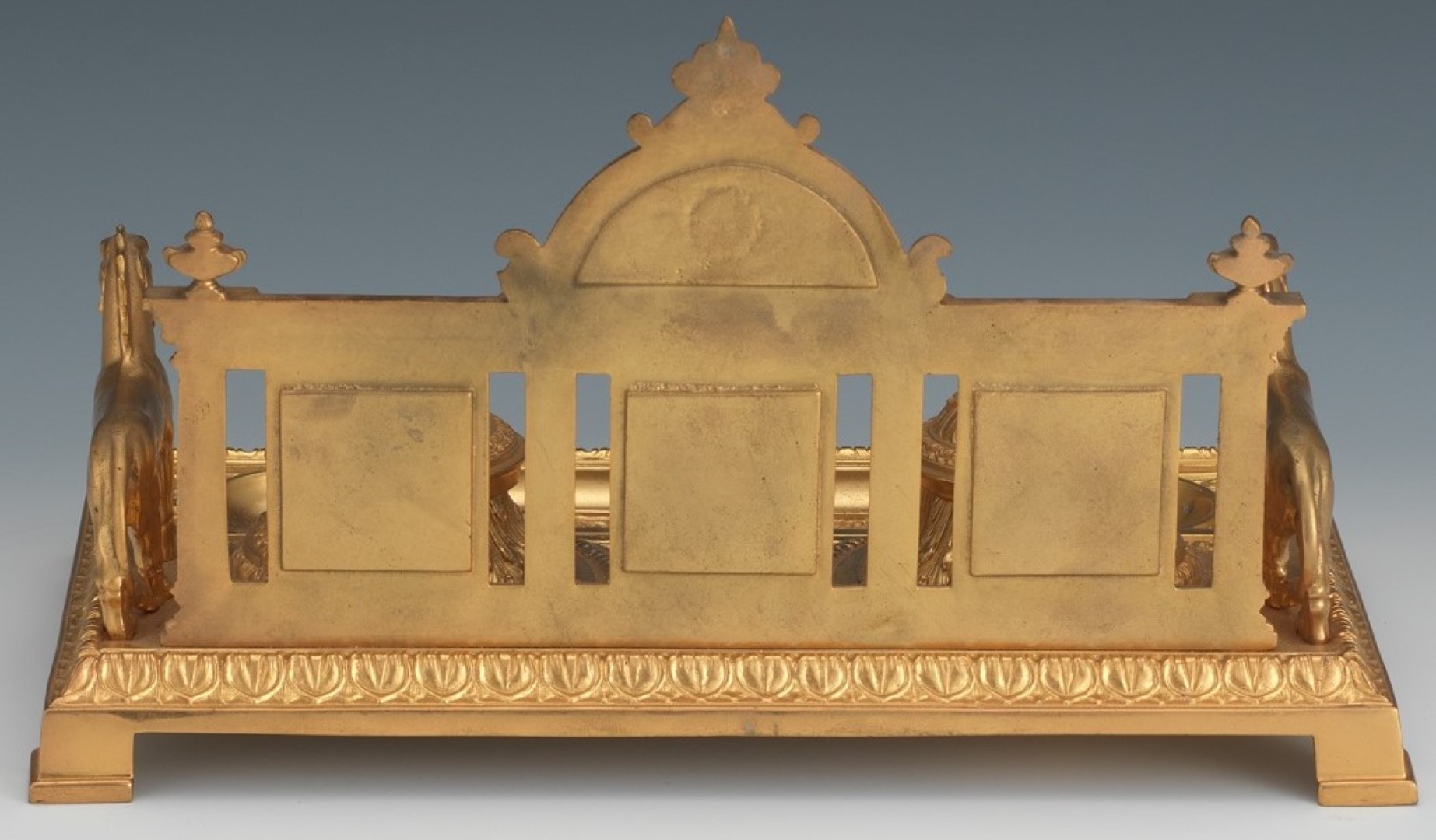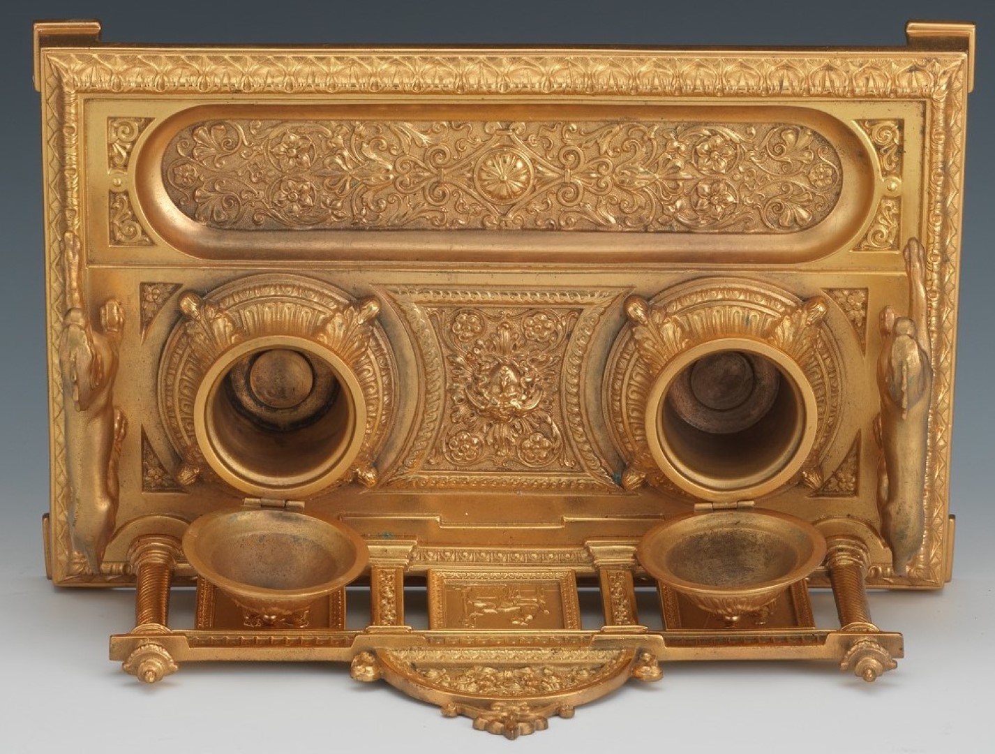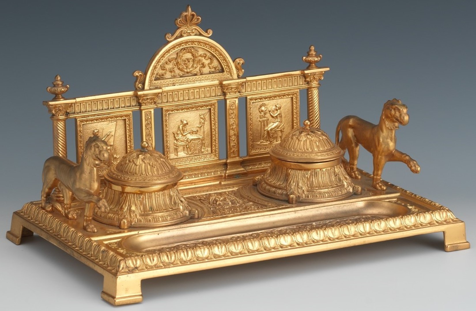 Ornate and substantial 19th-century French bronze footed inkstand in the neoclassical style. Features include two griffins on either side, Medusa’s face between two lidded inkwells, and a floral design on the pen tray. Below an arched center back with a laurel wreath in the center are three intricate panels depicting the arts: a seated artist with canvas; a seamstress; a sculptor.