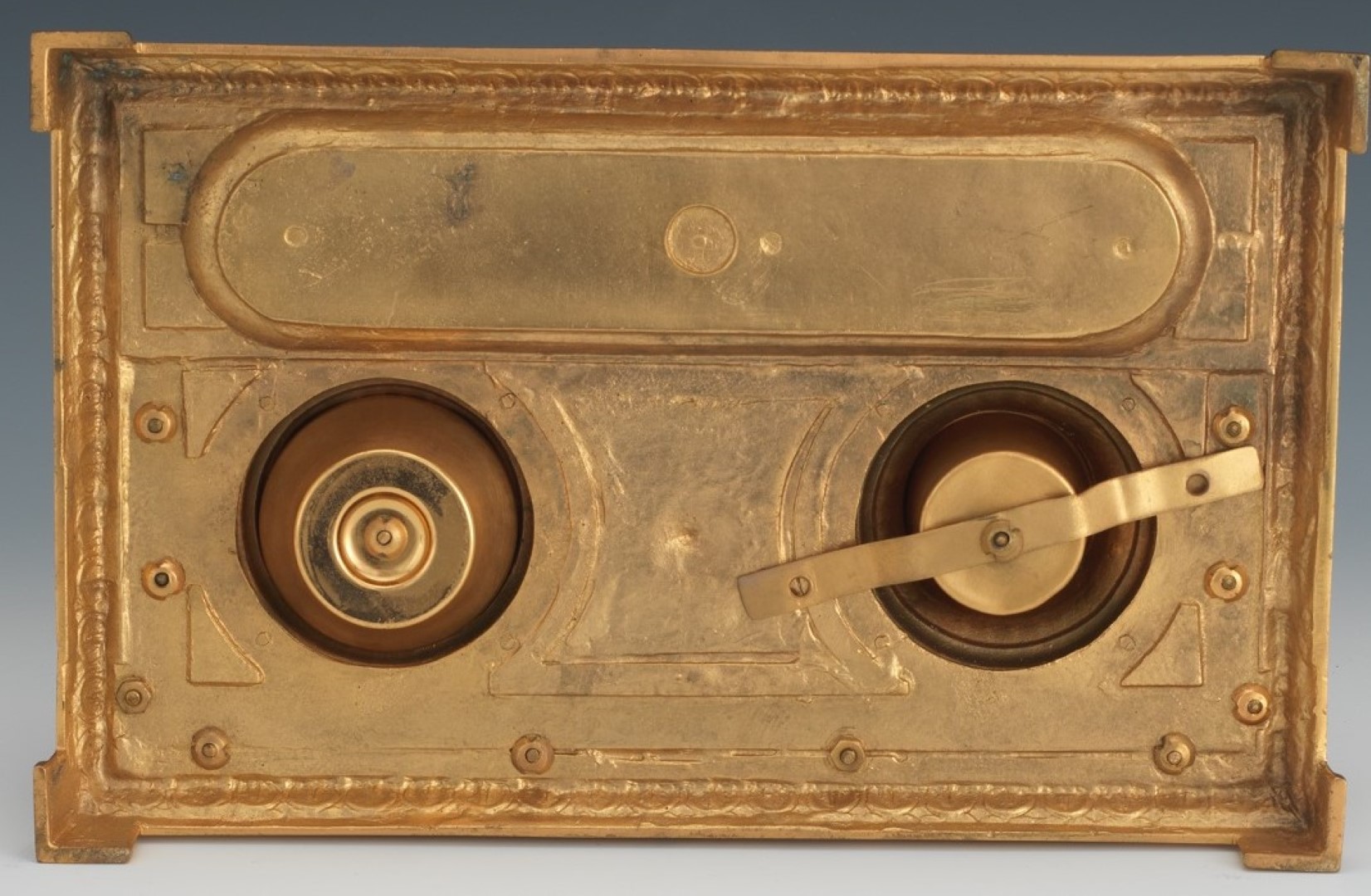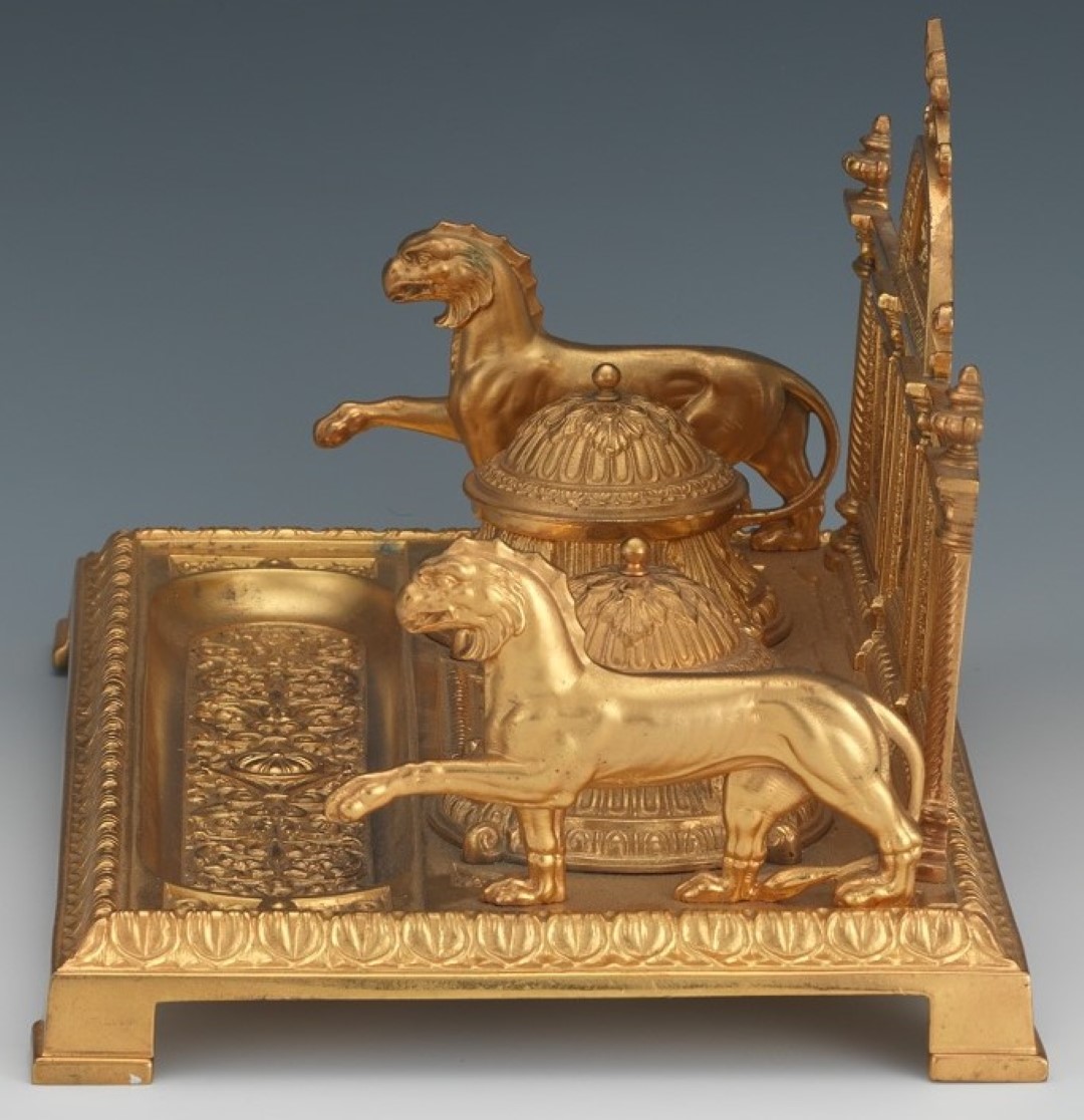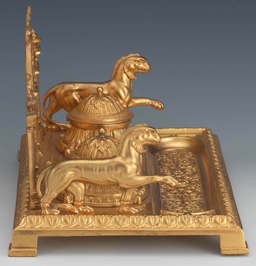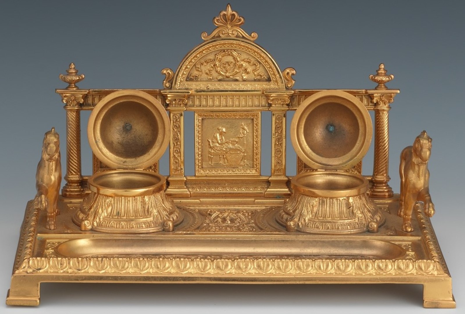 Ornate and substantial 19th-century French bronze footed inkstand in the neoclassical style. Features include two griffins on either side, Medusa’s face between two lidded inkwells, and a floral design on the pen tray. Below an arched center back with a laurel wreath in the center are three intricate panels depicting the arts: a seated artist with canvas; a seamstress; a sculptor.
