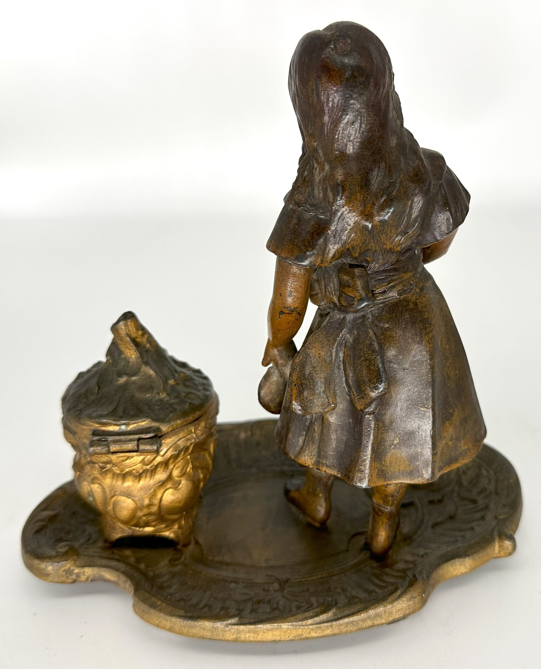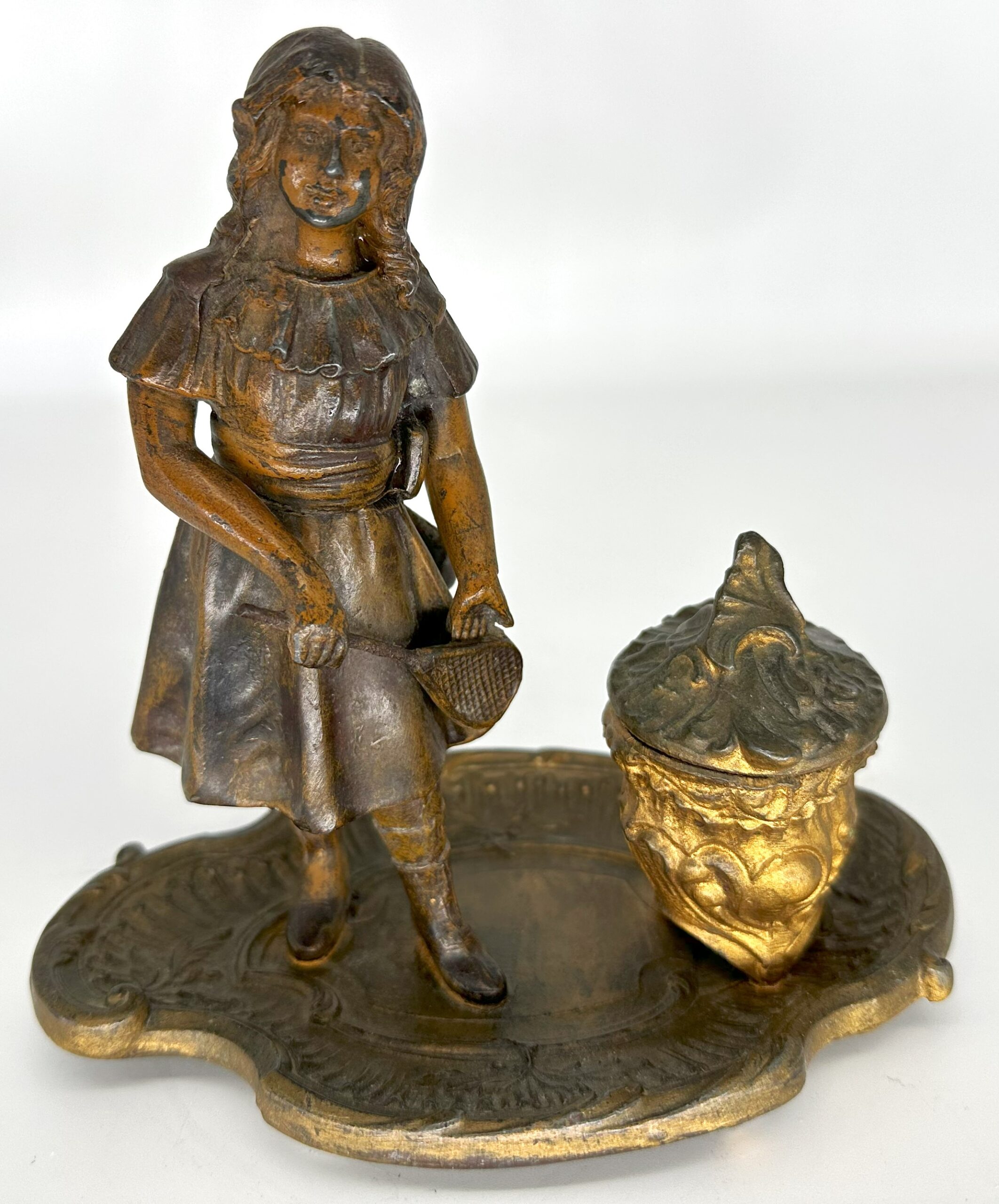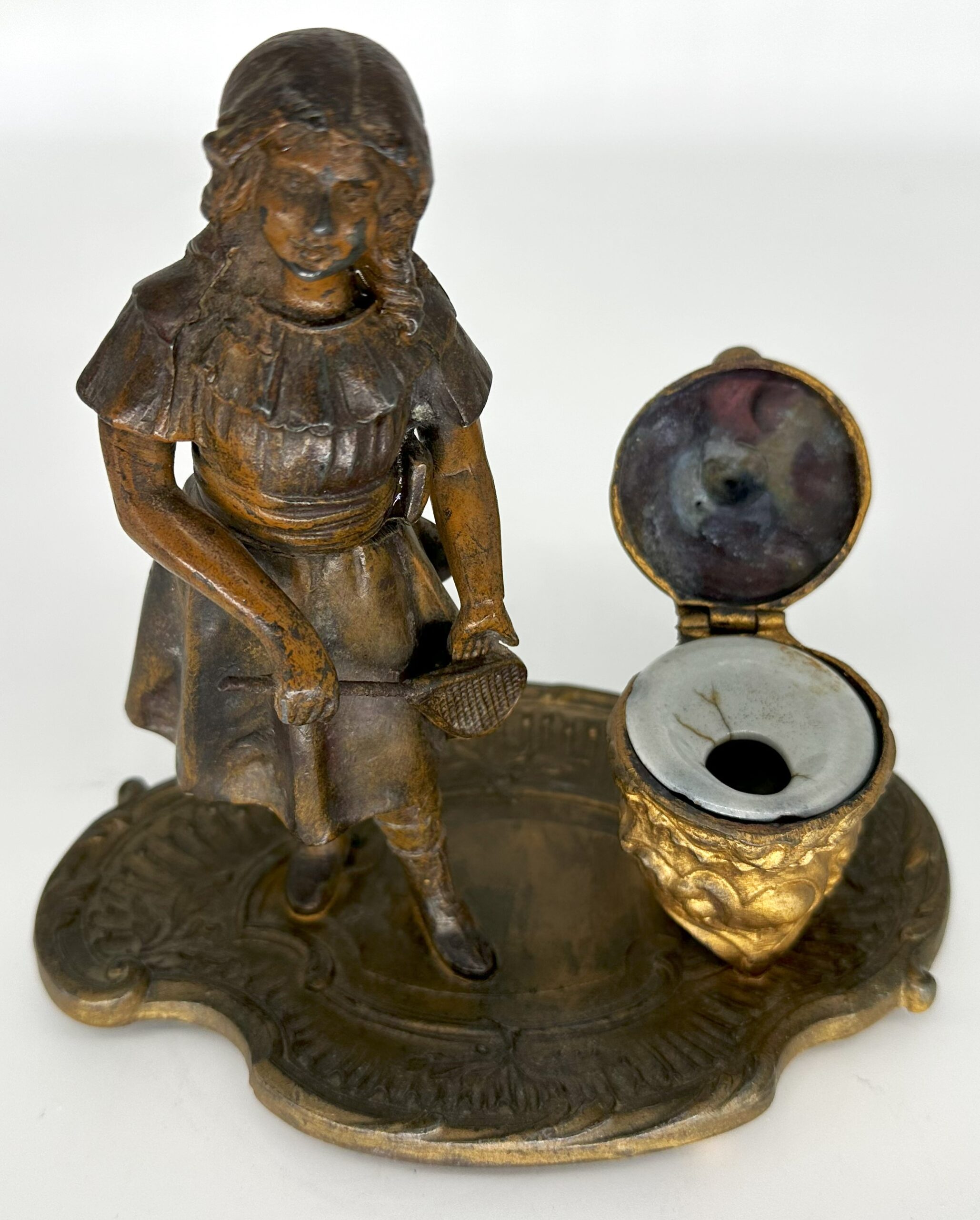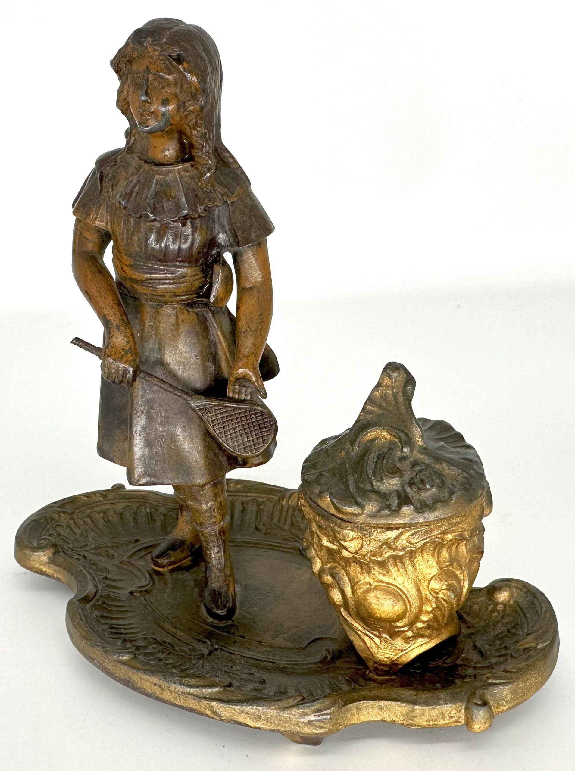 Bronze-patinated white metal inkstand with standing figure of girl in Victorian dress and high button boots holding tennis racquet.