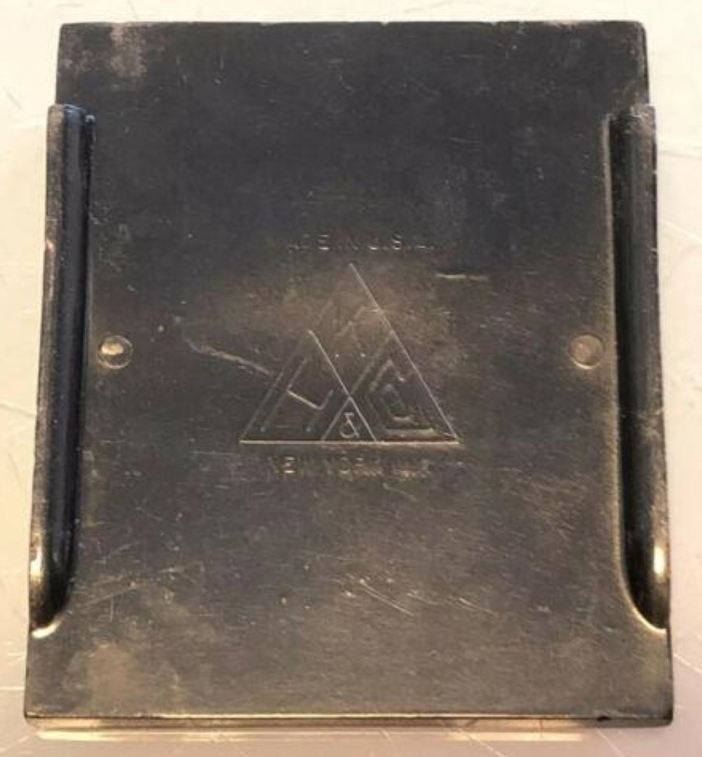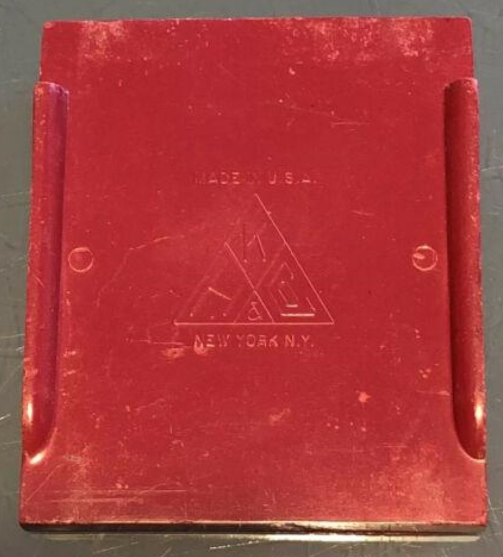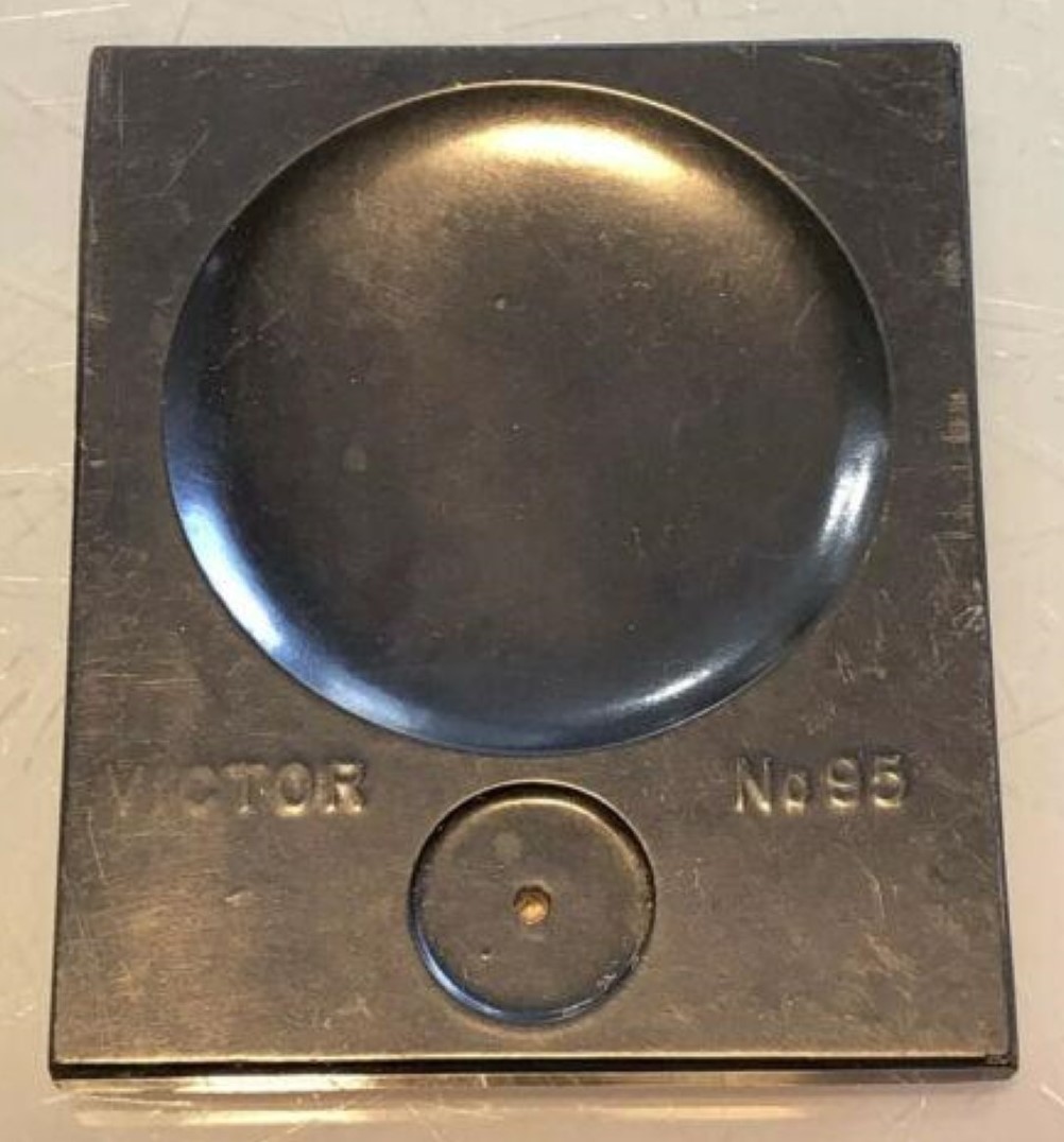 This pressed glass inkstand has two ink reservoirs. Each well has a top cover that slides open to allow access to the ink. One cover is red and the other is black. The covers, made of hard rubber or resin, are marked “Victor No. 95” on the top, and “KH & Co New York, Made in the USA” on the underside. KH & Co is Kimpton, Haupt & Co. (formed circa 1911).