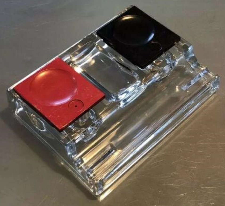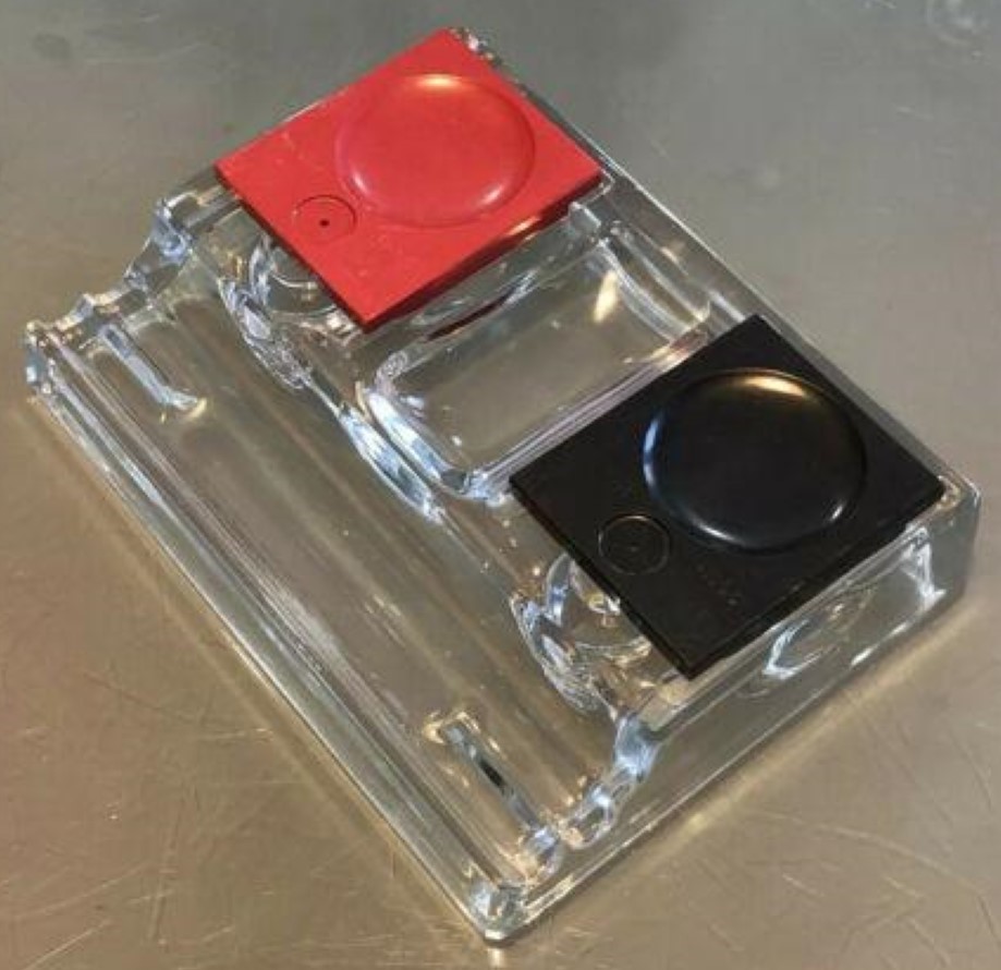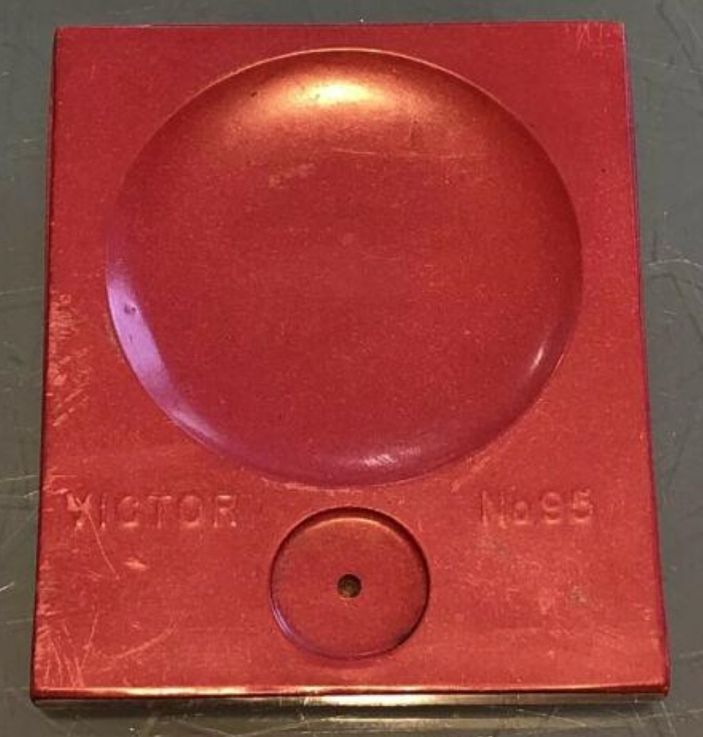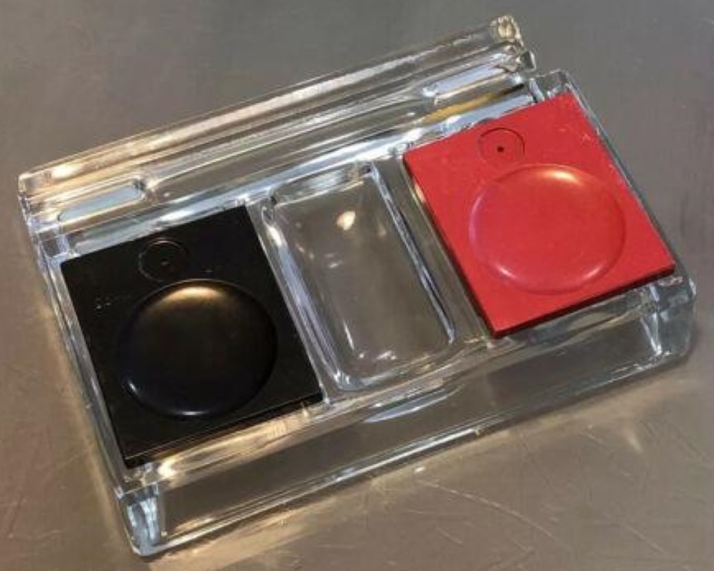 This pressed glass inkstand has two ink reservoirs. Each well has a top cover that slides open to allow access to the ink. One cover is red and the other is black. The covers, made of hard rubber or resin, are marked “Victor No. 95” on the top, and “KH & Co New York, Made in the USA” on the underside. KH & Co is Kimpton, Haupt & Co. (formed circa 1911).