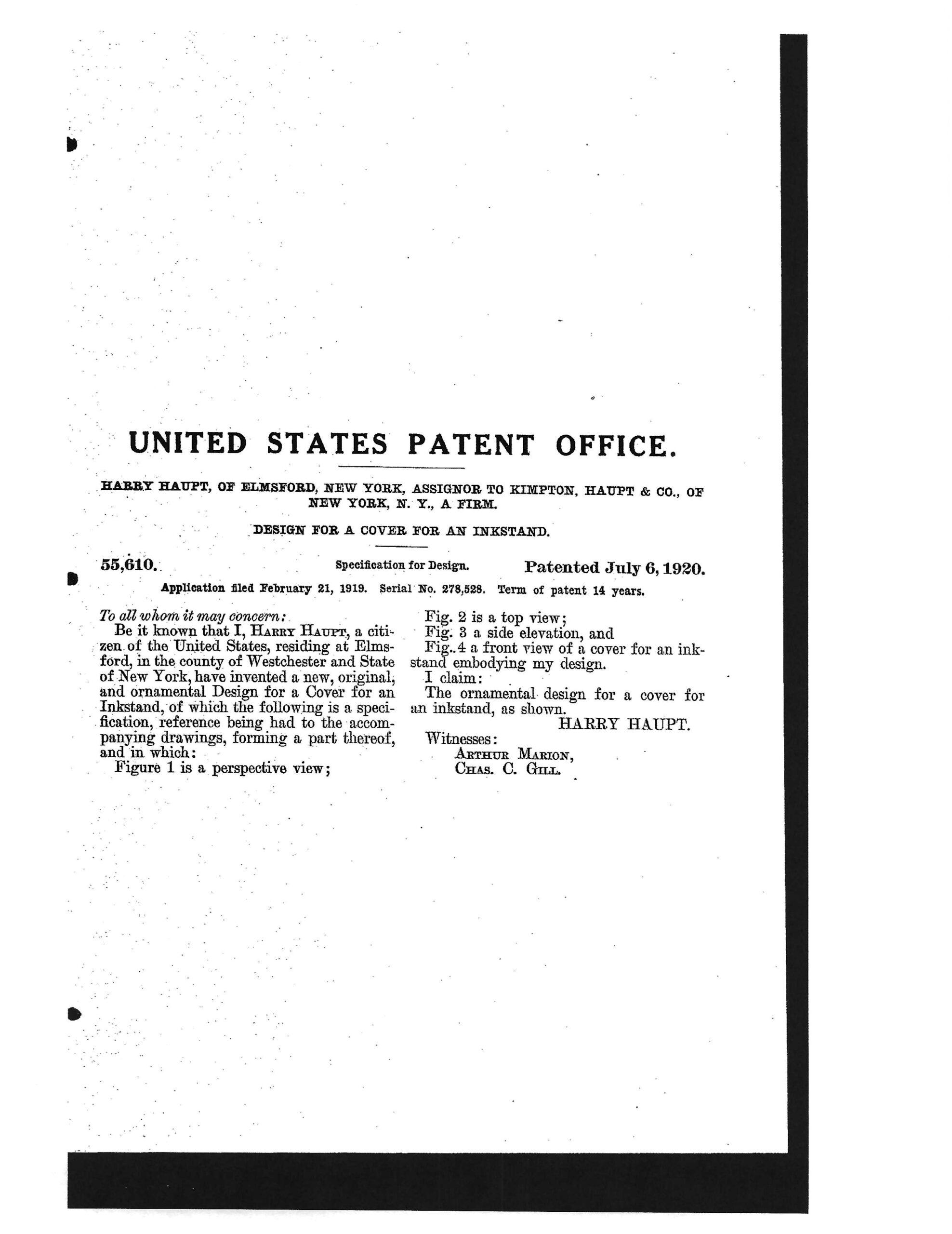 | Patent | Design Patent 55,610 Patented July 6, 1920 |