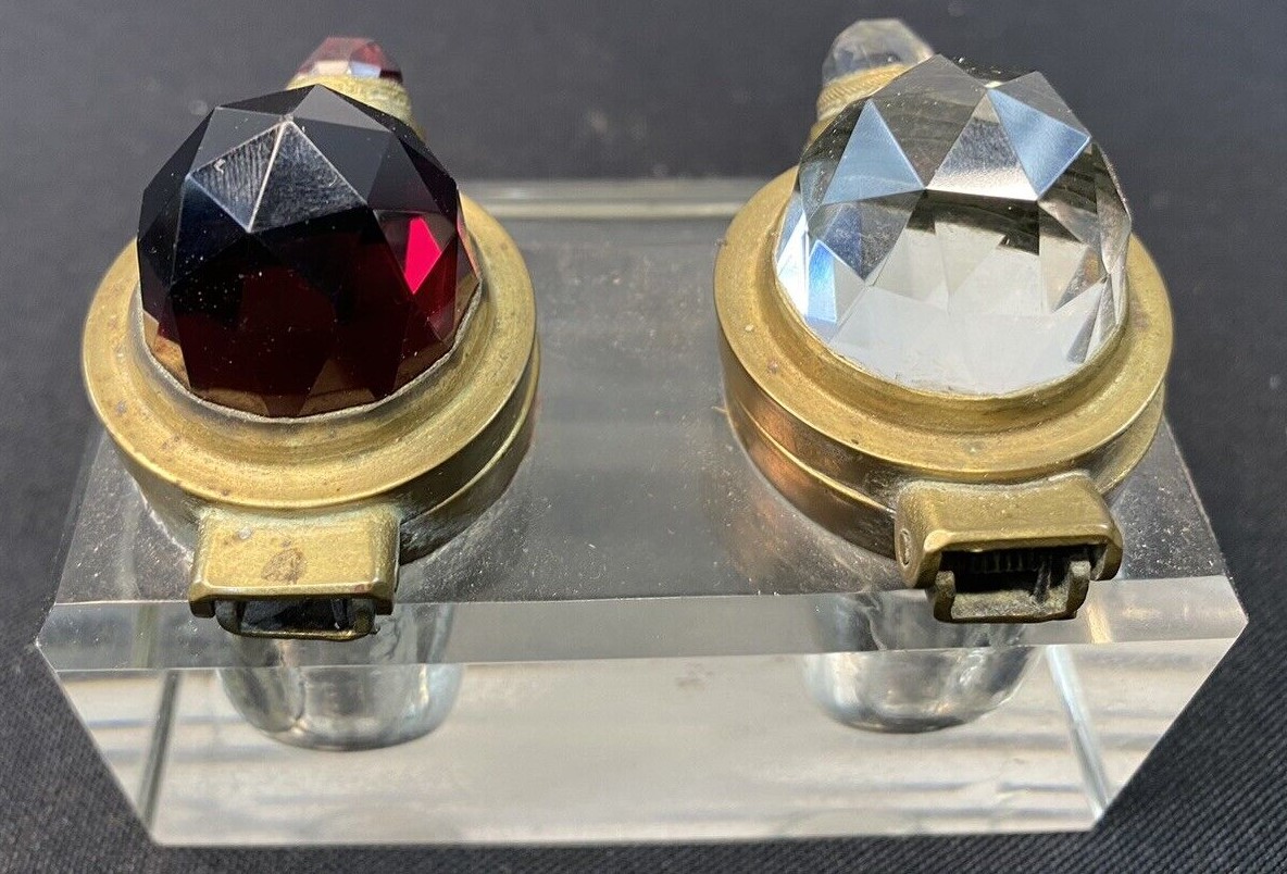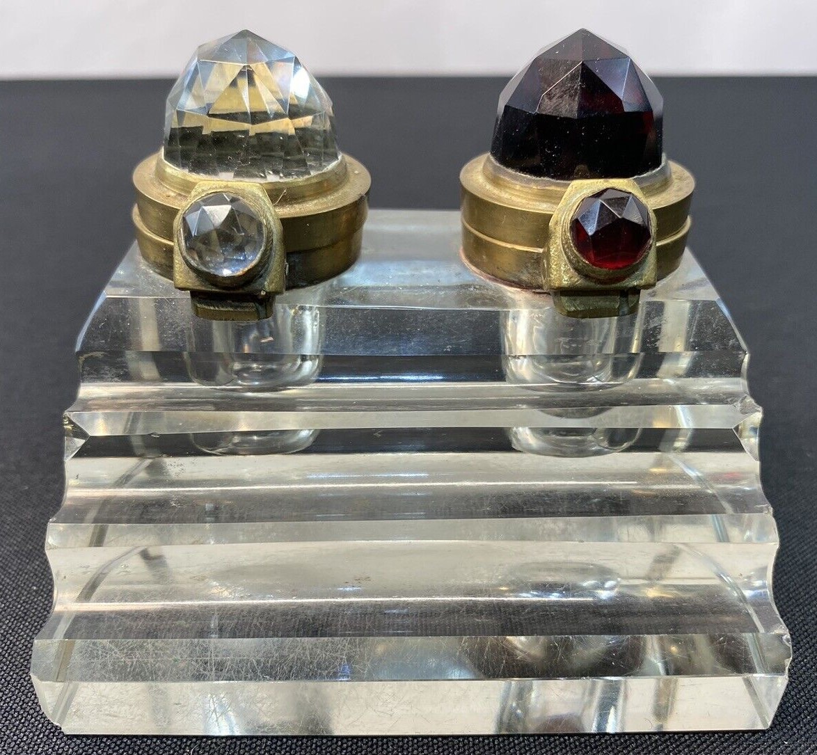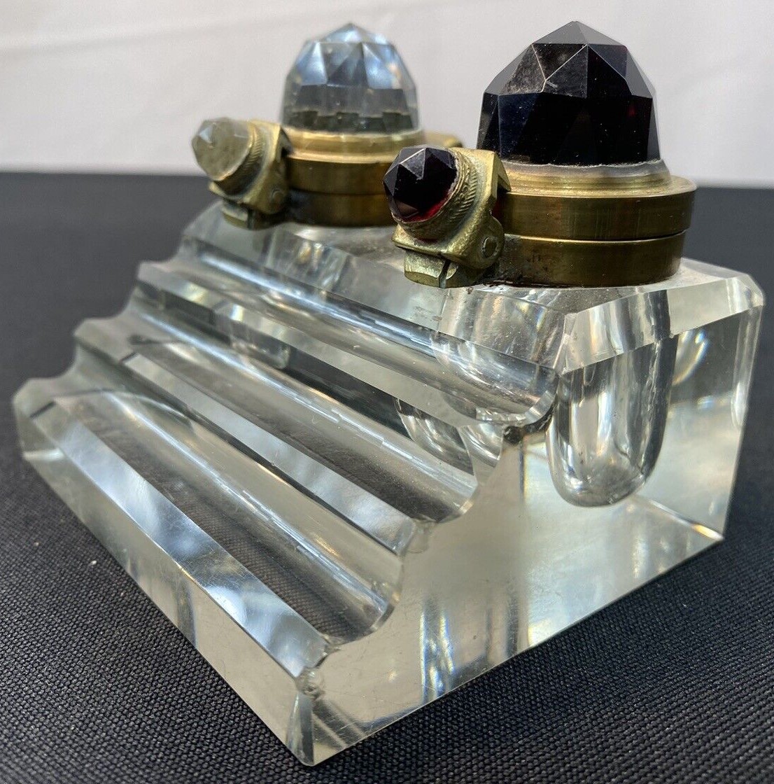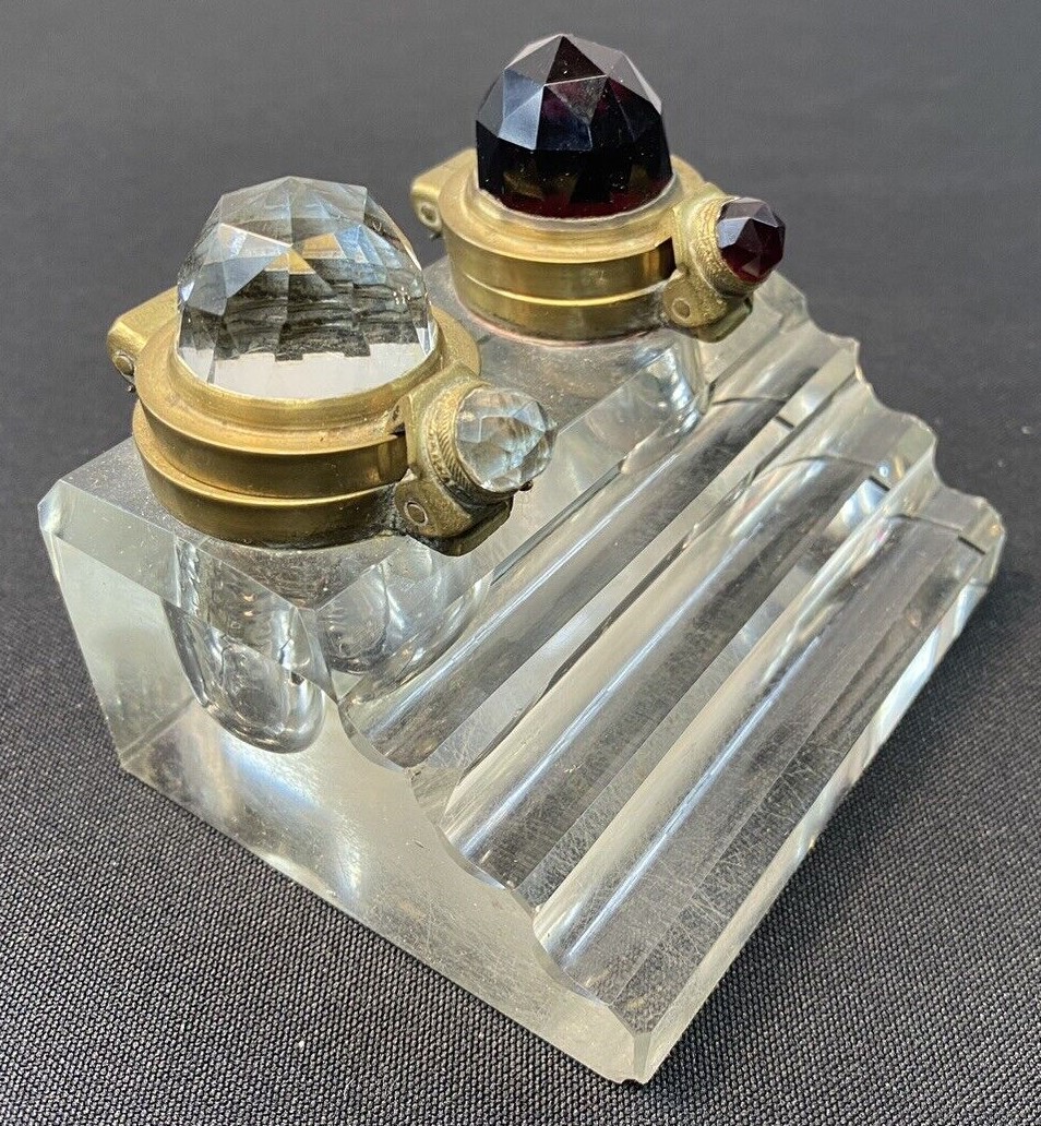 The lids for this pressed glass double inkstand with a three-step pen holder are unusual. Brass mounted, each lid has a faceted glass “jewel” (one red, one clear) to distinguish the type of ink in the well.