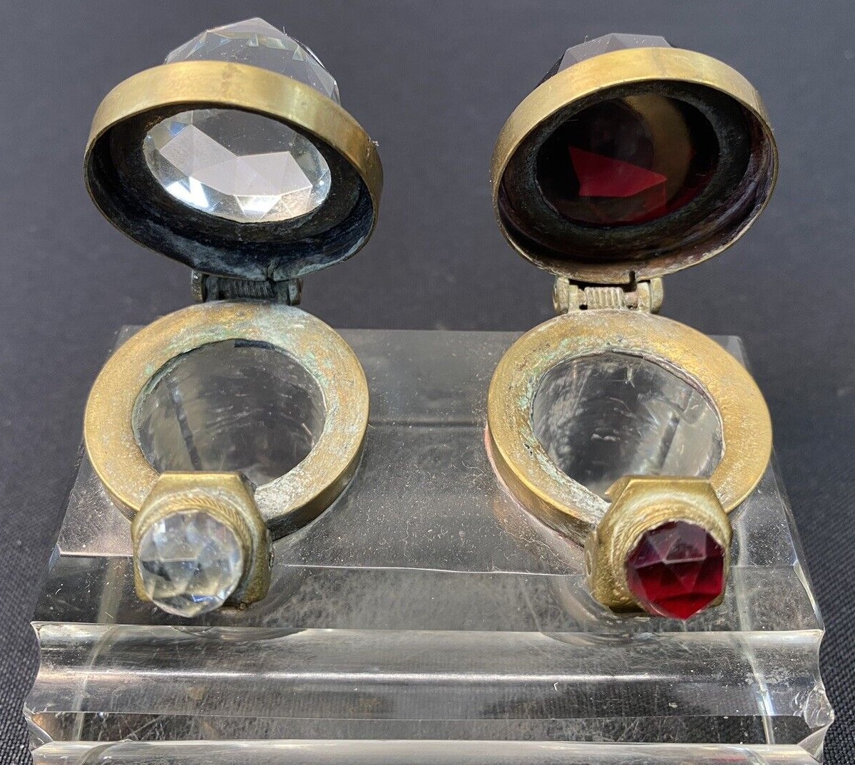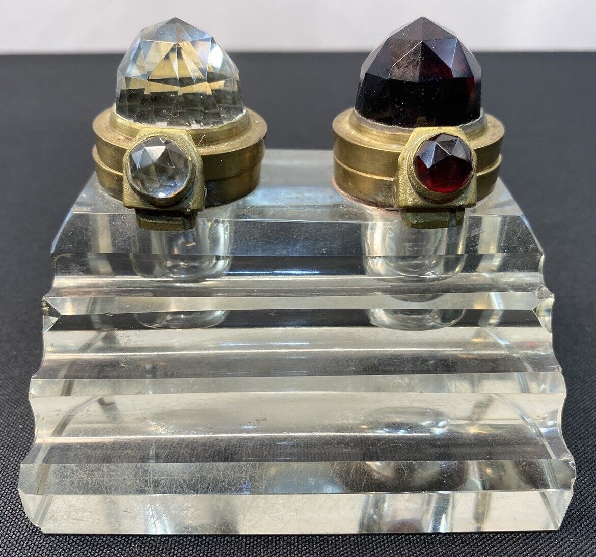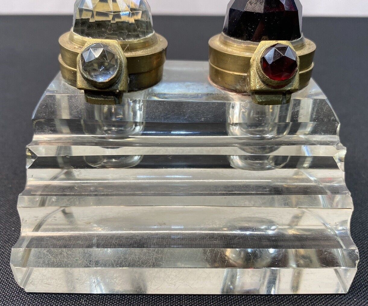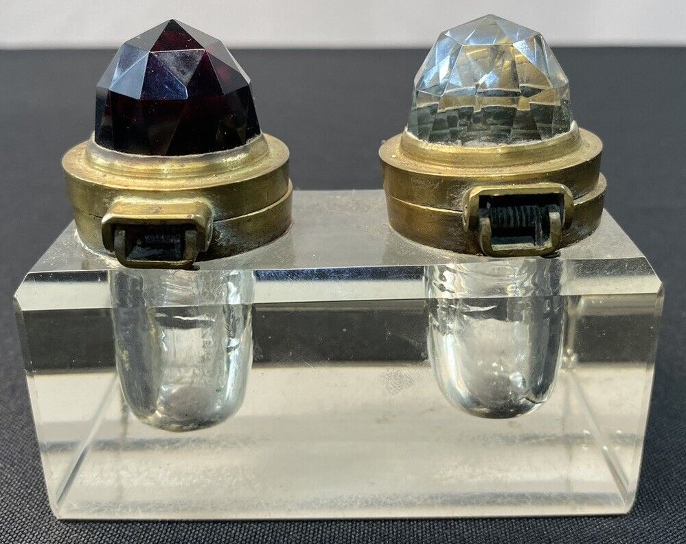 The lids for this pressed glass double inkstand with a three-step pen holder are unusual. Brass mounted, each lid has a faceted glass “jewel” (one red, one clear) to distinguish the type of ink in the well.