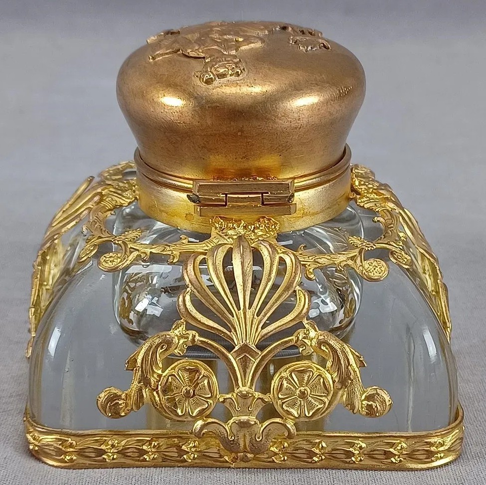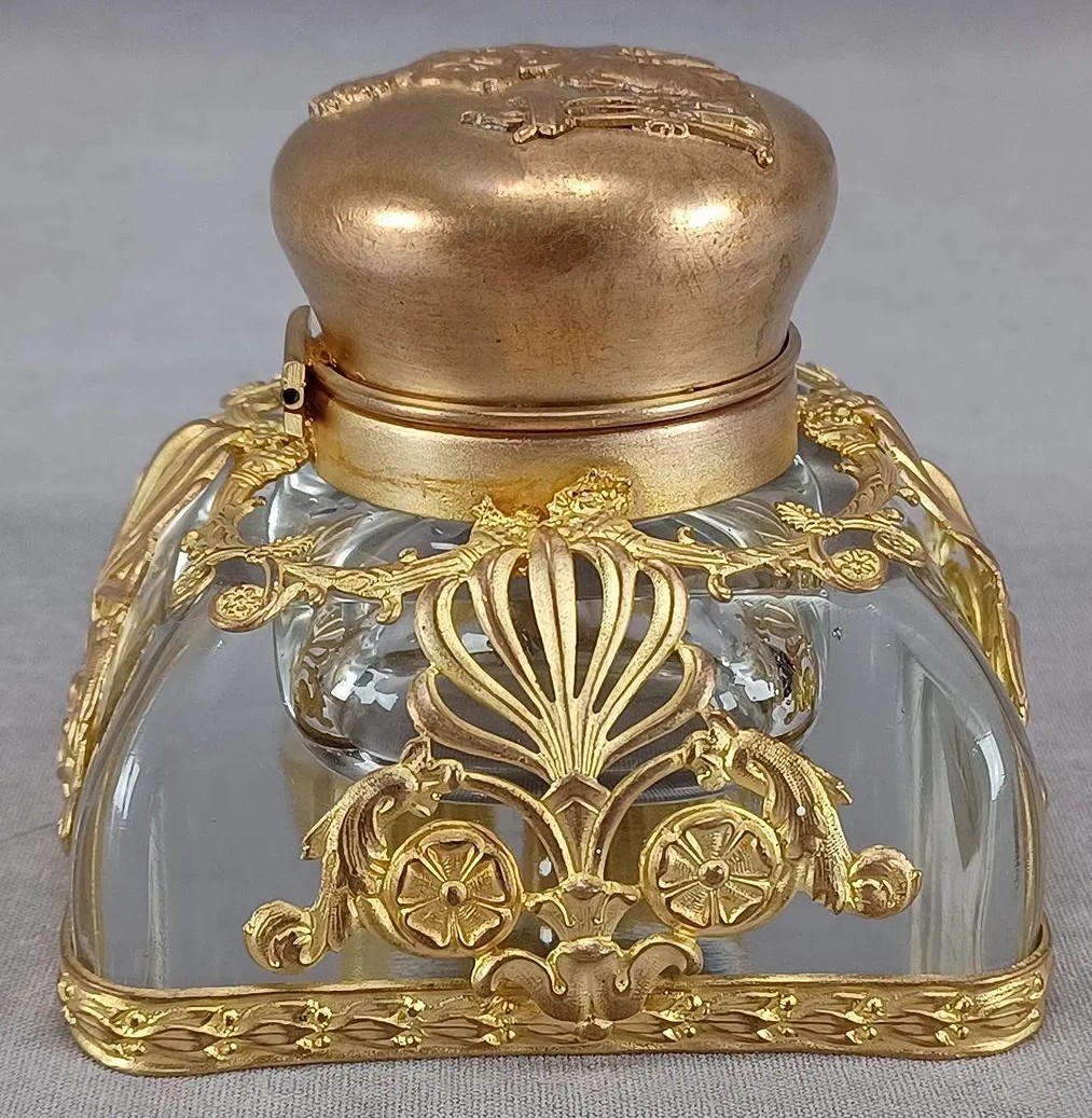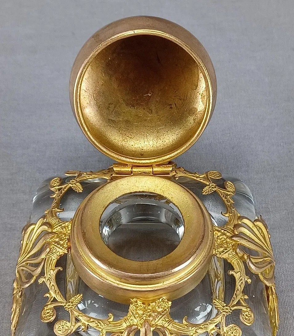 • Ormolu and Gilt Brass: The use of ormolu (gilt bronze) was a hallmark of high-end French decorative arts. Its application here, encasing a separate glass component, is consistent with French craftsmanship.