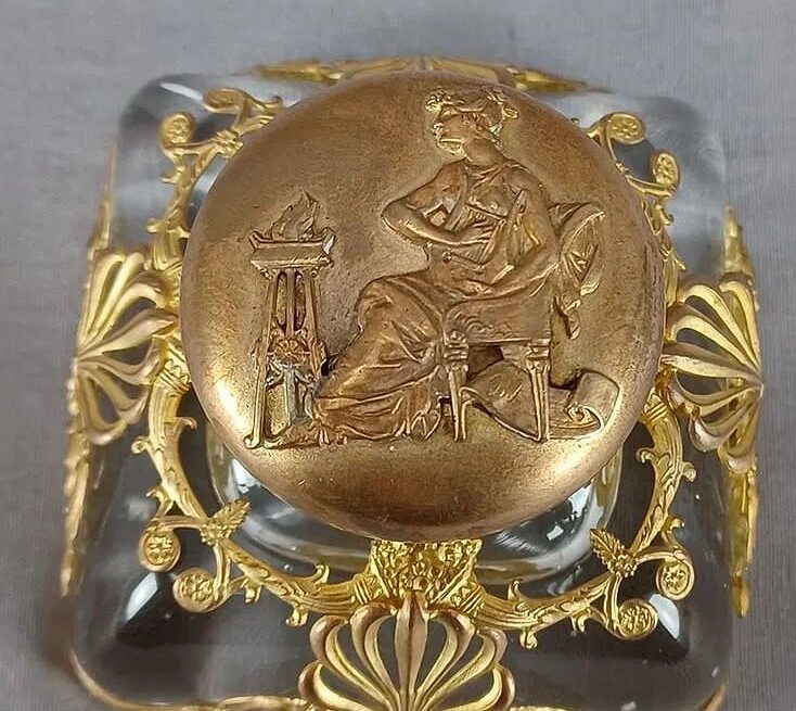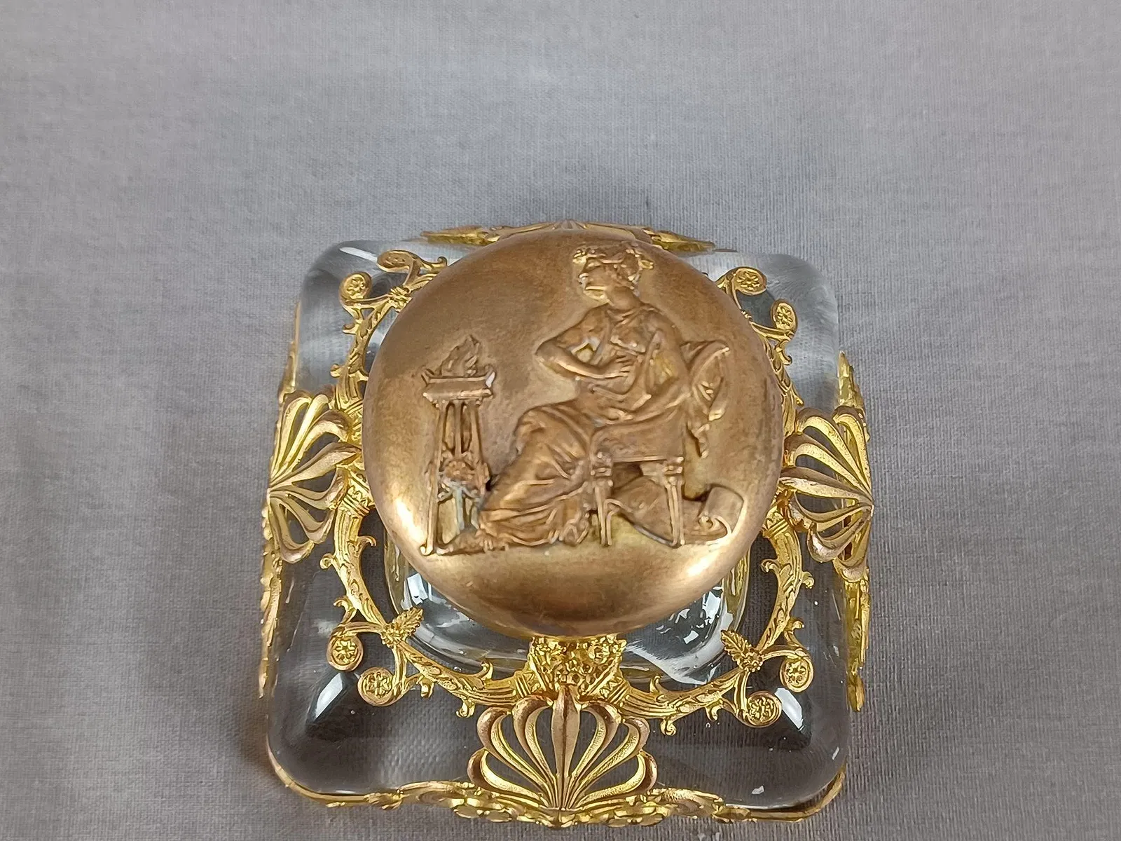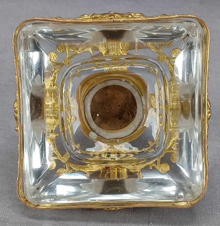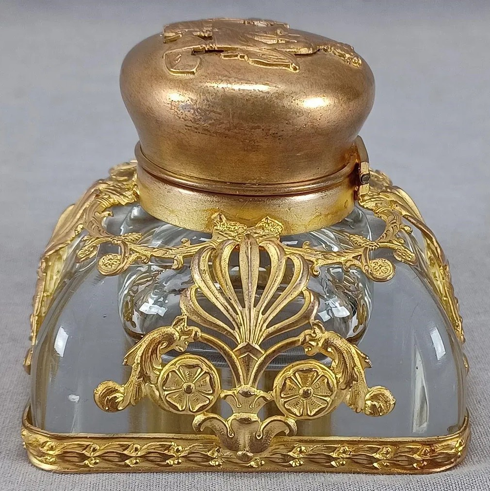 • Ormolu and Gilt Brass: The use of ormolu (gilt bronze) was a hallmark of high-end French decorative arts. Its application here, encasing a separate glass component, is consistent with French craftsmanship.