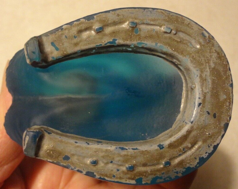 Made of satin blue glass, the bottom of this inkwell is in the form of a horse’s hoof, shod with a horseshoe. The hinged lid is in the form of a jockey’s cap.