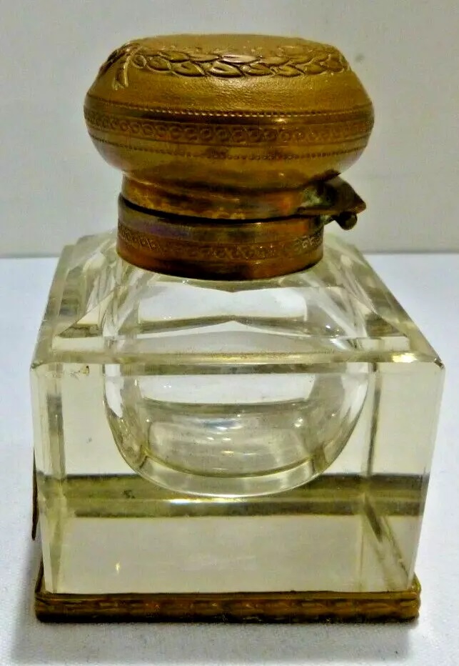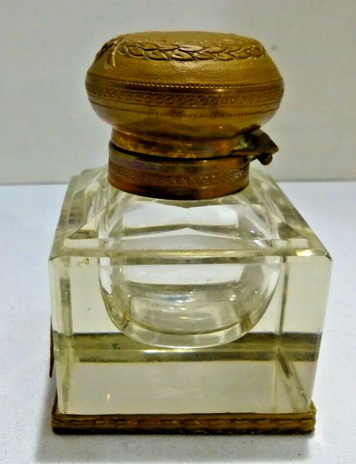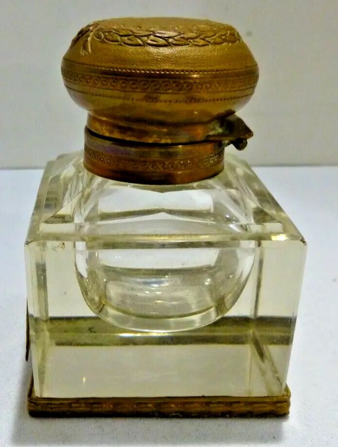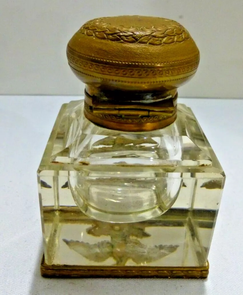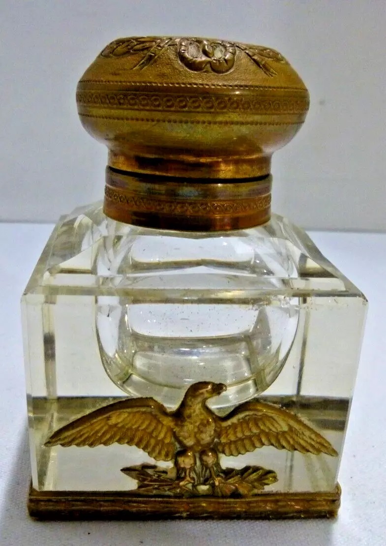 A square glass inkwell with an ornate brass lid with a wreath design. There is brass trim around the bottom and an embossed figure of an eagle with its wings spread.