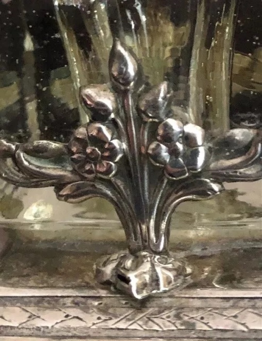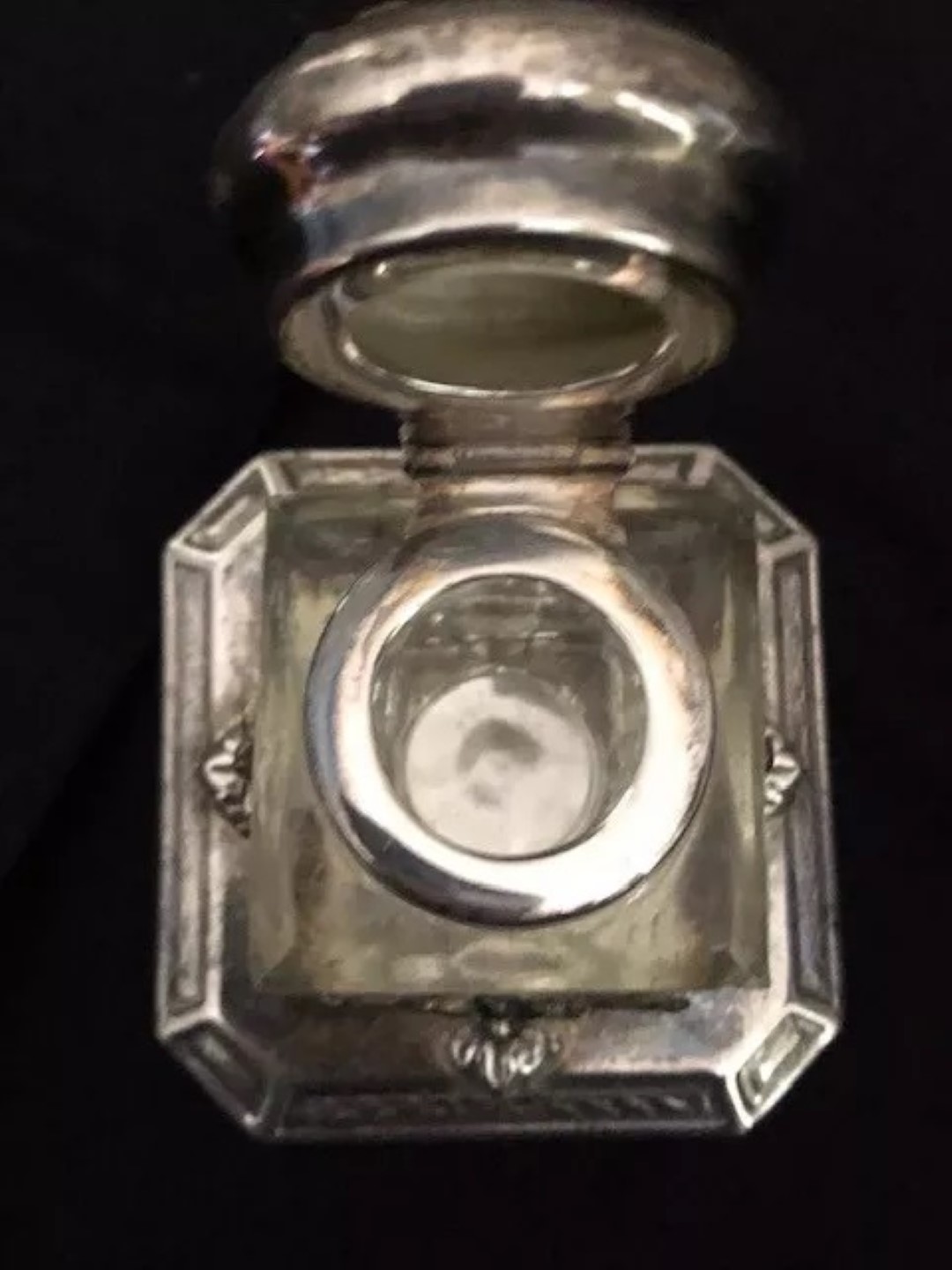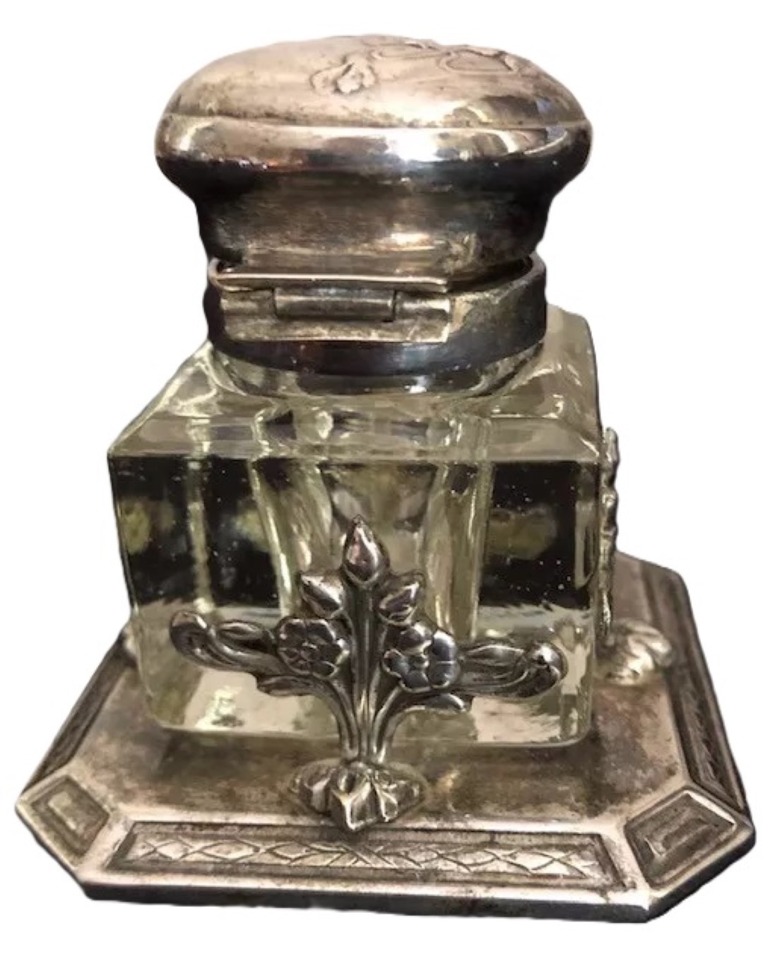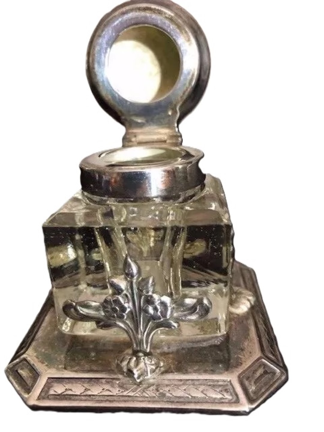 This is a glass inkwell set on a silverplated base with octagonal edges. The inkwell is square with faceted sides. The lid, also silverplated, has a rounded top. The base features an ornate floral emblem, likely a stylized fleur-de-lis.