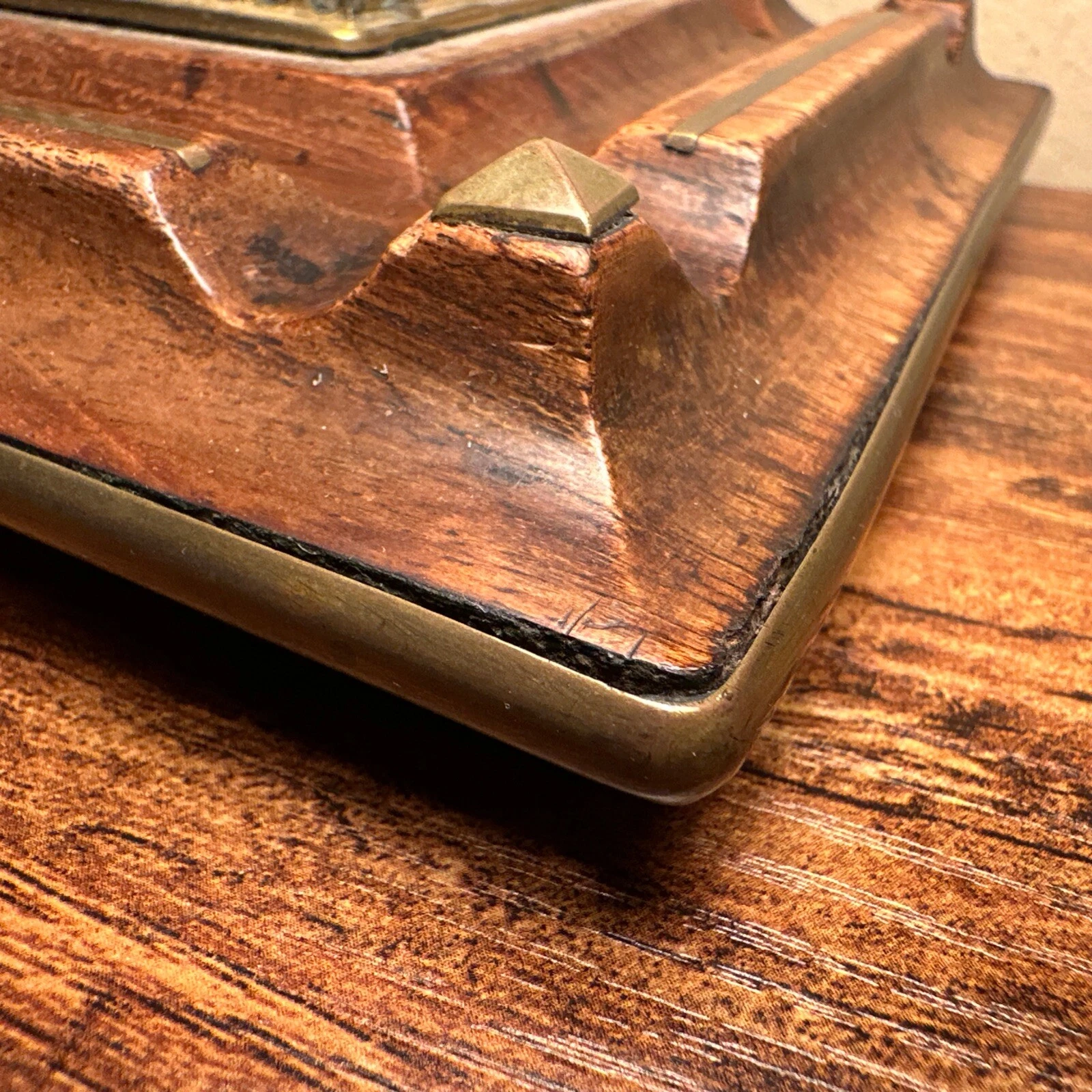 • Edge Binding: The very bottom edge of the wooden base is wrapped in a thin brass trim, protecting the wood and tying the metallic elements together.