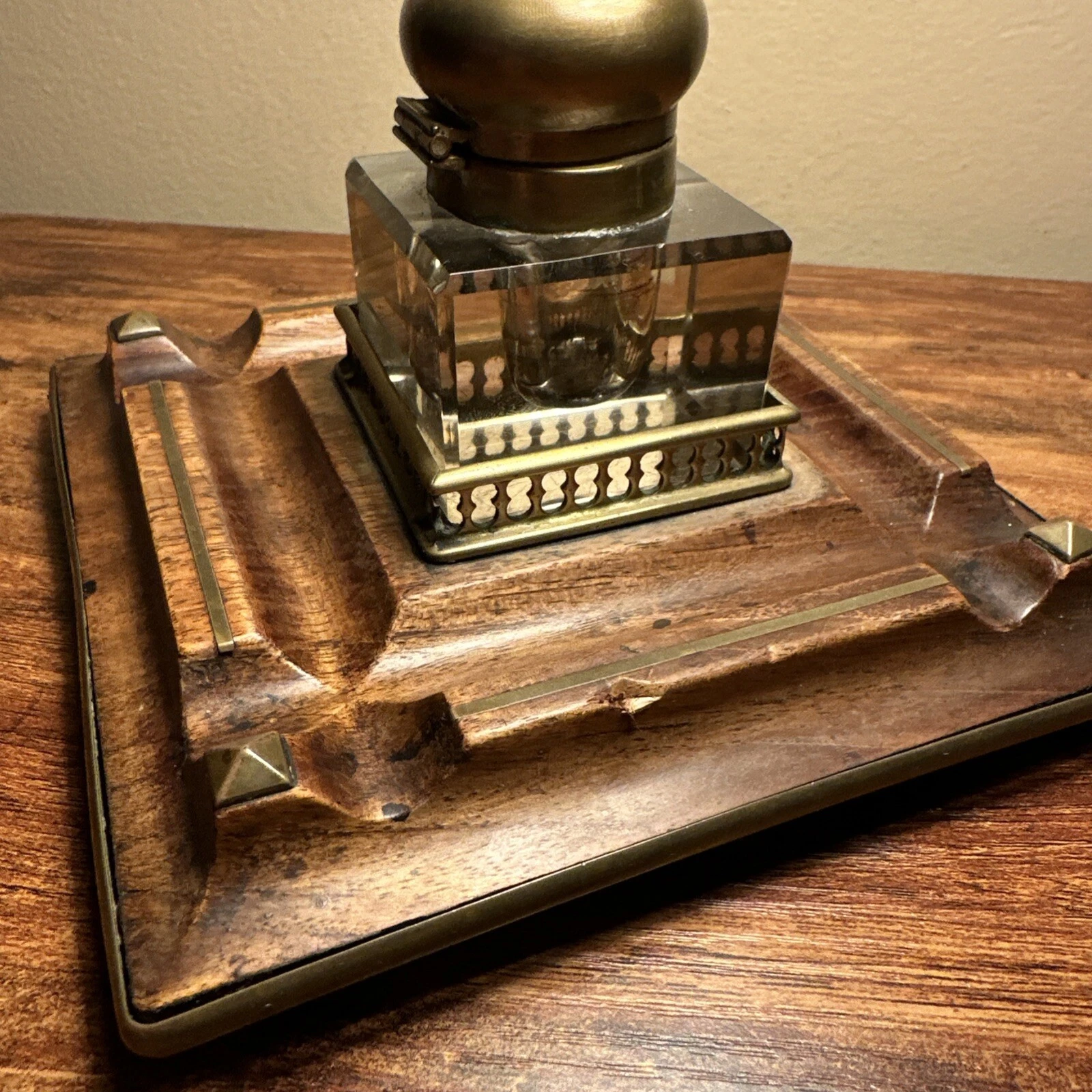 • The Gallery: The inkwell sits securely within a pierced brass gallery (or caddy). This frame features a repetitive keyhole or teardrop cutout pattern.