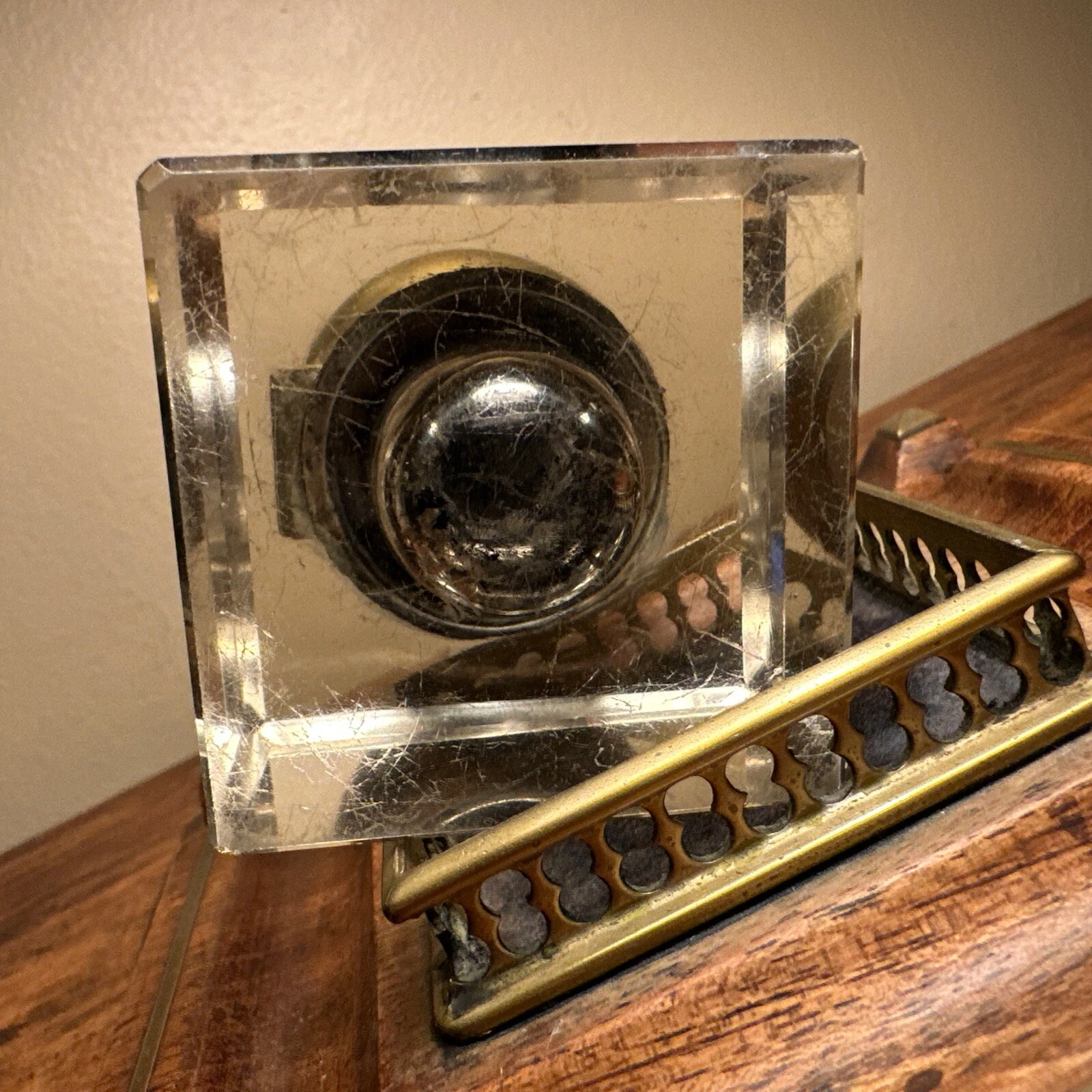 • Form & Material: The inkwell is a thick, square block of clear, polished glass with beveled edges. The interior reservoir, visible through the heavy glass, shows a rounded, bulbous well.