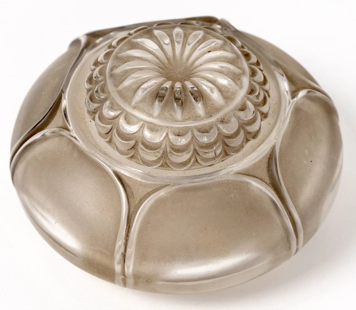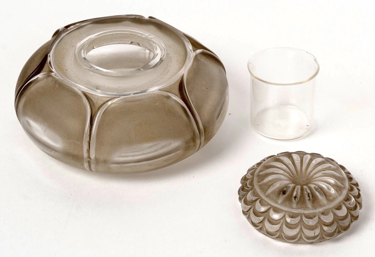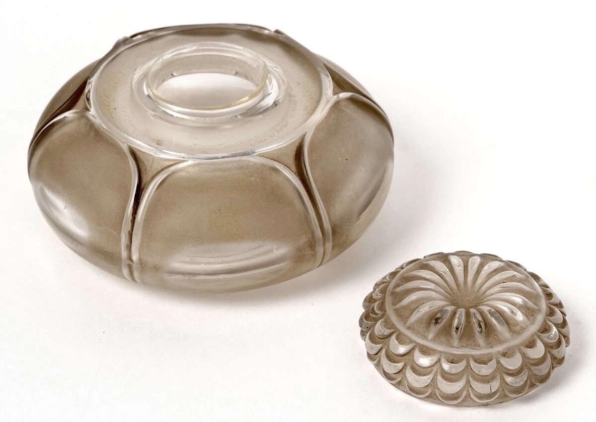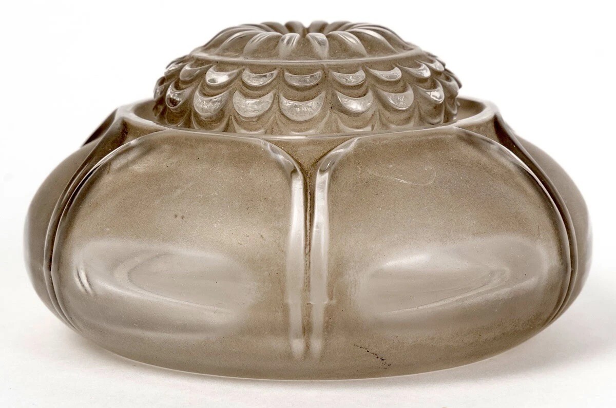 - The Lid: The lid features a complex, overlapping scalloped petal pattern. When viewed from above, it forms a perfect sunburst of petals, a hallmark of Lalique’s obsession with botanical geometry.