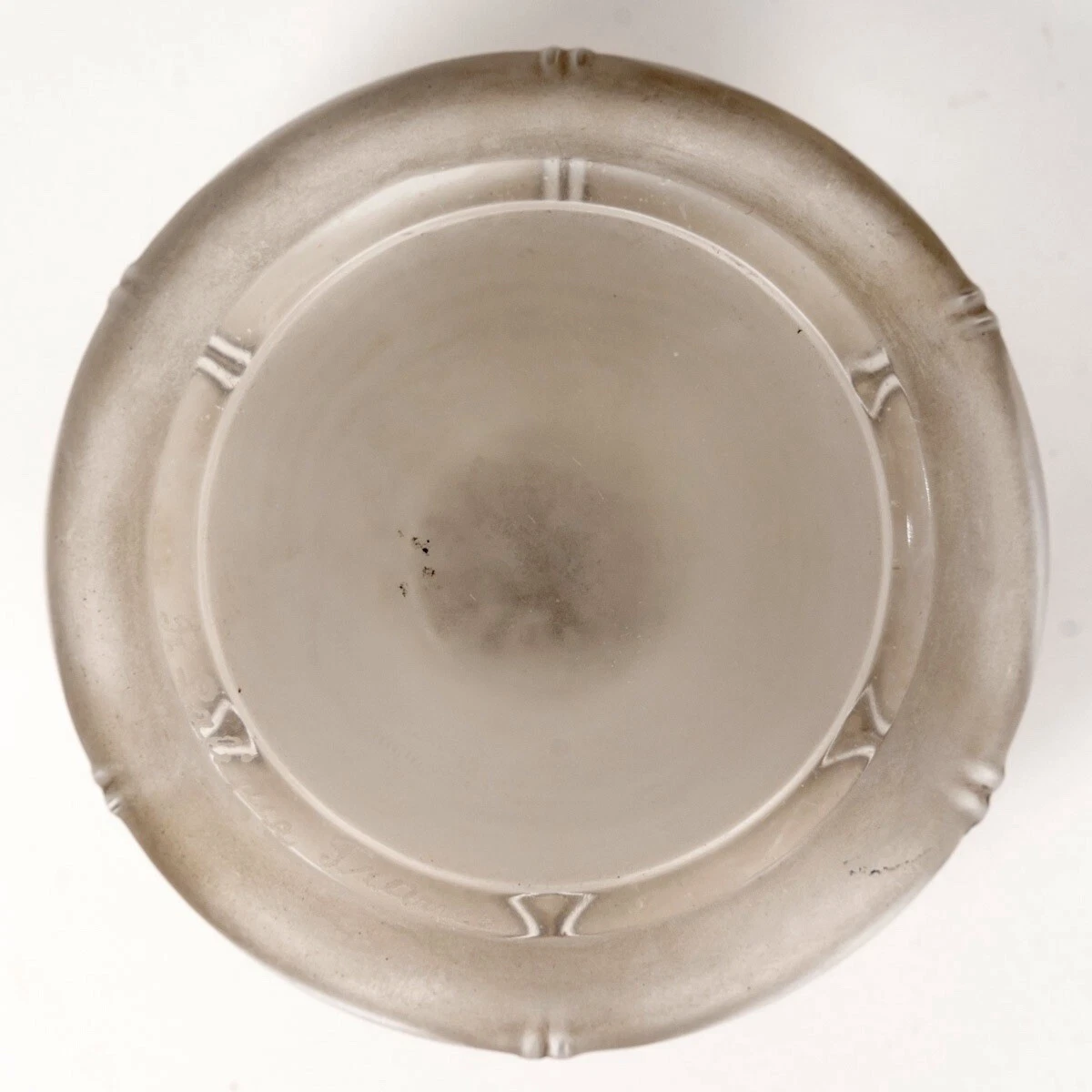 Because this design was introduced in 1910, it marks the very beginning of Lalique’s full-time transition into glassware. The “Nénuphar” was not just a desk accessory; it was an experiment in molded glass geometry. The gray patina you see was achieved by wiping an oil-based pigment into the recessed lines of the frosted glass—a technique that remains a signature element of the house’s “early period” aesthetic.