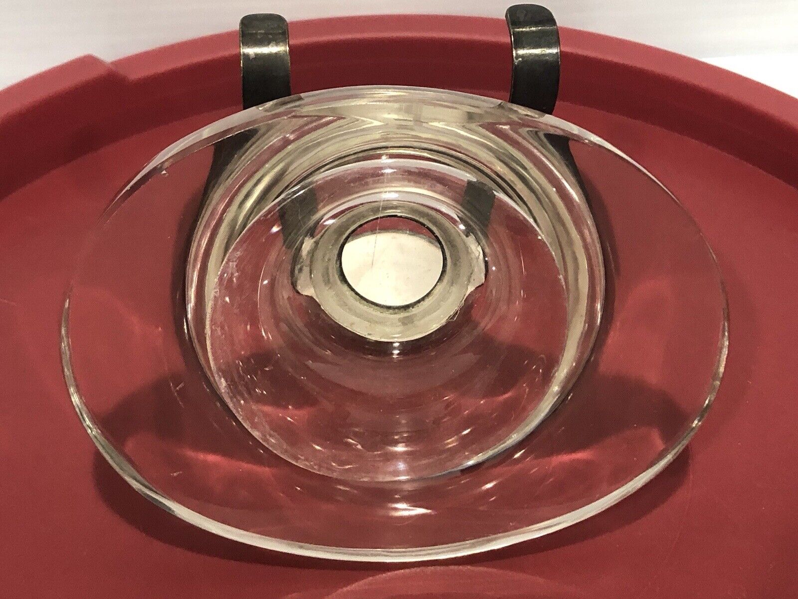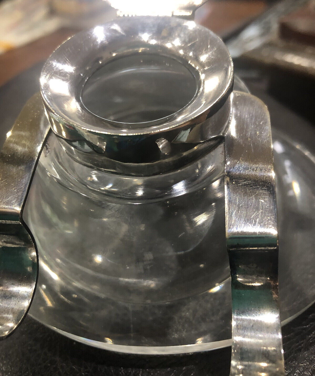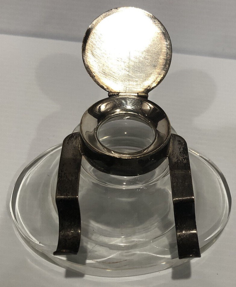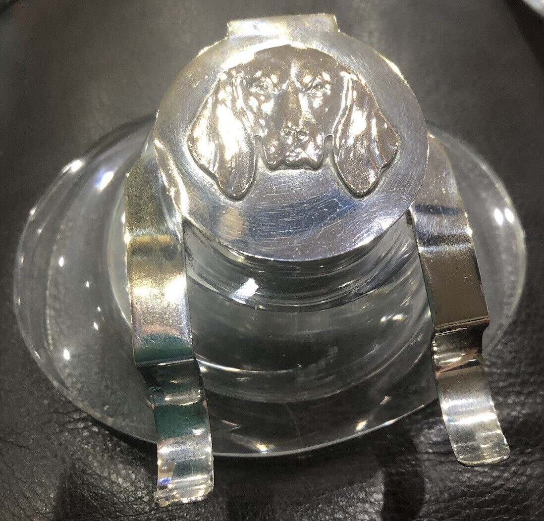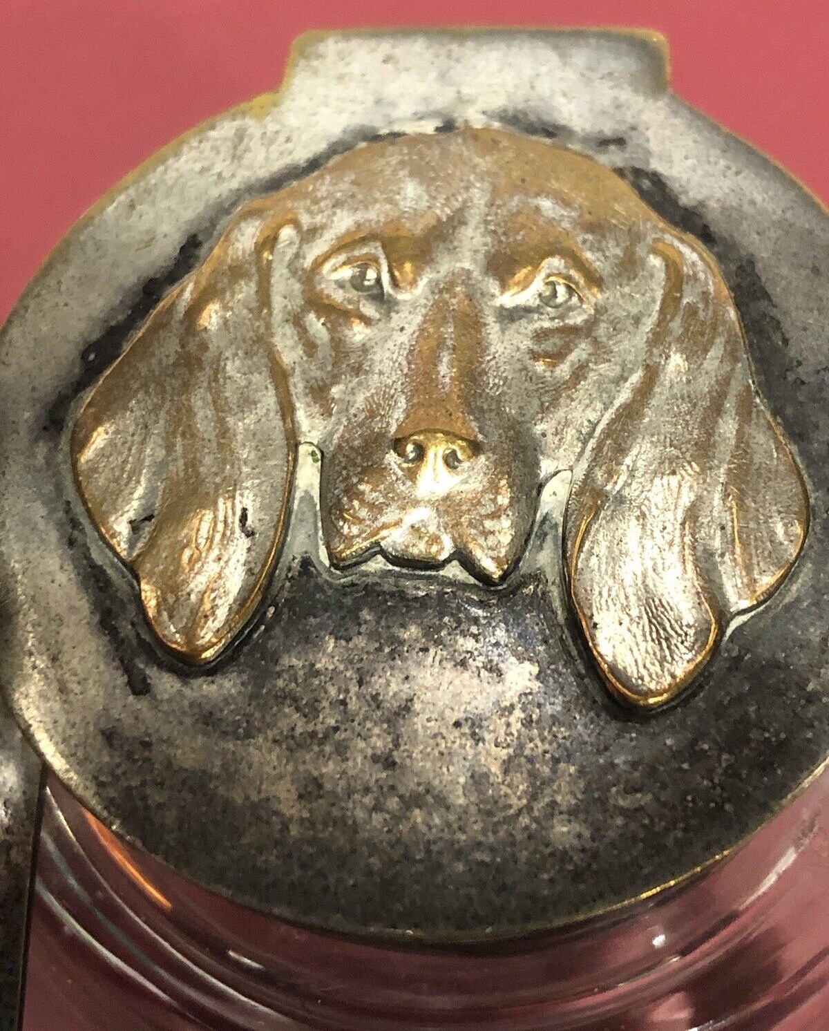 The head of a hound dog in silver relief comprises the lid of this glass inkwell with pen holder. Pictures show the inkwell before and after polishing the silver.