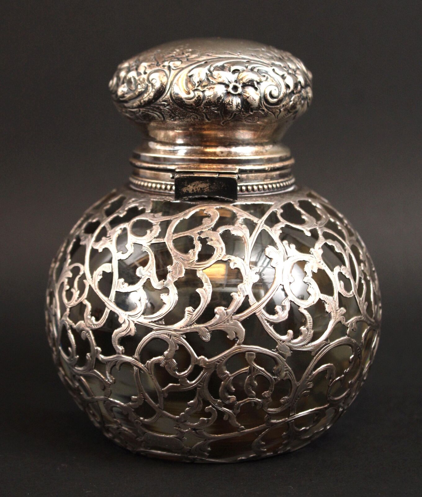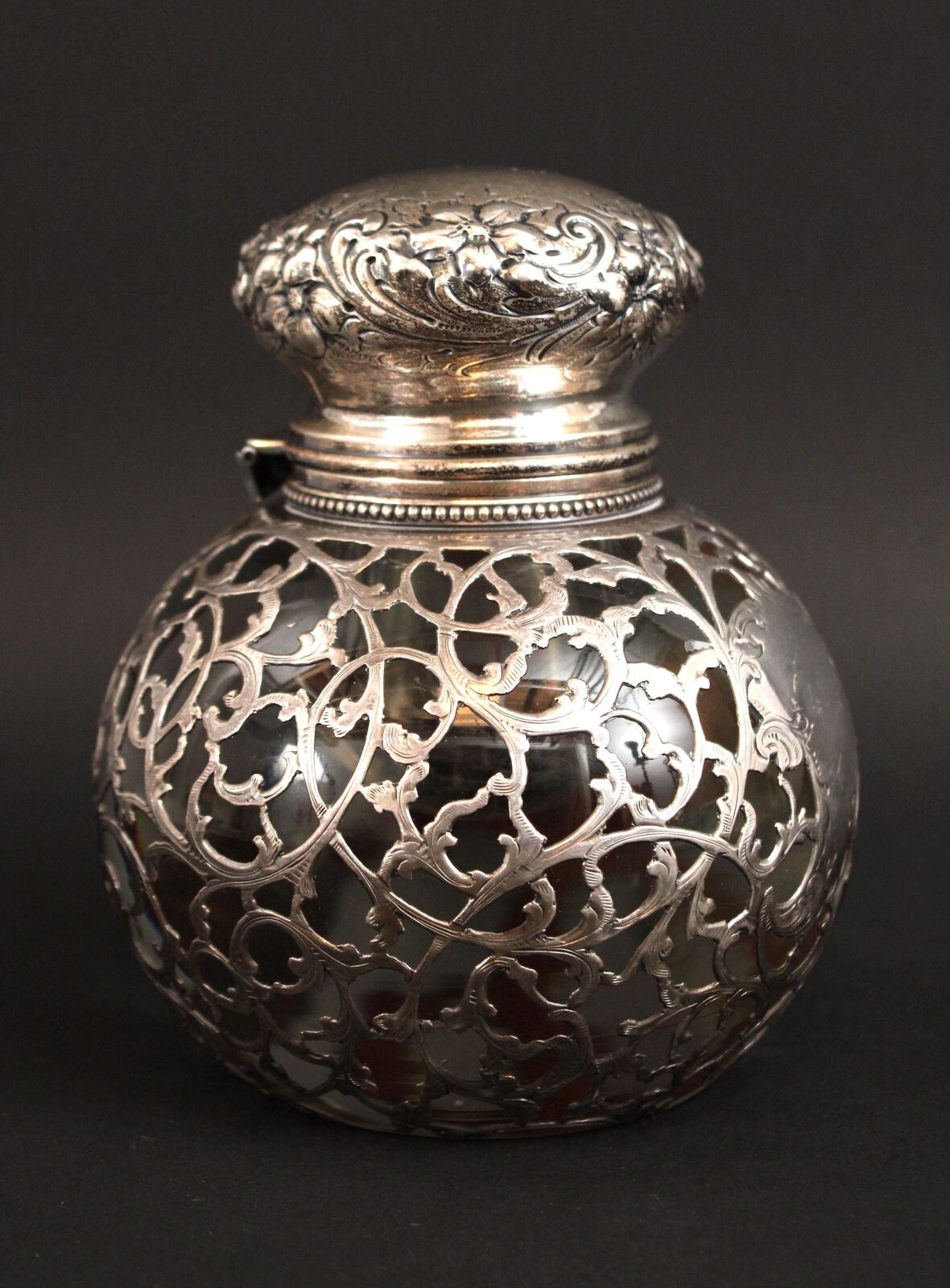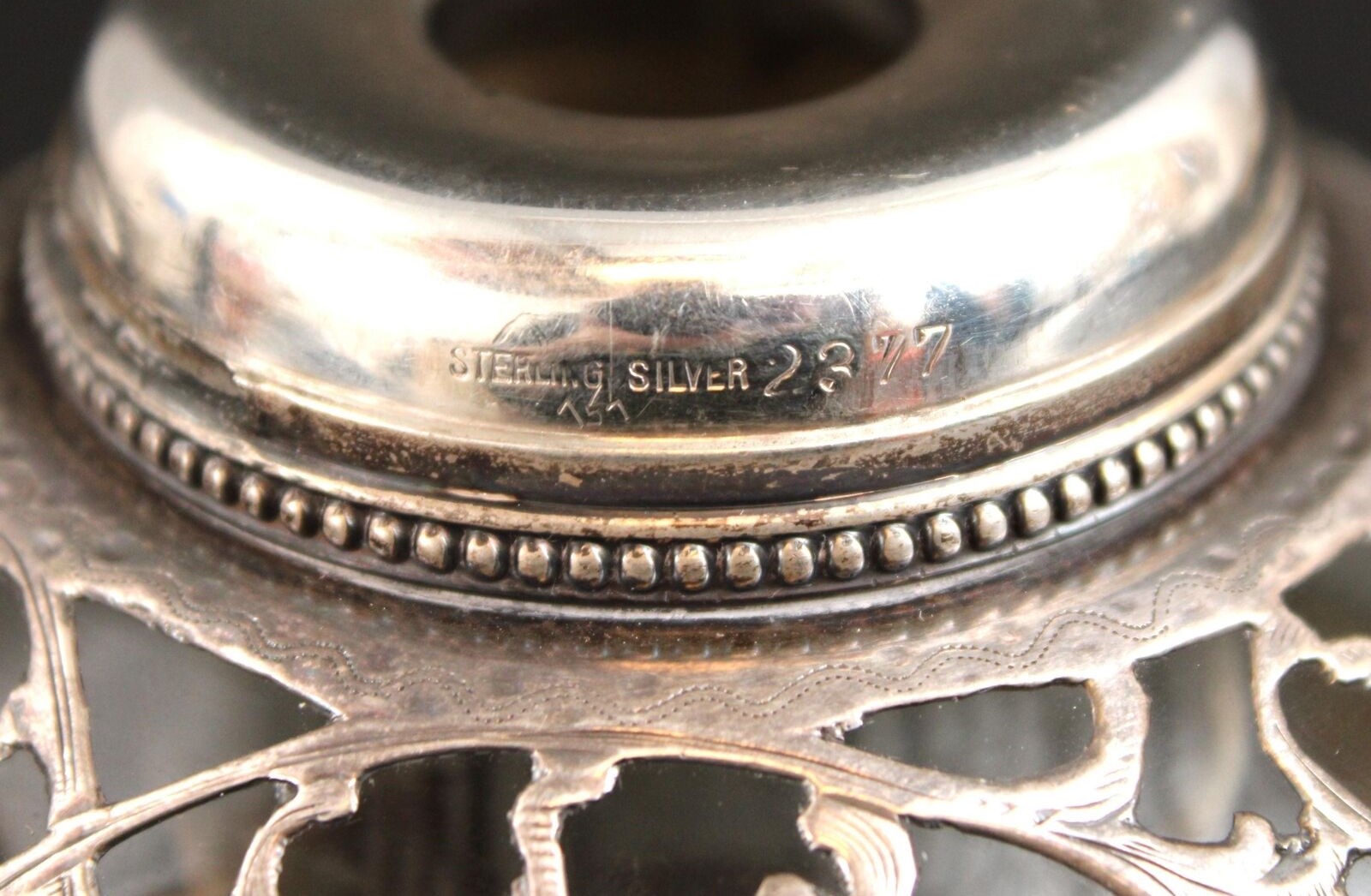 This inkwell is etched “sterling silver 2377” along the rim of the silver overlay. There is also a mark on the side of the inkwell within the openwork design that reads “Solid Silver Pat. Jan 5, 83”. The hinged cover has a sterling repousse floral design and is not monogrammed. The silver openwork depicts leafy scrollwork with hand-etched detailing and a vignette on the side that has also not been monogrammed.