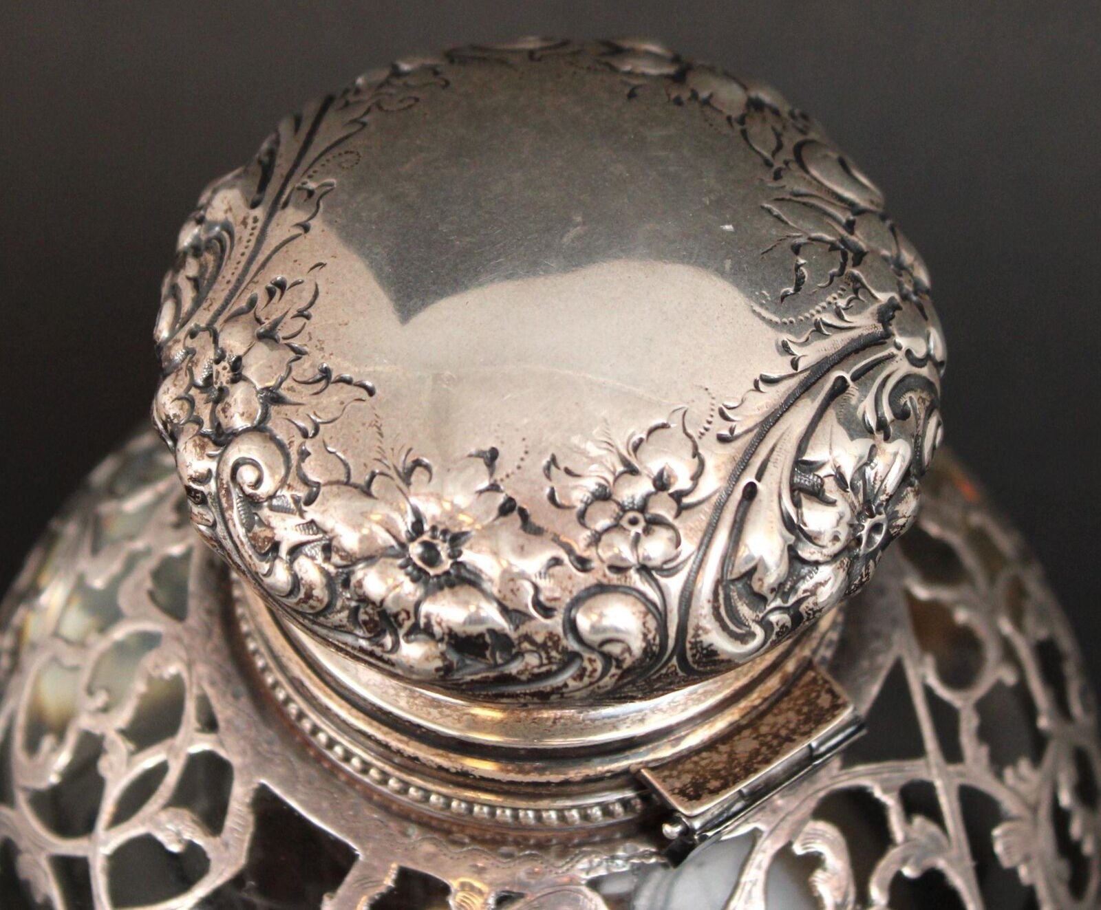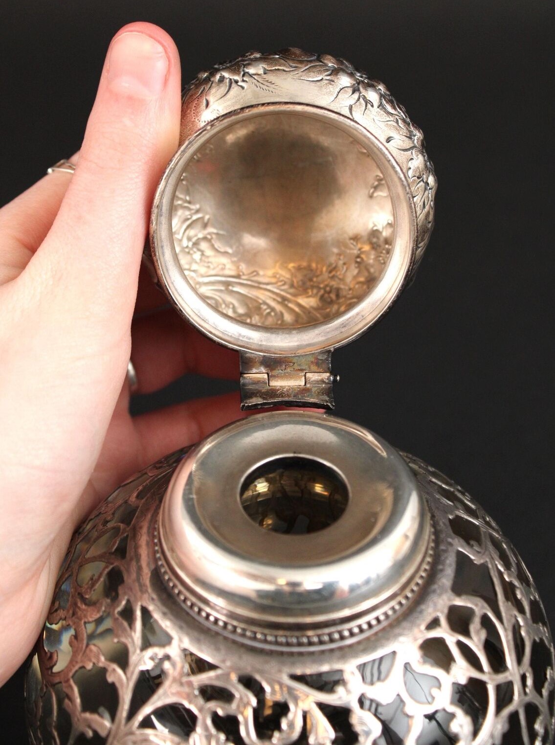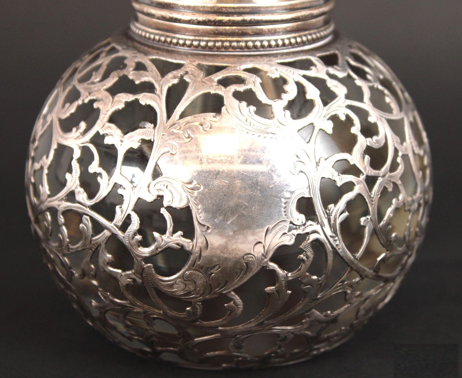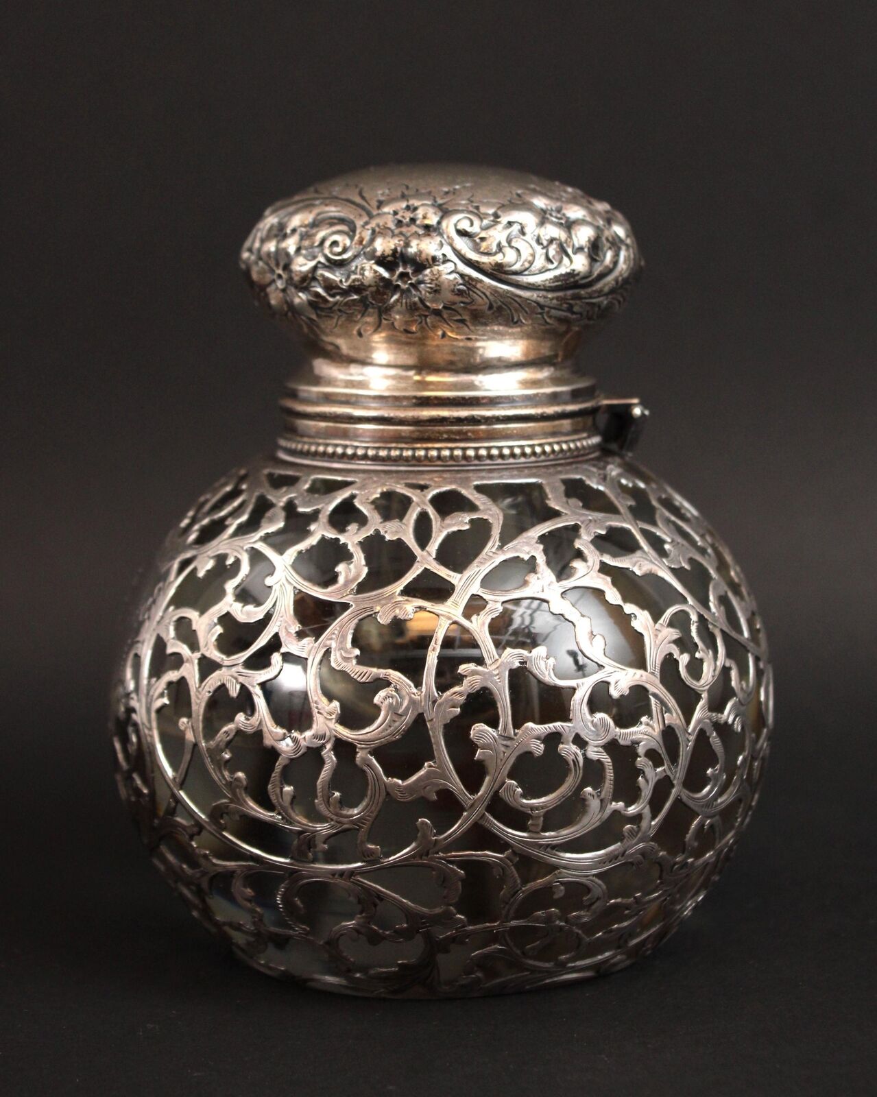 This inkwell is etched “sterling silver 2377” along the rim of the silver overlay. There is also a mark on the side of the inkwell within the openwork design that reads “Solid Silver Pat. Jan 5, 83”. The hinged cover has a sterling repousse floral design and is not monogrammed. The silver openwork depicts leafy scrollwork with hand-etched detailing and a vignette on the side that has also not been monogrammed.