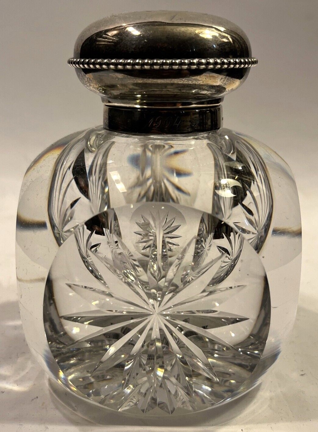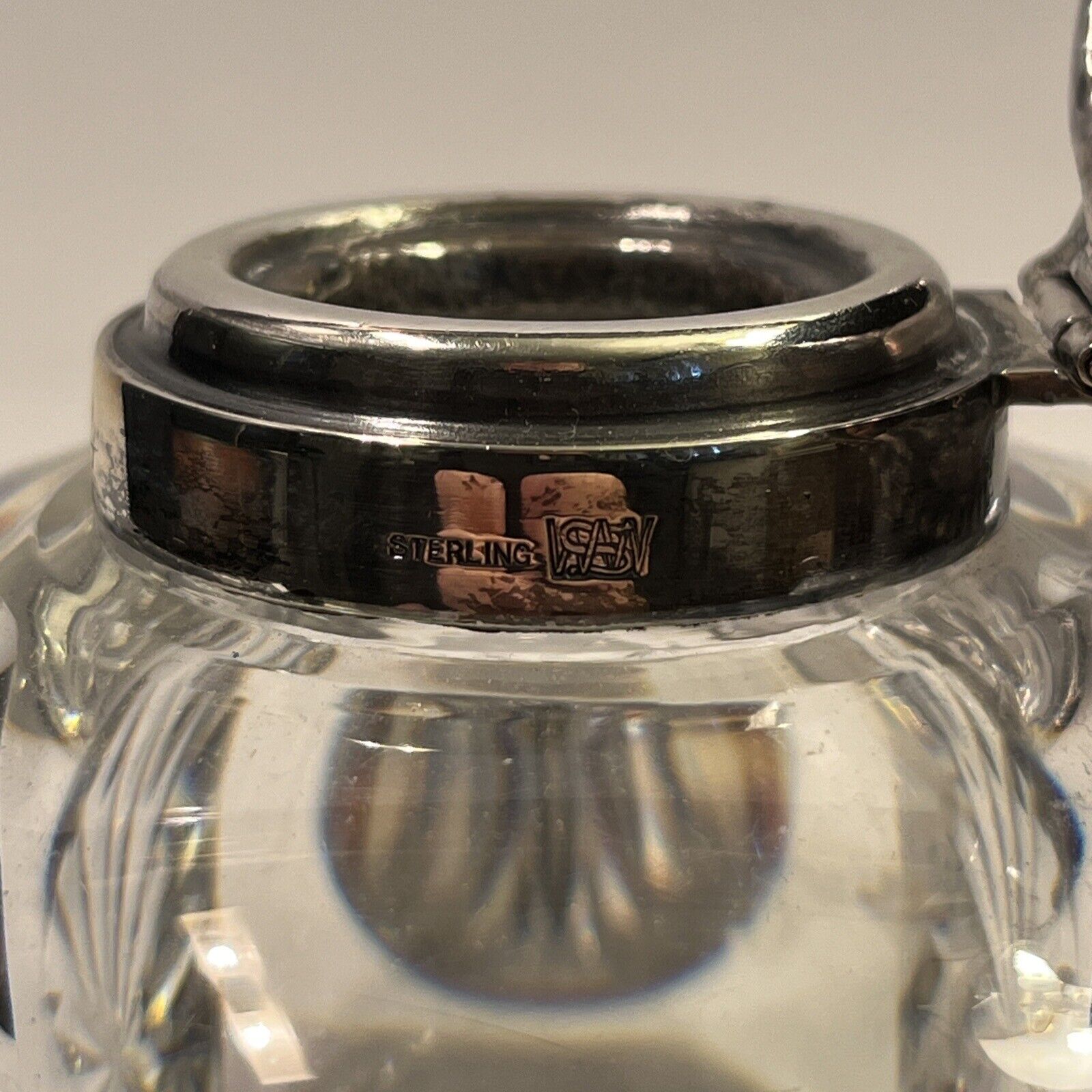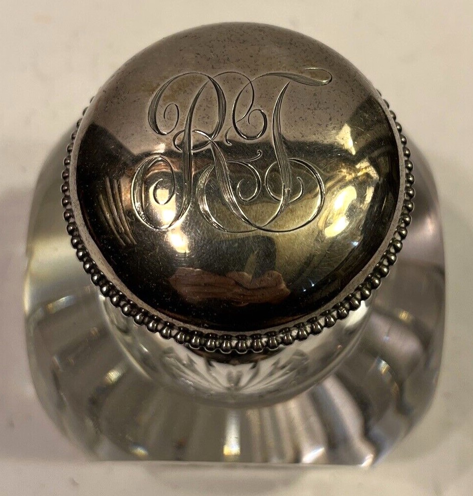 Cut glass inkwell with a hinged sterling silver lid. The sterling silver collar is engraved with “1904” and is marked “sterling”. The top of the lid is monogrammed.