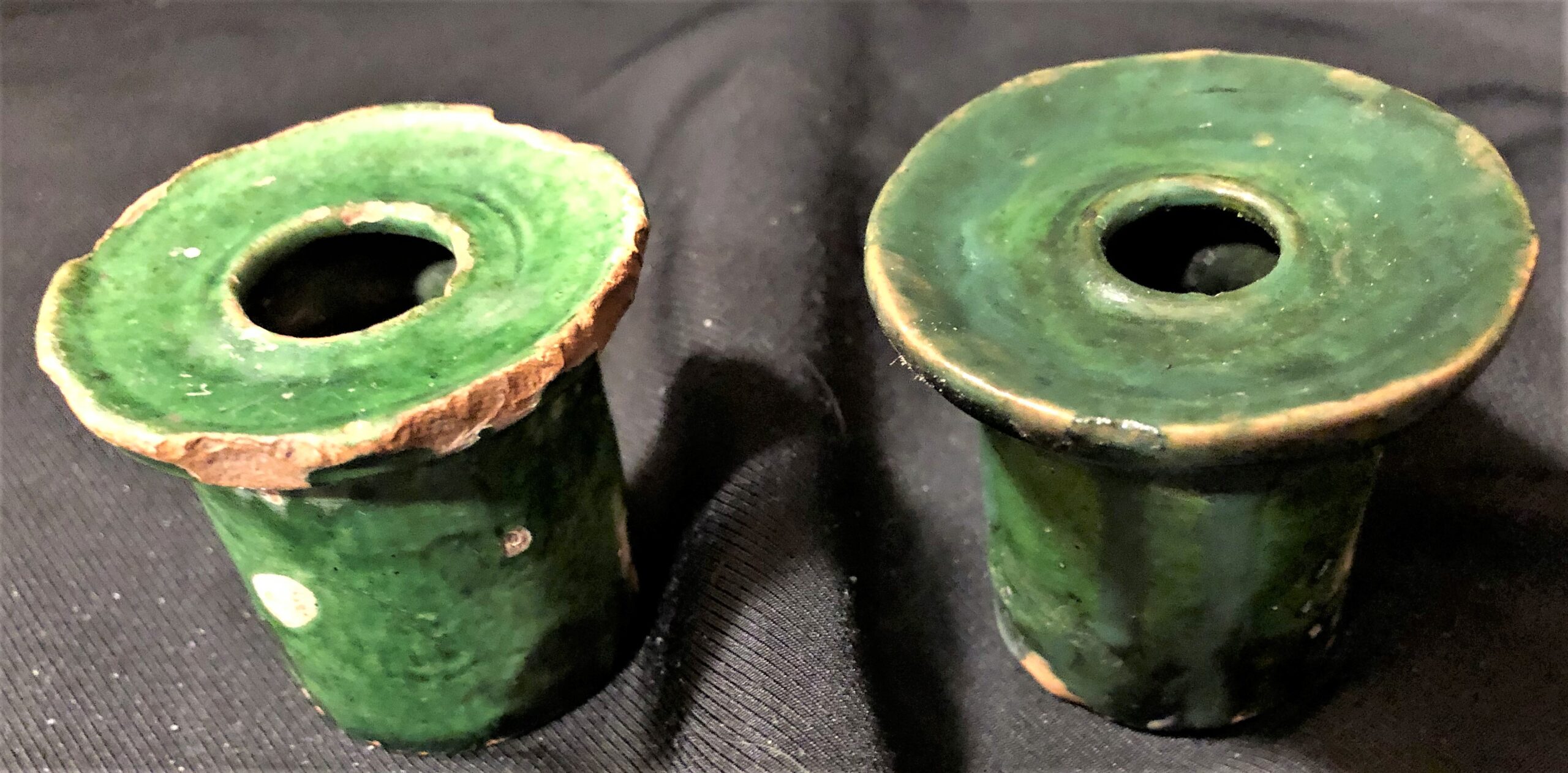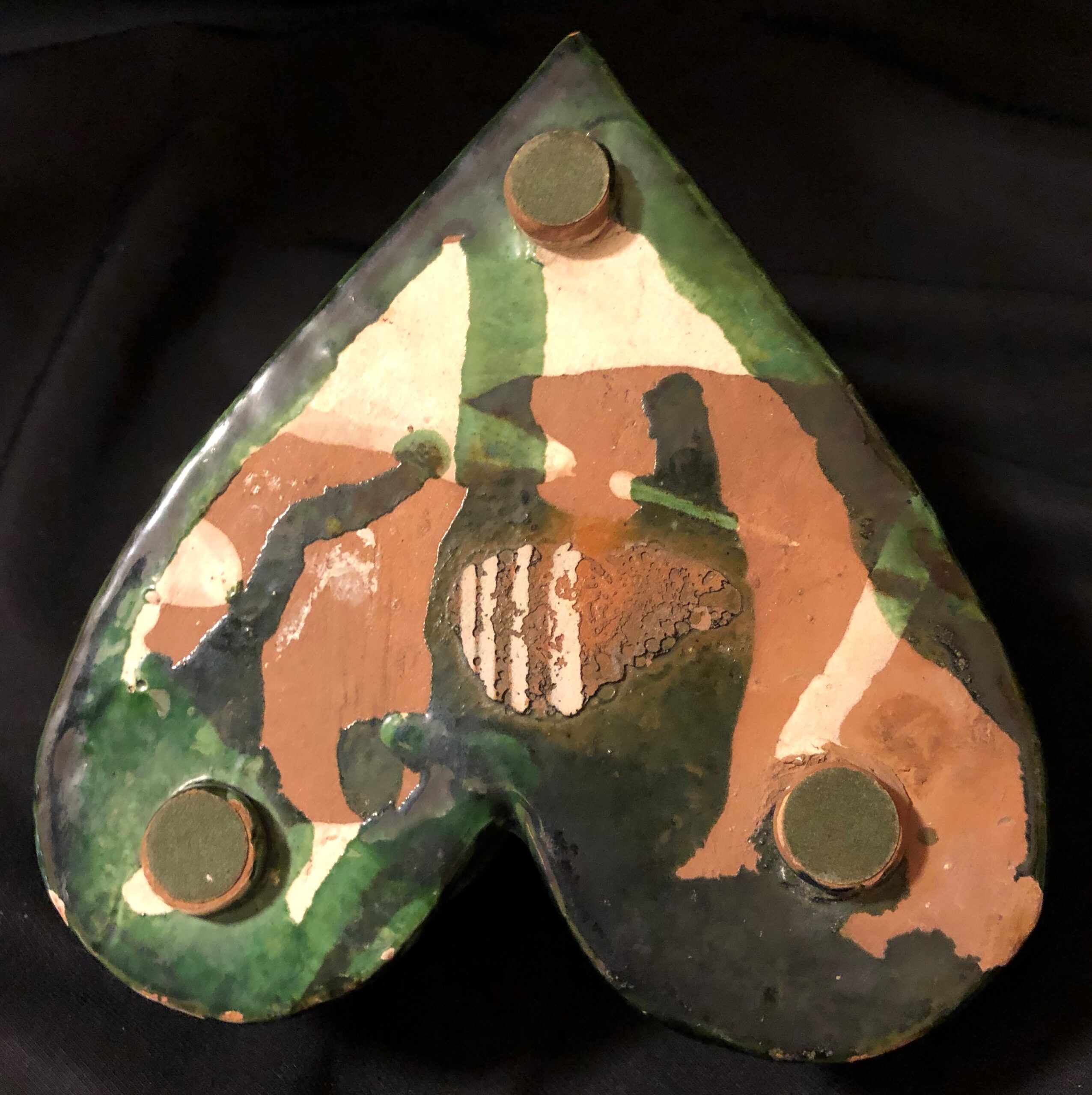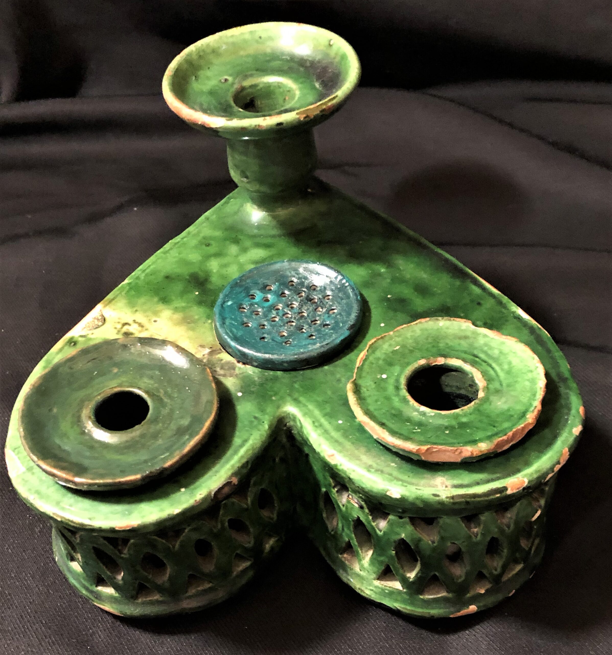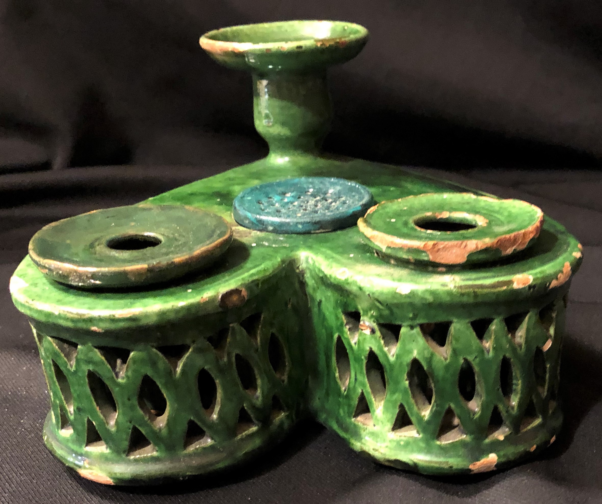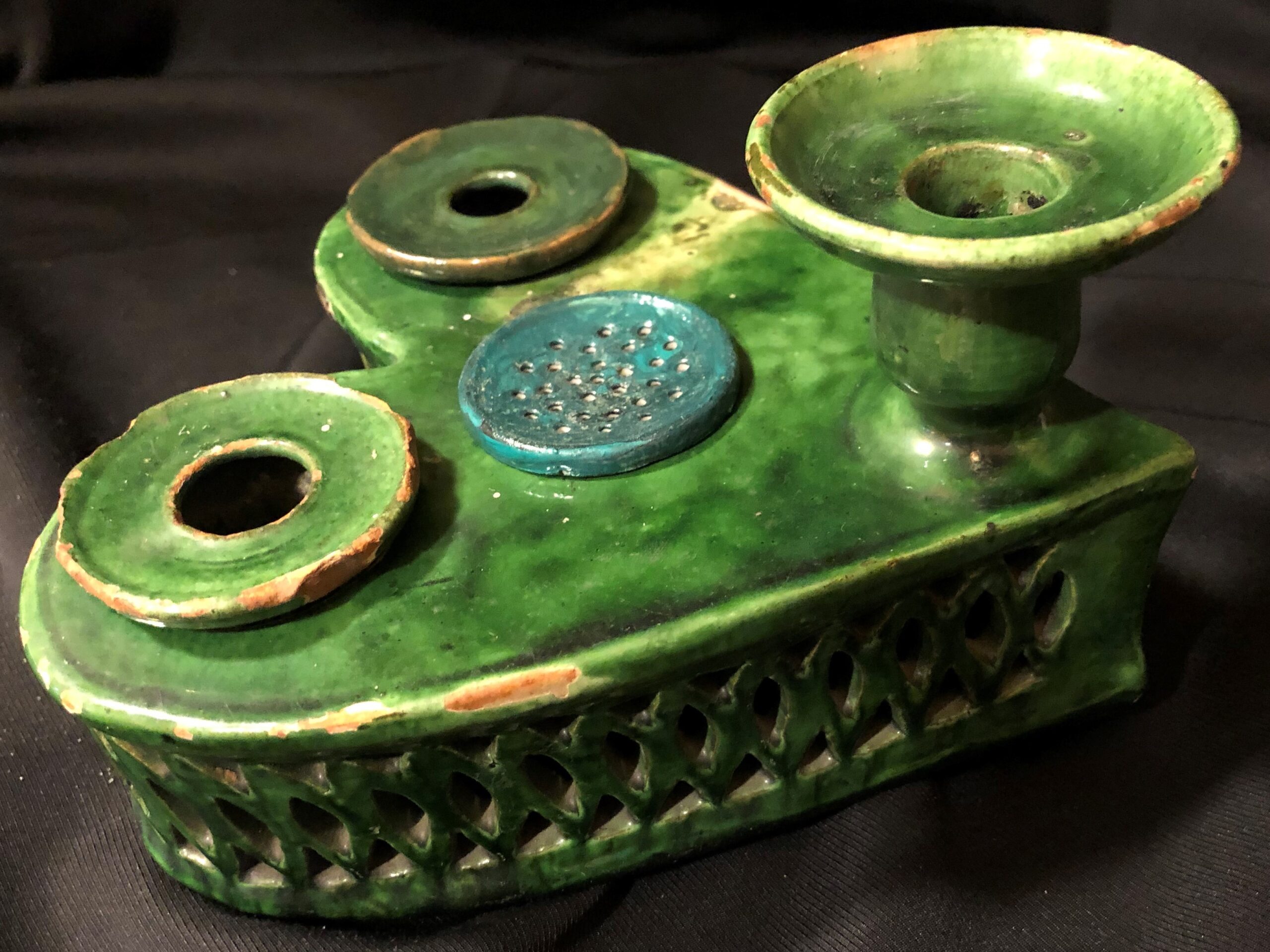 Green glazed earthenware inkstand in the shape of a heart, with candle holder, sander (not original), and two inkpots. Beautiful lattice work. No maker’s mark – attributed to American pottery. Many chips and much wear, this dates c. 1800 – 1850.