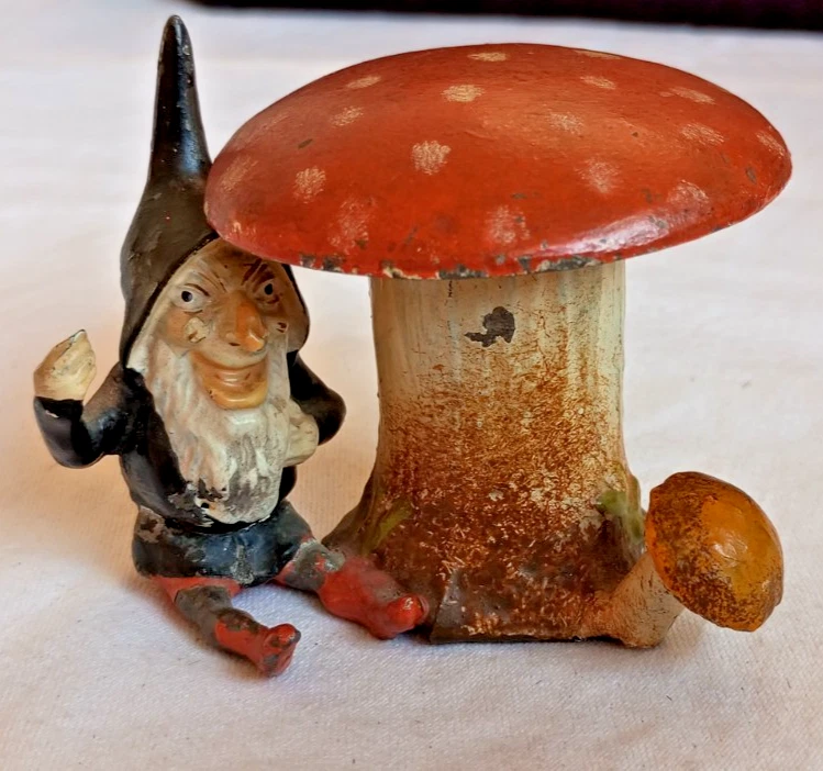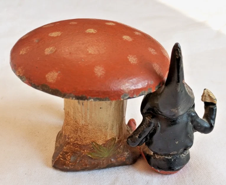 - Cold-Painted: The paint was applied to the metal after casting (without firing), which gives it a matte, naturalistic finish. This technique is prone to chipping over time, which explains the paint loss visible on the gnome’s hat and the mushroom cap – a common and expected sign of age for these pieces.