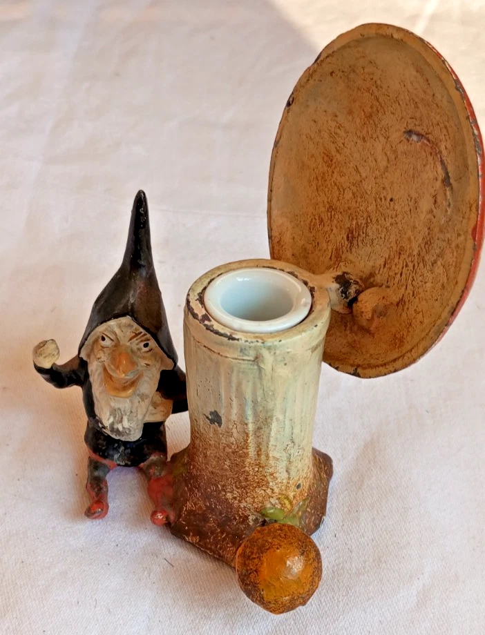 - The Figure: The inkwell features a charming, characterful gnome (or dwarf) seated at the base of a large toadstool. He is depicted in traditional folklore attire: a tall, pointed black cap, a white beard, a dark tunic, and red leggings. His right hand is raised in a friendly waving or conversational gesture, giving the piece a lively, animated quality.