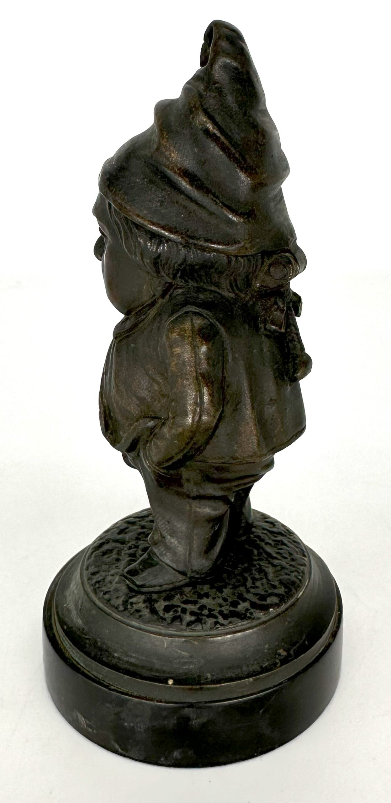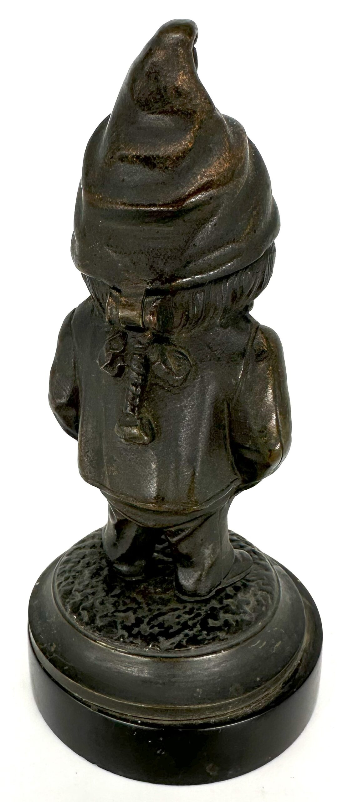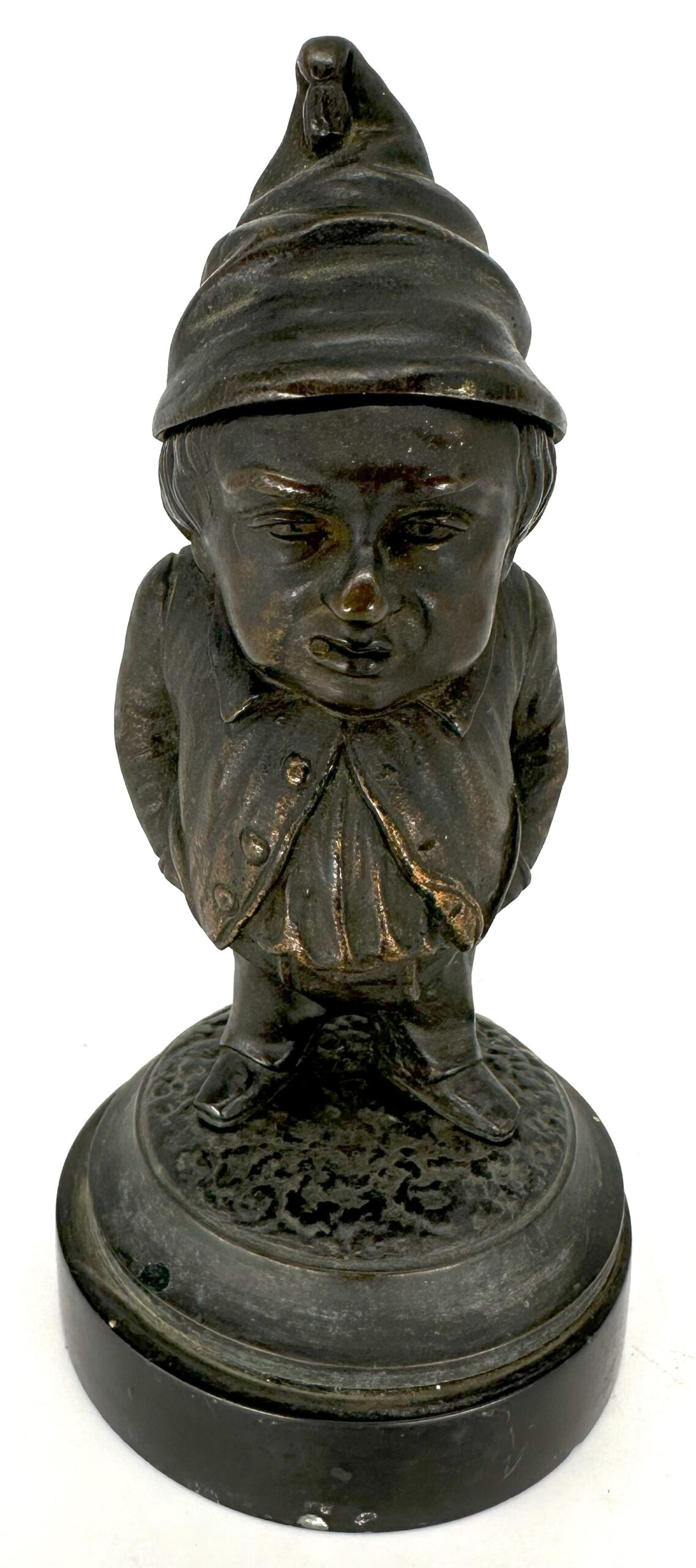 A bronze inkwell in the form of a gnome (or elf) with a stocking cap standing, waiting with his hands stuffed in his pockets. He stands on a circular black stone base.