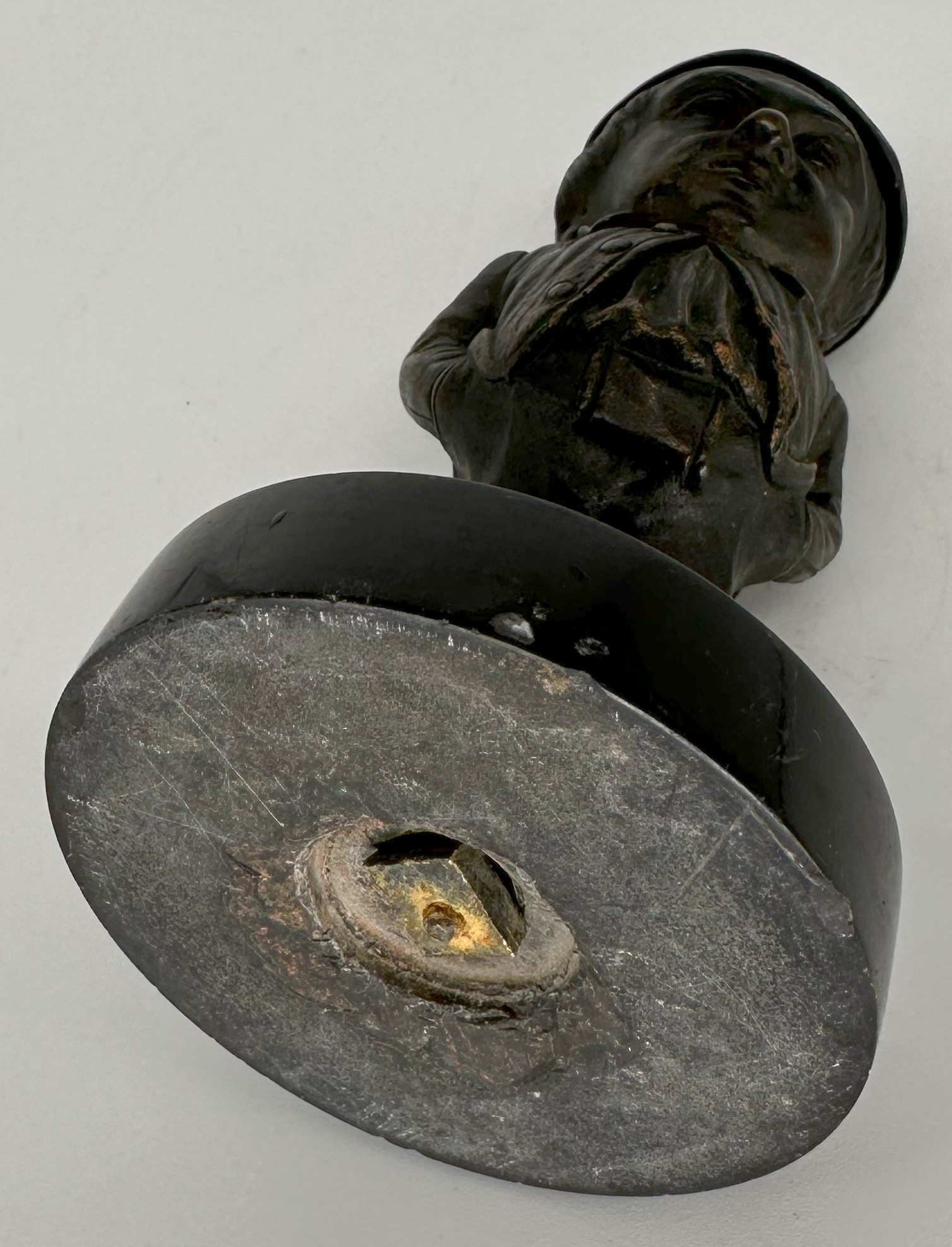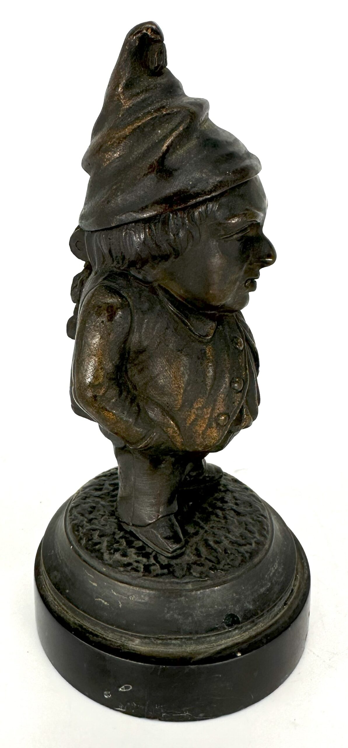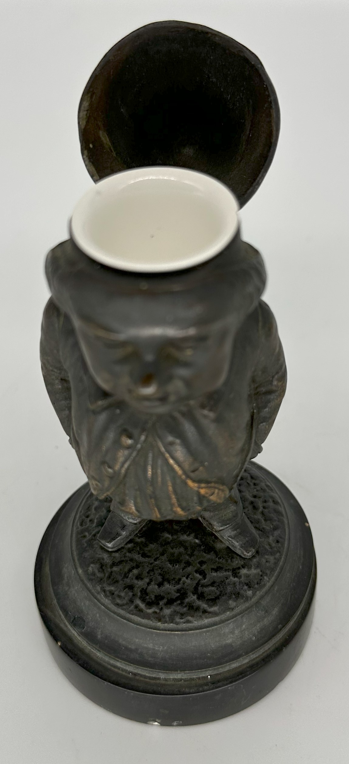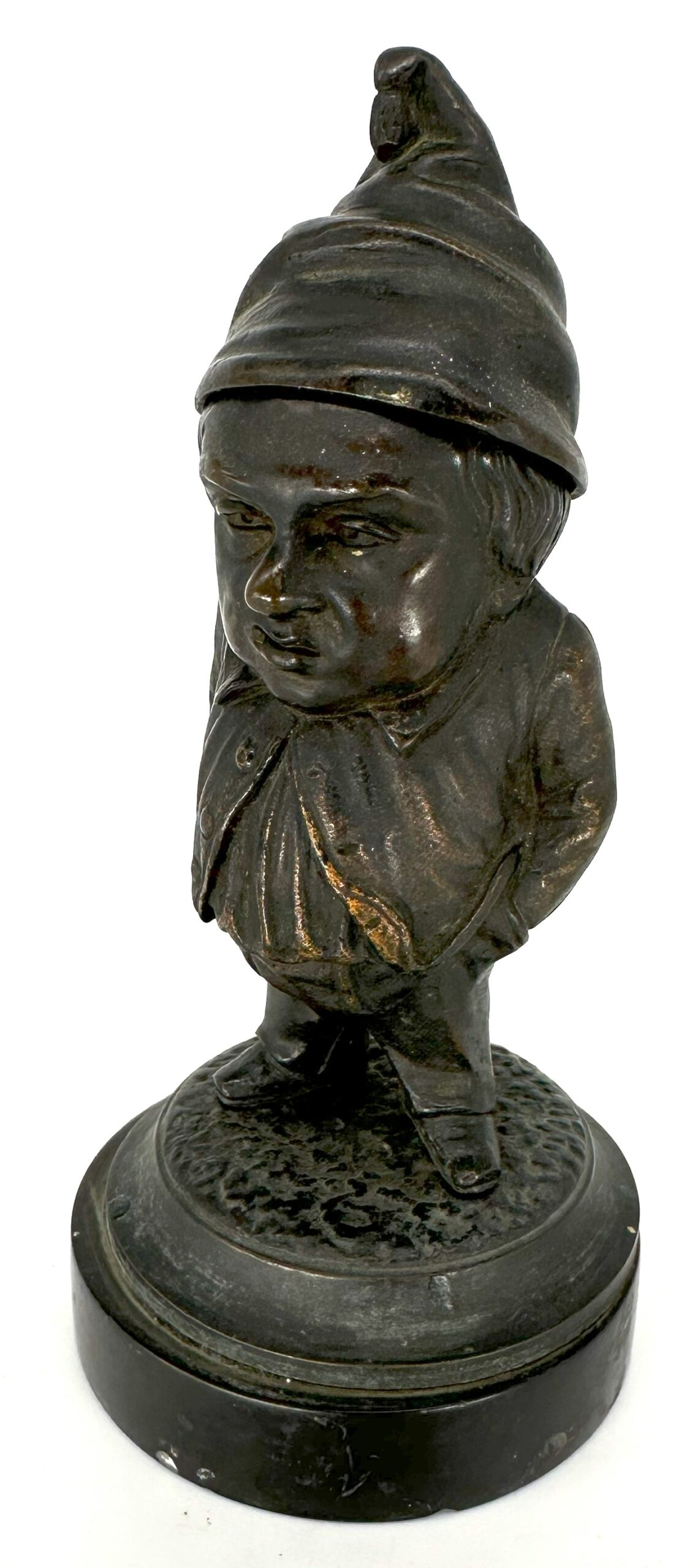 A bronze inkwell in the form of a gnome (or elf) with a stocking cap standing, waiting with his hands stuffed in his pockets. He stands on a circular black stone base.