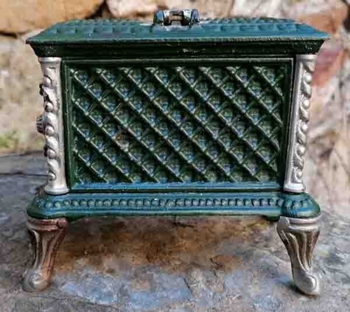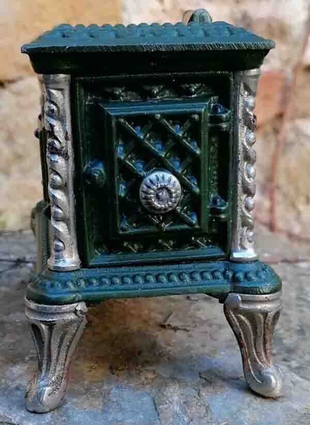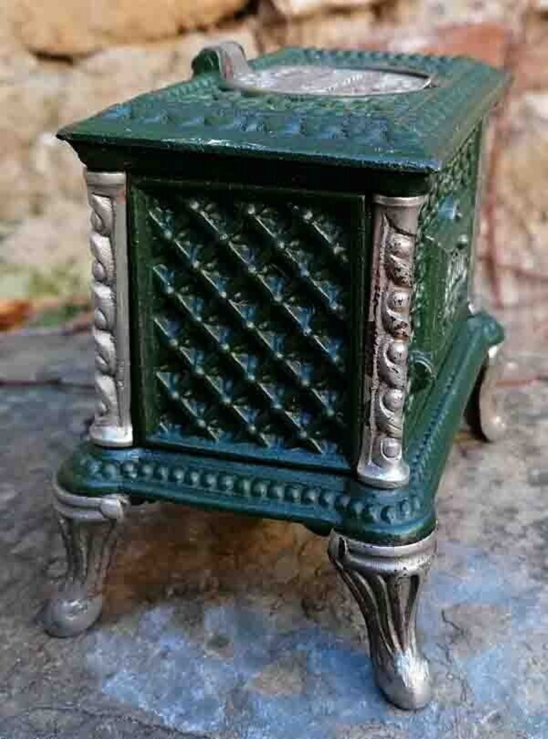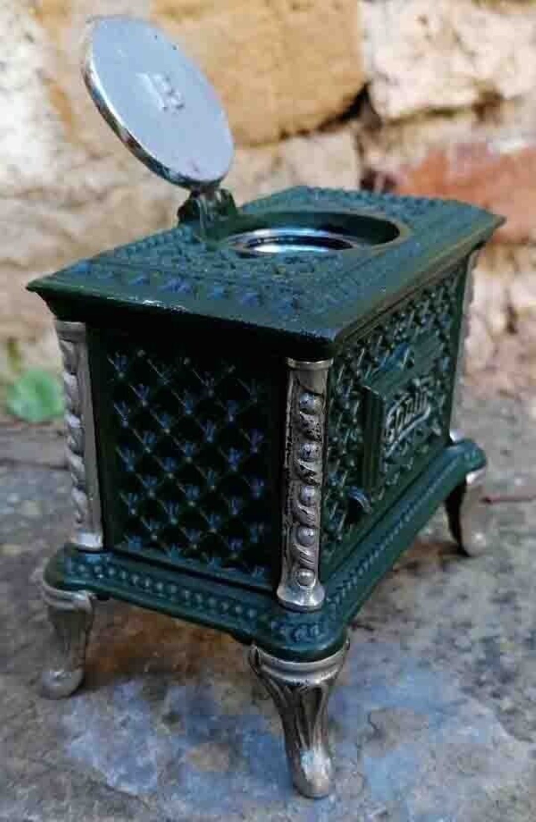 Well-cast and detailed enameled cast iron figural inkstand in the shape of a Godin woodburning stove with lattice design. On the front it reads “GODIN” and “CHAUFFETTE” (small stove) on the hinged inkwell cover. The stove is stamped “15” on the base and inside the hinged lid.