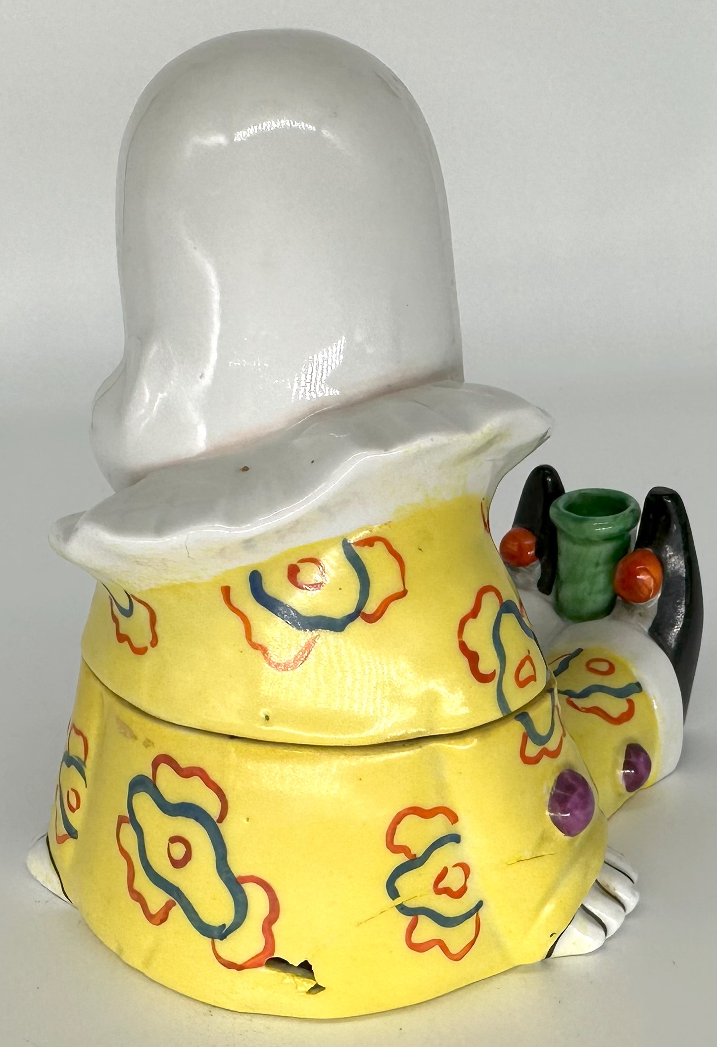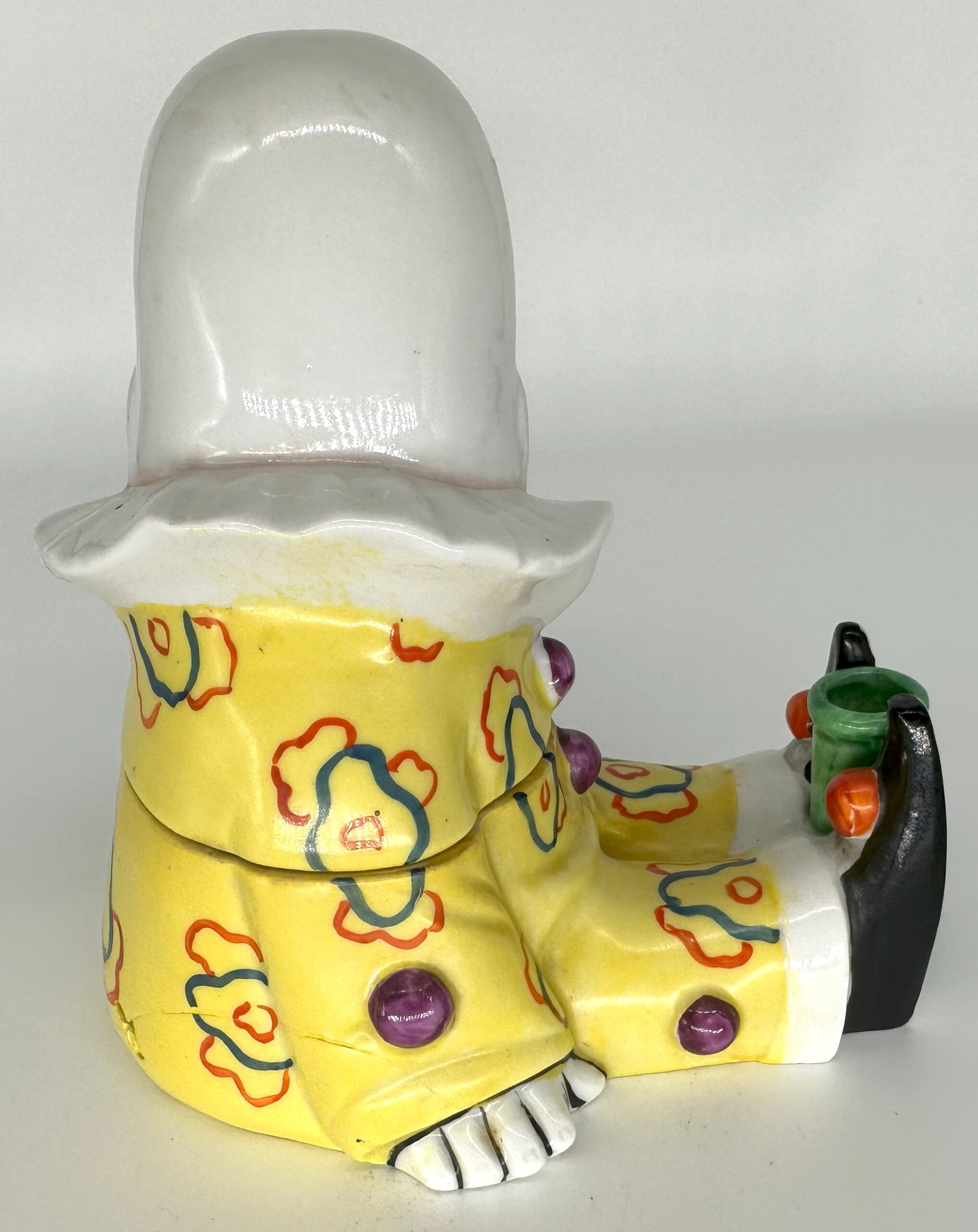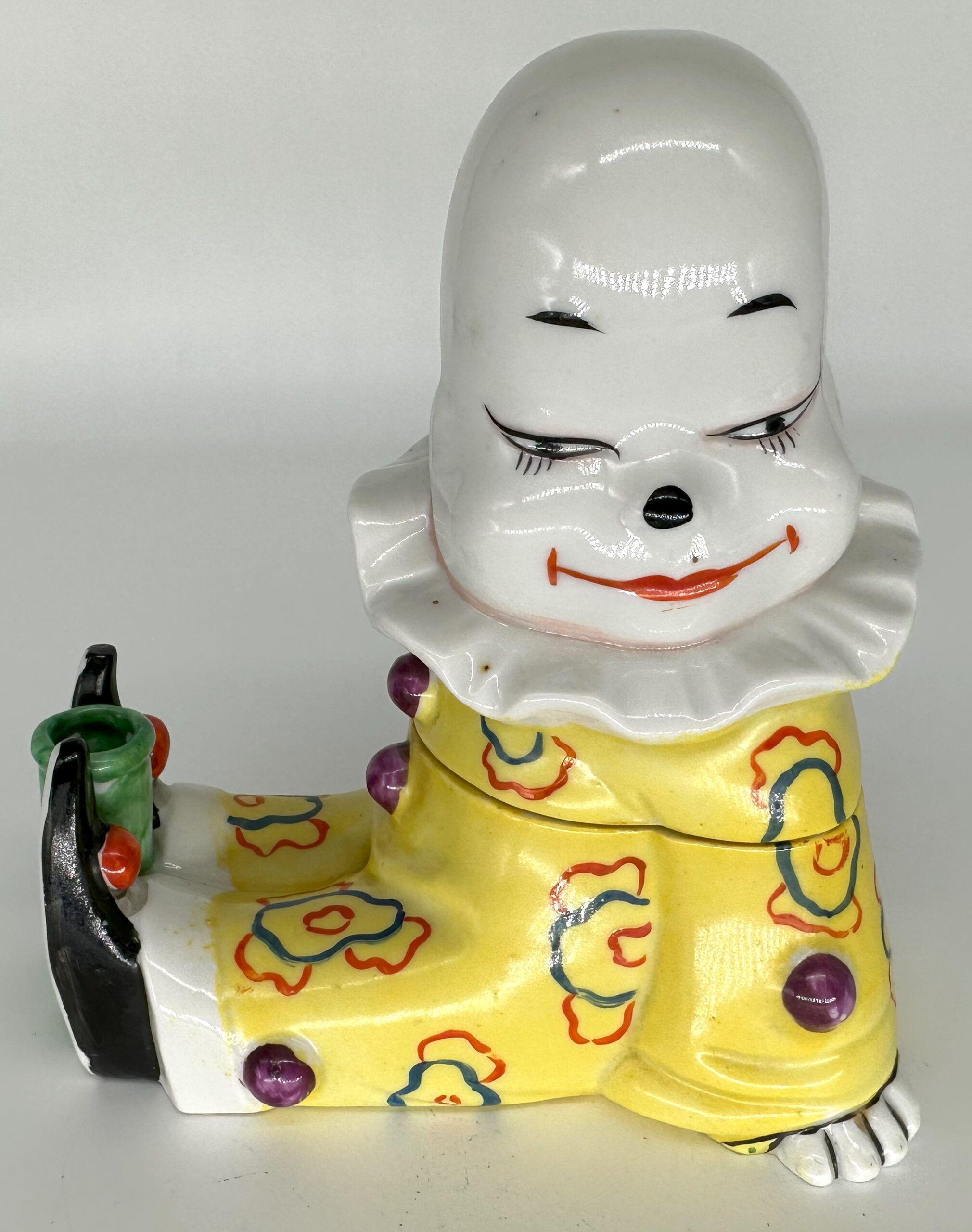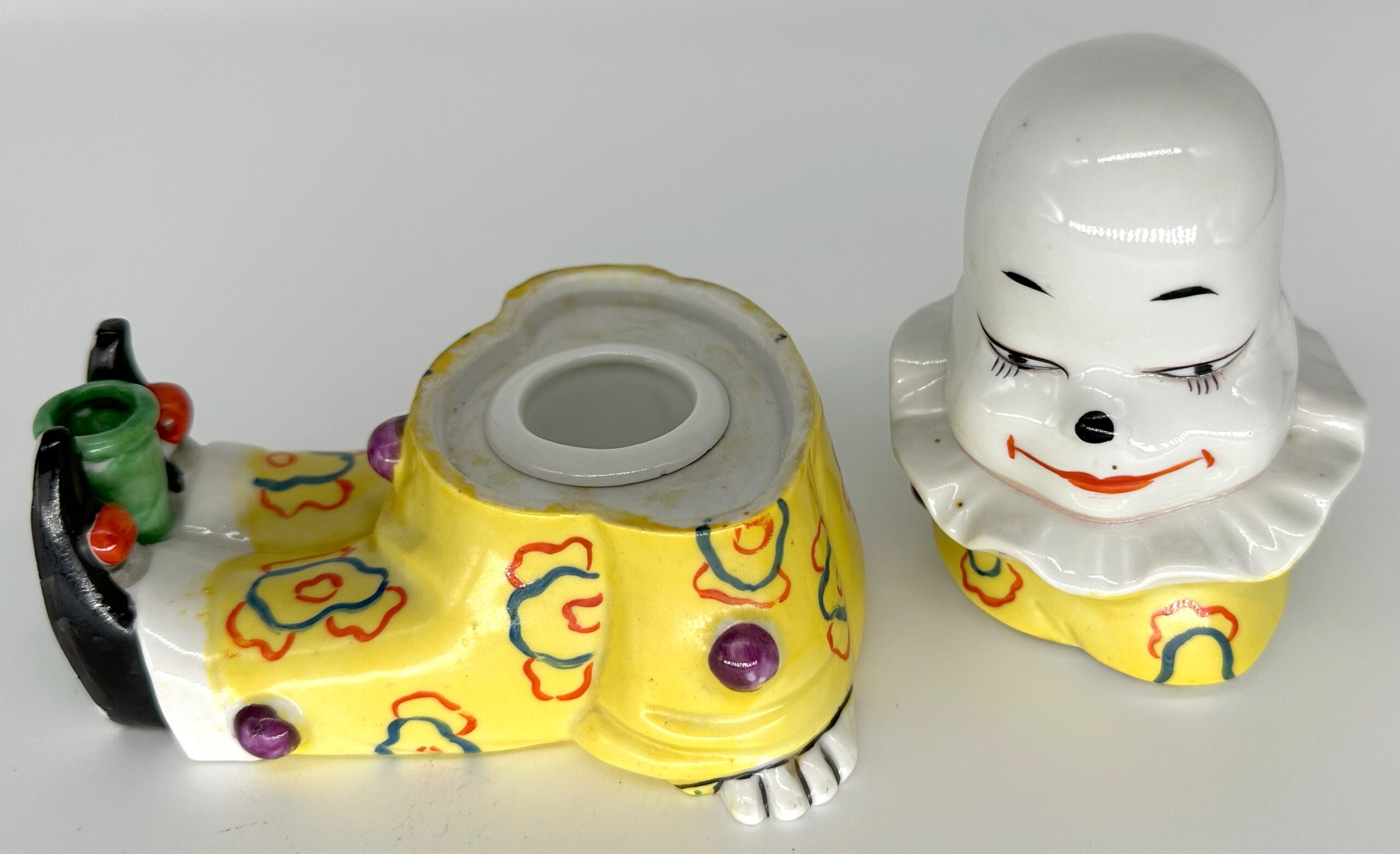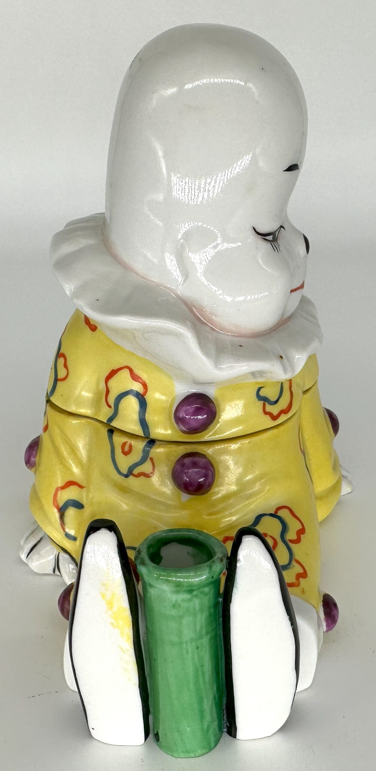 A whimsical hand painted clown, attired in a bright yellow suit with floral markings and pom-poms, sits smiling. There is a green pen holder sandwiched between his black shoes, each with a red pom-pom. The clown’s head lifts off to access the inkwell.