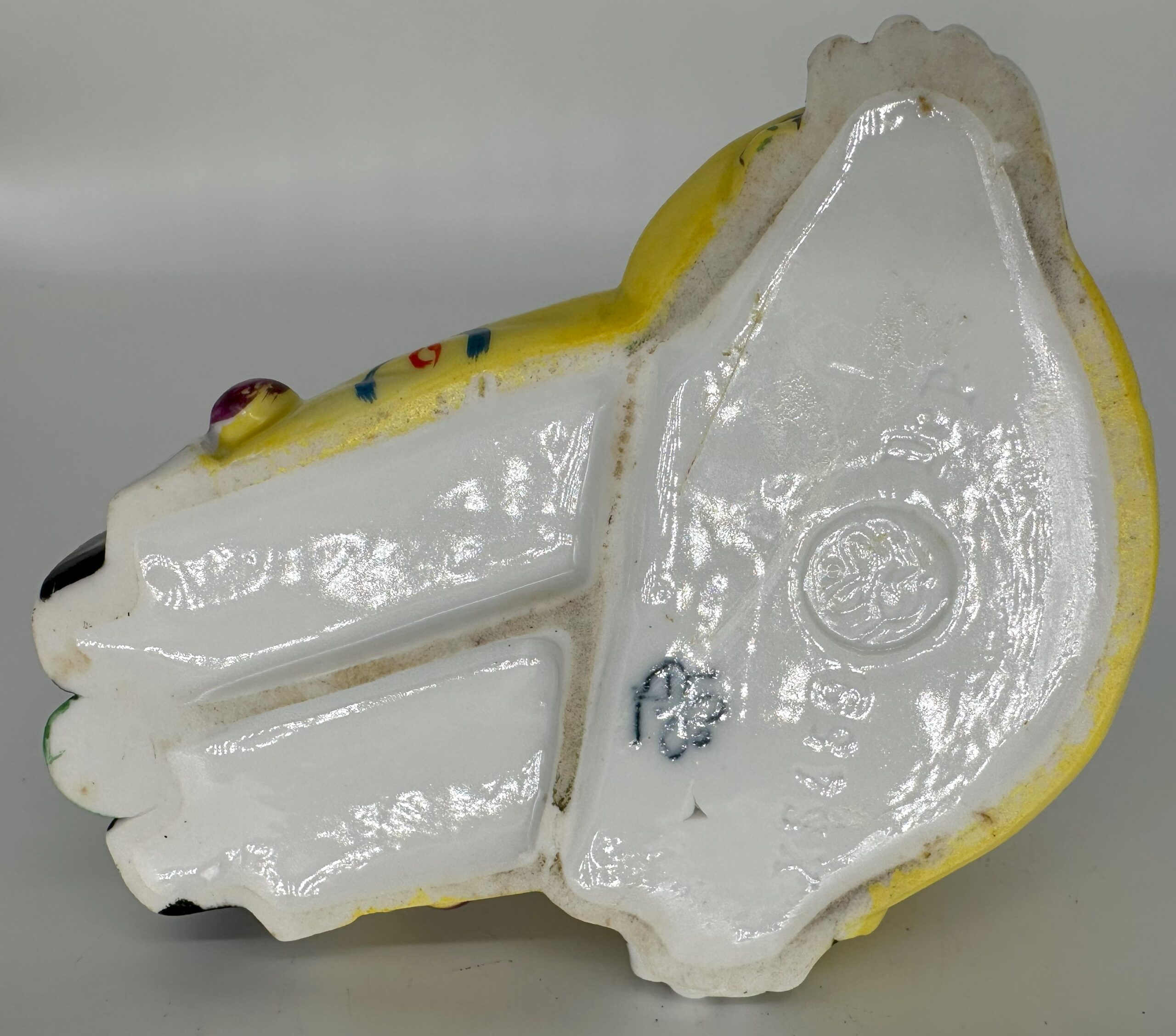The piece bears the crown mark of the Goebel company in Germany, both on the base and under the clown’s head (double crown). There is also a blue stamp crown mark, DEP and XS459 incised on the bottom base. The inkwell dates from 1923 – 1949.